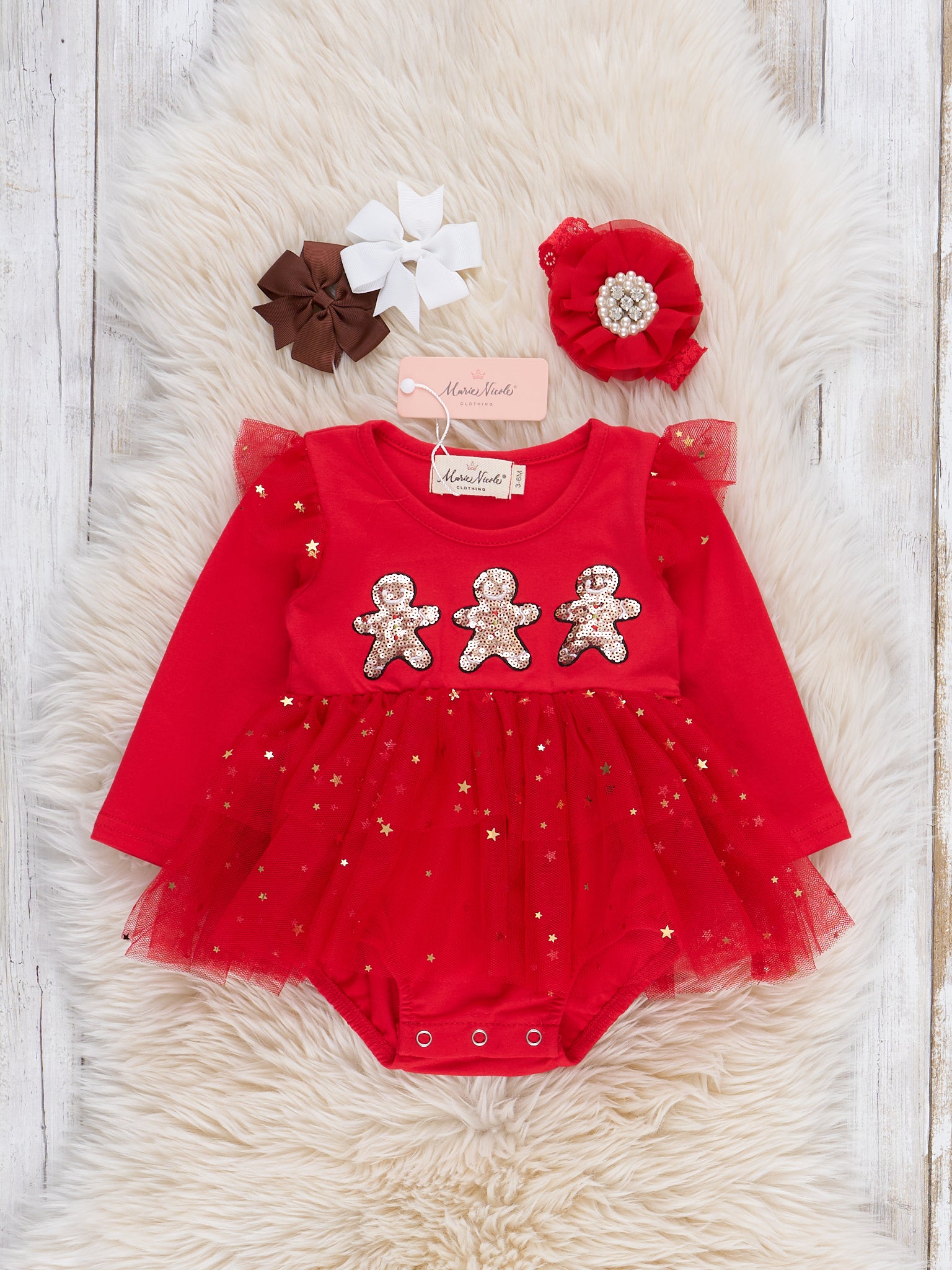 The Gingerbread Sparkle Embroidered Tulle Romper from Marie Nicole Clothing is a festive holiday piece featuring adorable gingerbread motifs, decorative buttons, and playful sparkle detailing on the skirt. With its comfortable fit and faux apron-inspired bodice, this romper is ideal for seasonal celebrations, holiday photos, or days filled with joyful family fun.