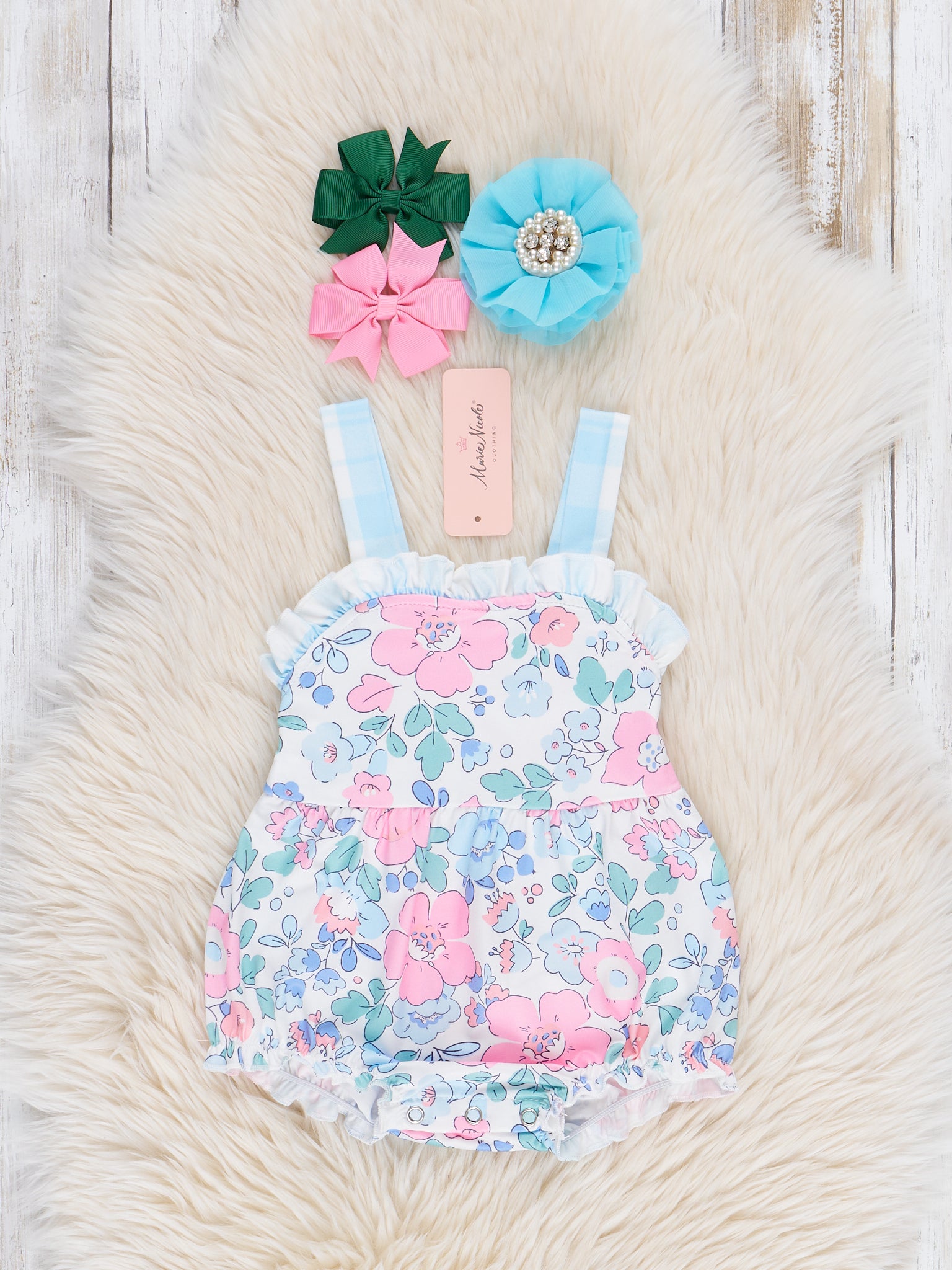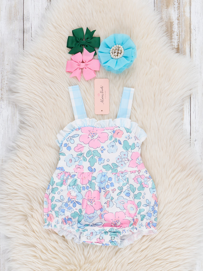 Get ready for some cuteness overload with our Pink & Blue Gingham Floral Ruffle Bubble! Featuring a charming blue gingham pattern and beautiful florals, this bubble is perfect for your little one's spring playdate or special occasion. Add a touch of fun to their wardrobe now with the full sister set.