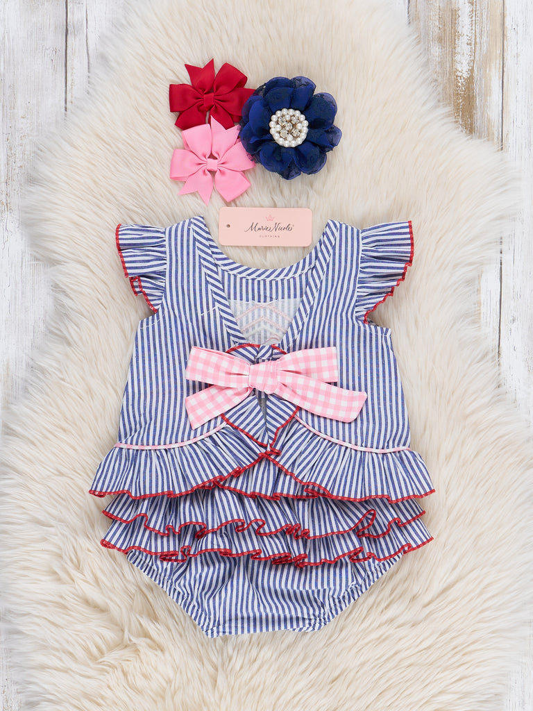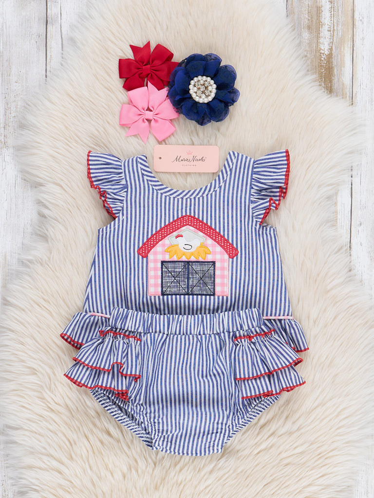 Get your little one ready for some fun on the farm with our Striped Embroidered Barn Bloomers Outfit! This adorable set includes navy blue striped top with a red ruffle trim, featuring an embroidered barn design. The matching bloomers with a red ruffle trim on the ruffle bottom make it the perfect addition to this sister set from Marie Nicole Clothing.