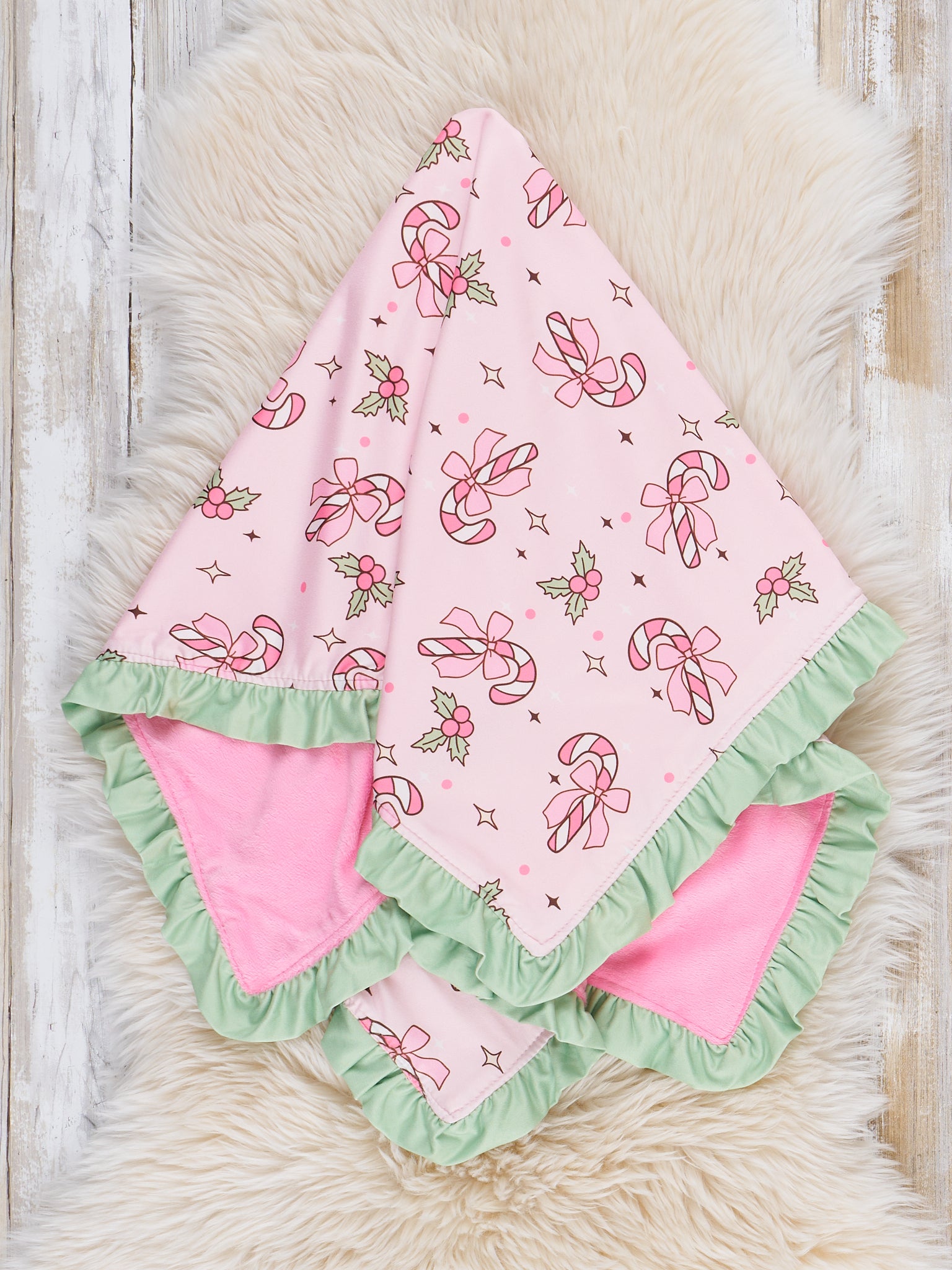 Candy Cane Snuggle Blanket by Marie Nicole Clothing. This blanket features a playful candy cane print with a soft pink background, finished with a ruffled mint trim for added charm. Designed for cozy cuddles, it’s perfect for holiday snuggling, nap time, or as a festive accent in a nursery.