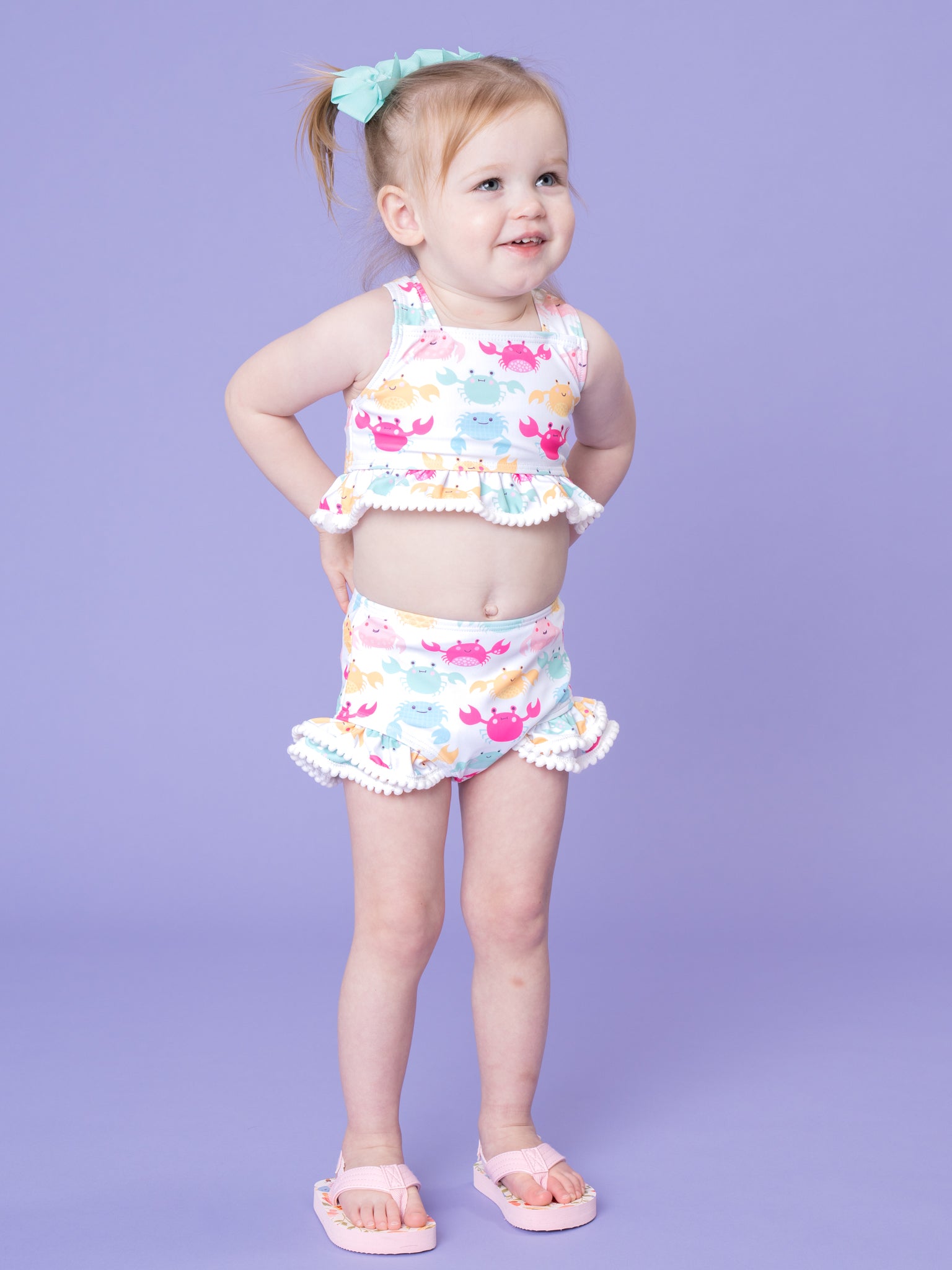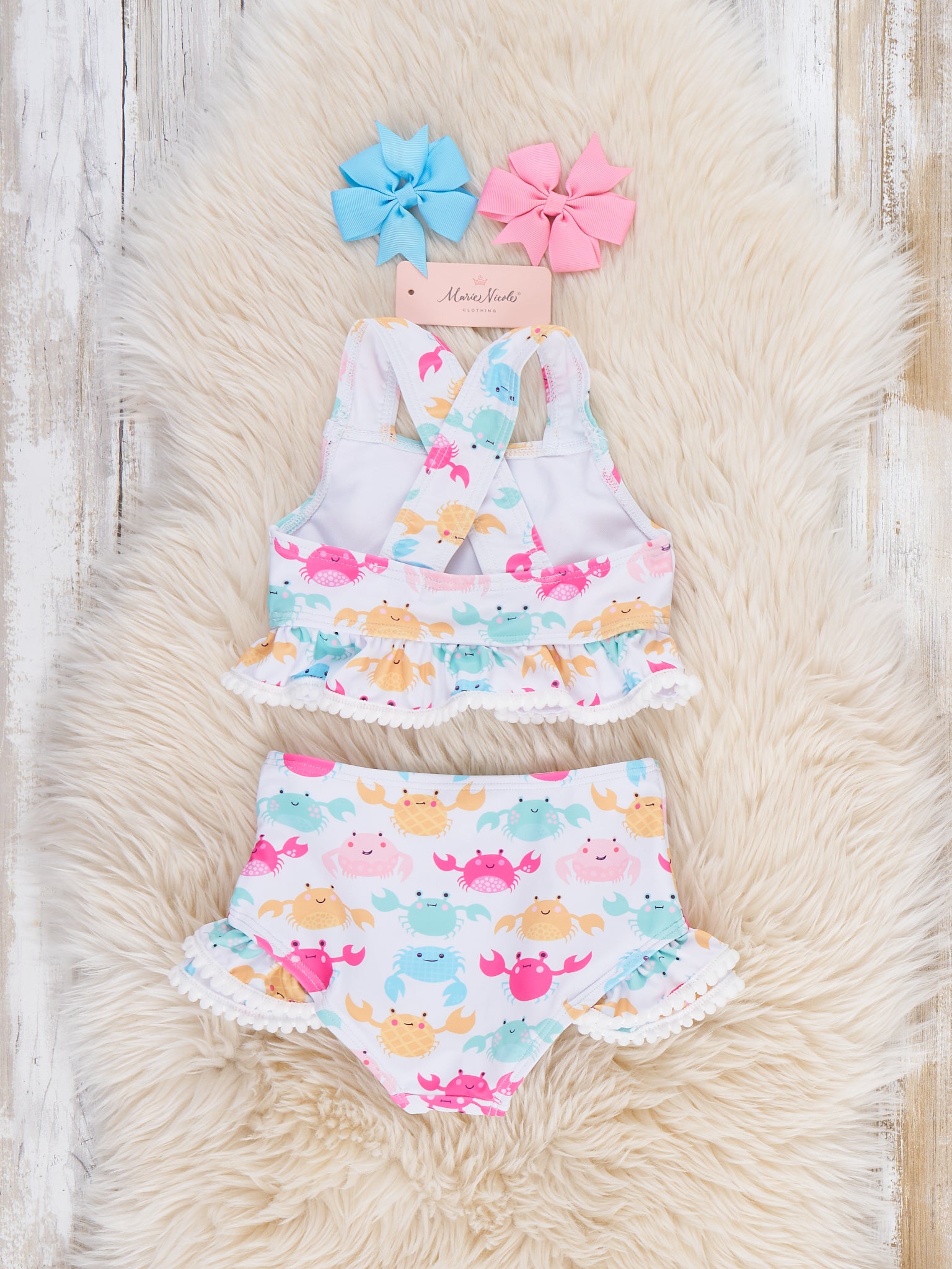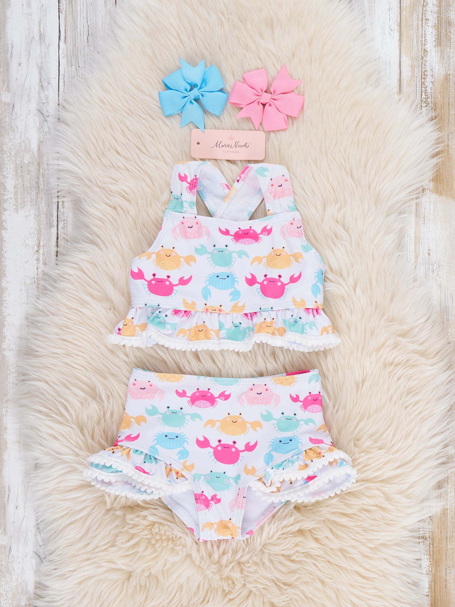 Happy Crabby Ruffle Swimsuit by Marie Nicole Clothing is a playful two-piece set featuring a peplum halter-style top and coordinating high-waist bottoms with layered ruffles trimmed in pom-poms. The cheerful crab print and soft, stretchy fabric make it a fun, comfortable choice for beach days, pool parties, and summer vacations.