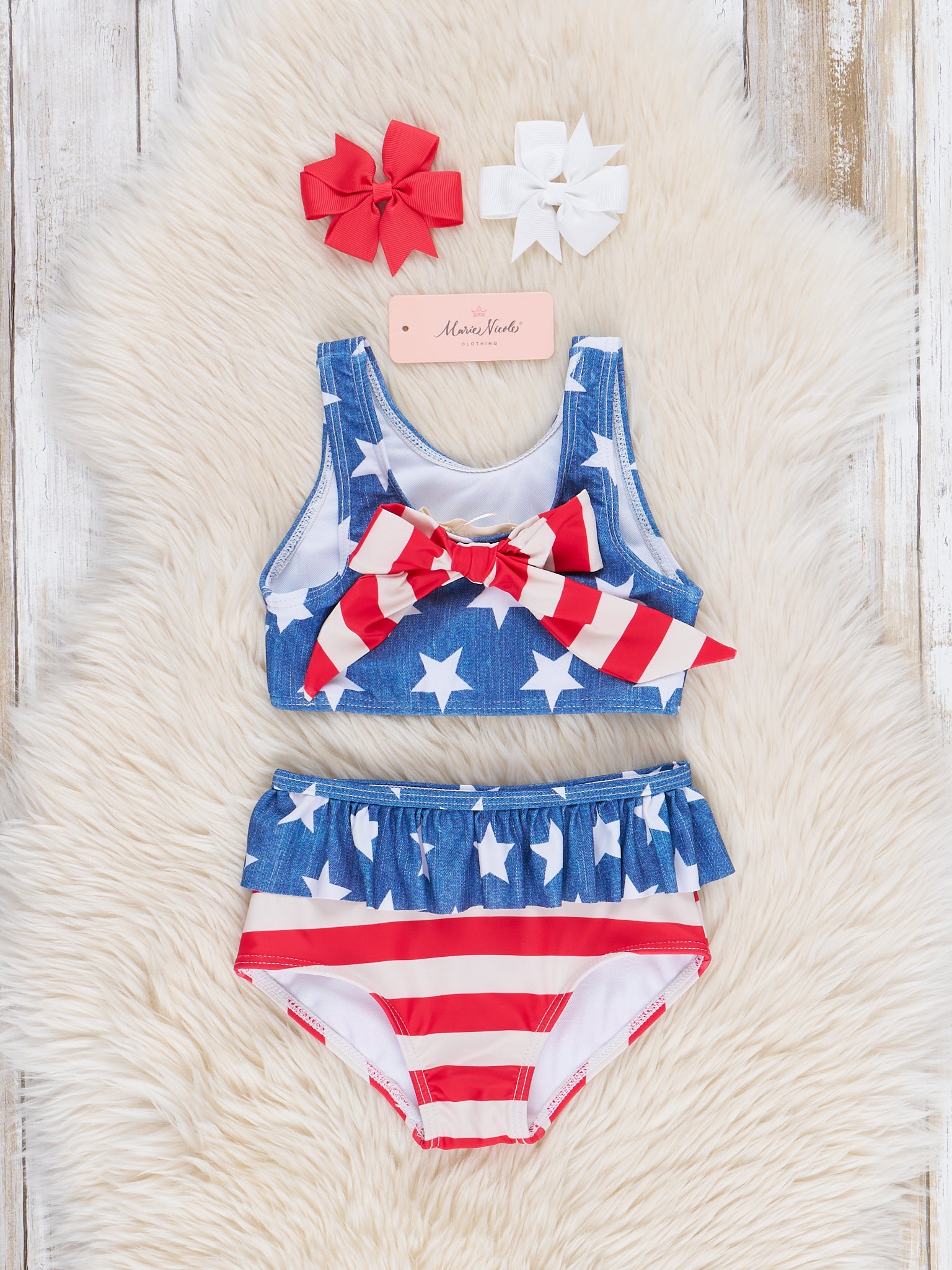 Make a splash this summer with our Stars Stripes Ruffle Swimsuit! This two-piece suit features a fun blue star print top and bold red striped bottoms with a blue star peplum detail. Perfect for the pool or beach, this swimsuit is both patriotic and stylish. From Marie Nicole Clothing.