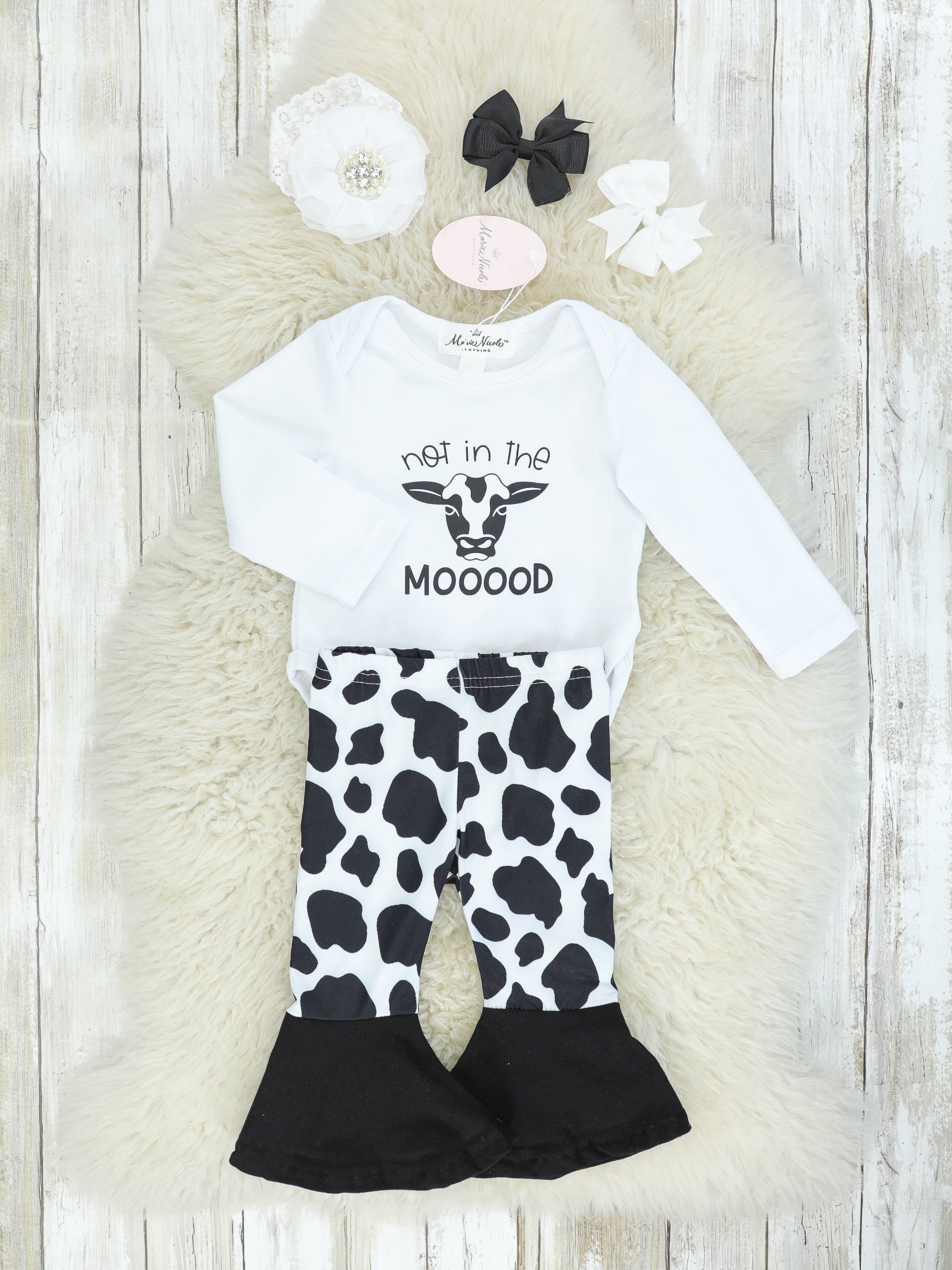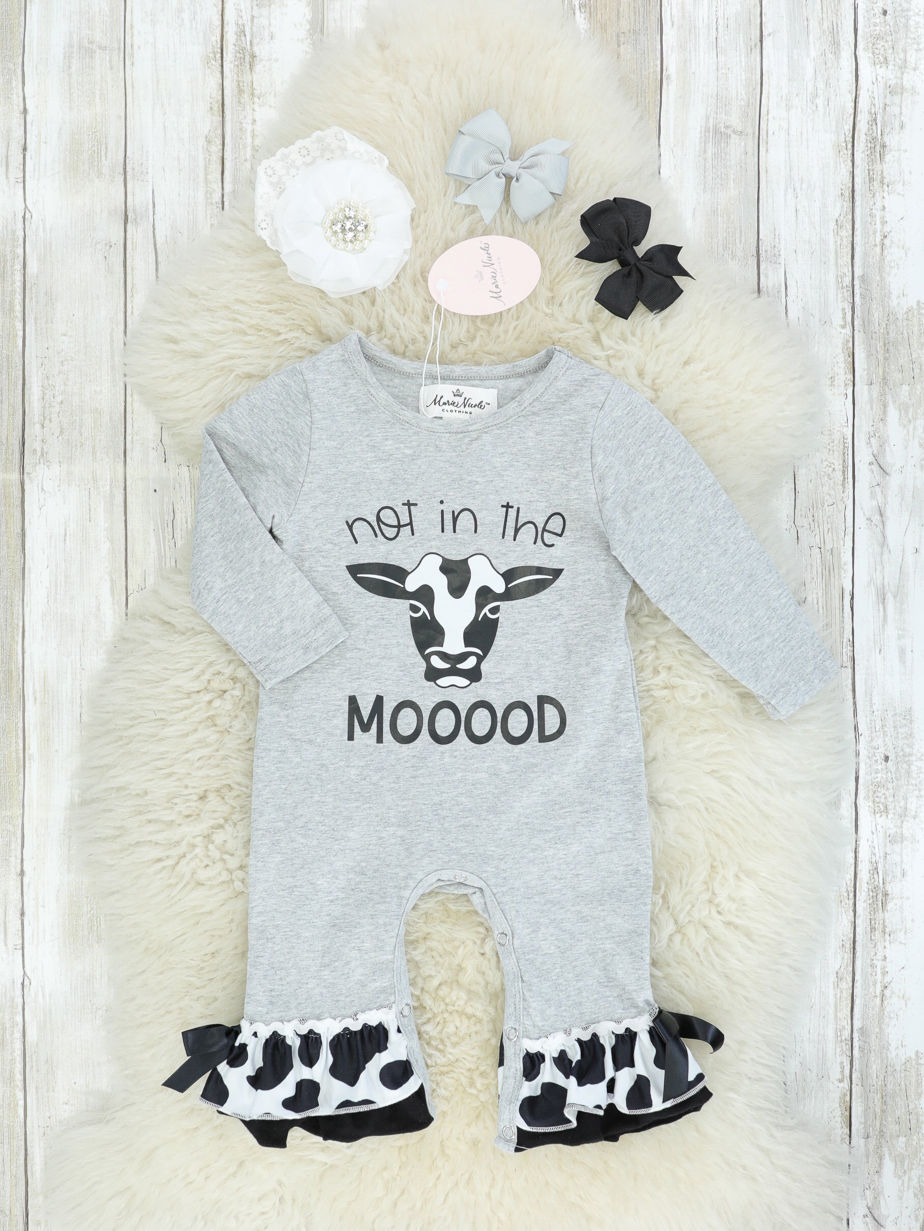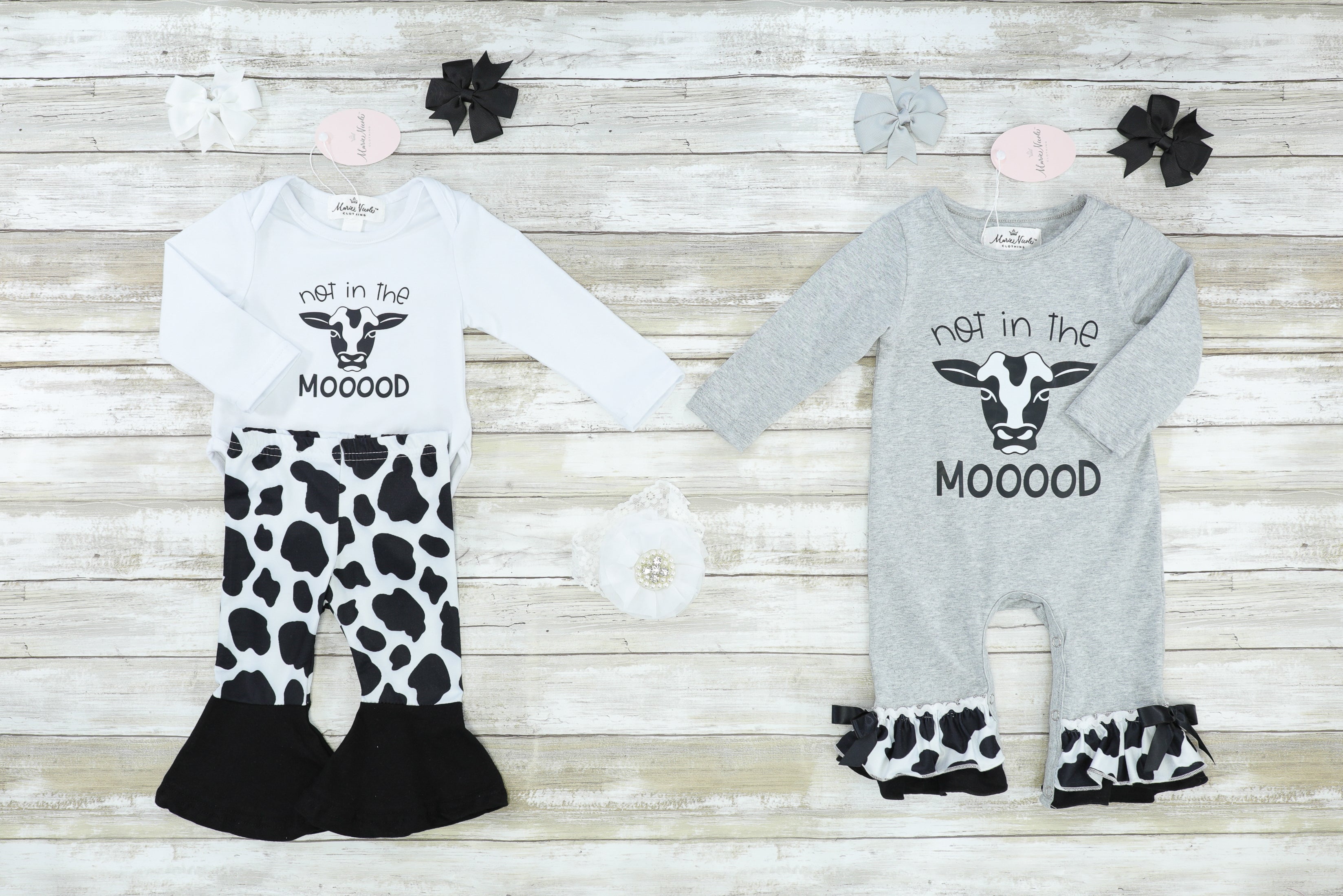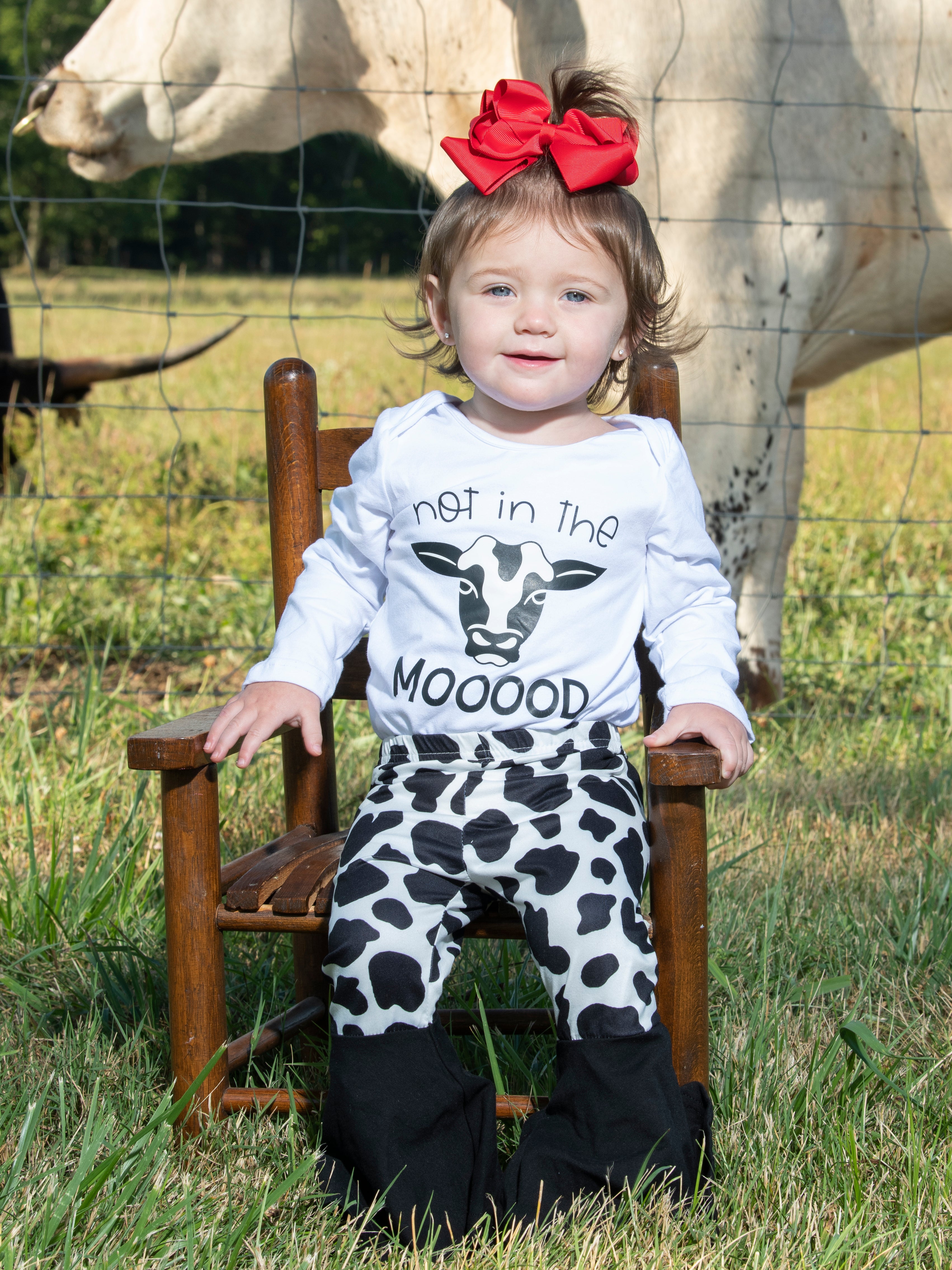 Fuchsia "Not In The MOOOOD" Ruffle Romper & Cow Print Bell Bottoms Outfit