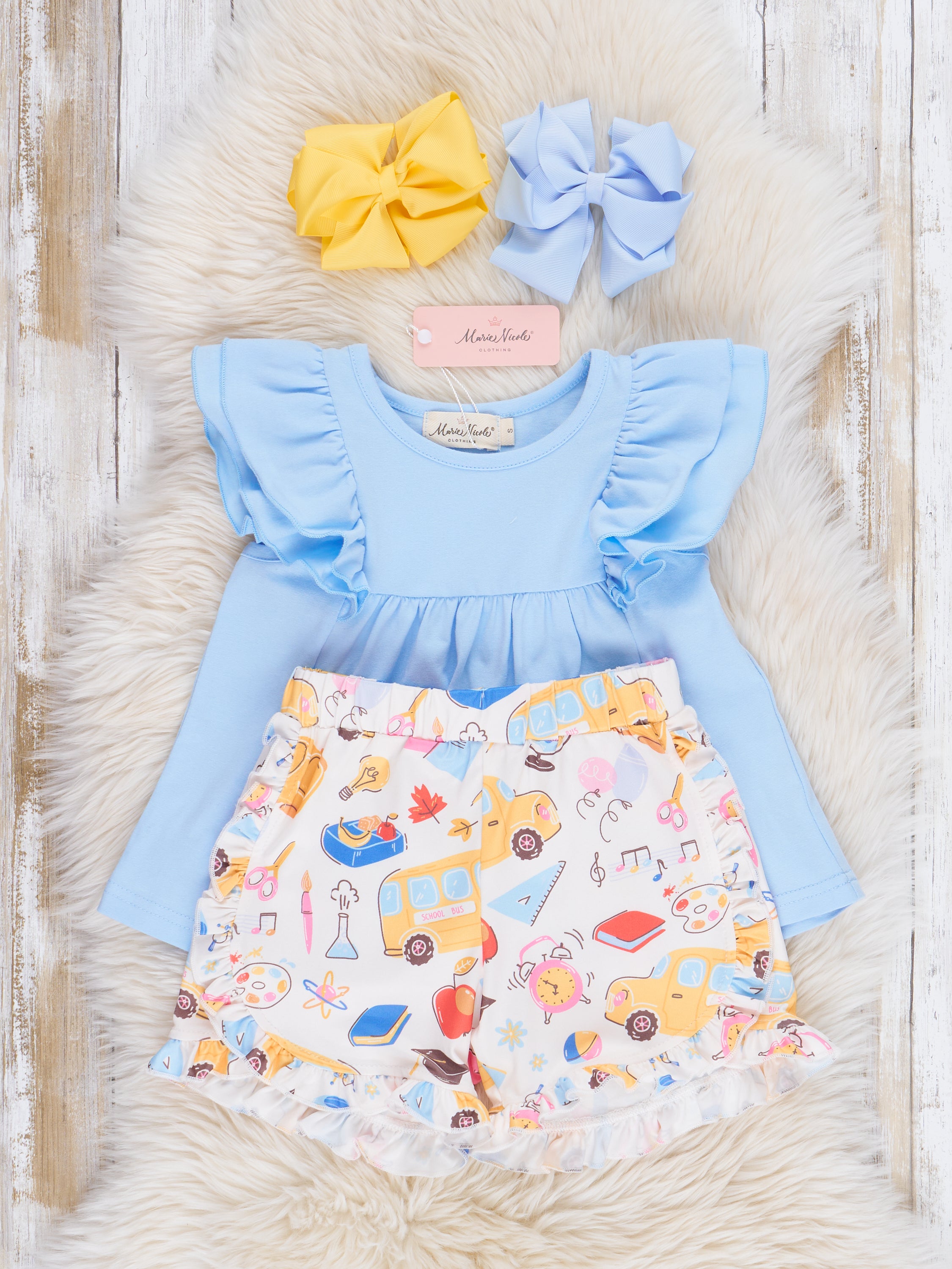 Get ready to head back to school in style with our Back to School Doodles Ruffle Outfit! This cute and fun outfit for girls includes a blue ruffle swing top and printed ruffle shorts featuring doodles related to school. Perfect for the playful and quirky student in your life!