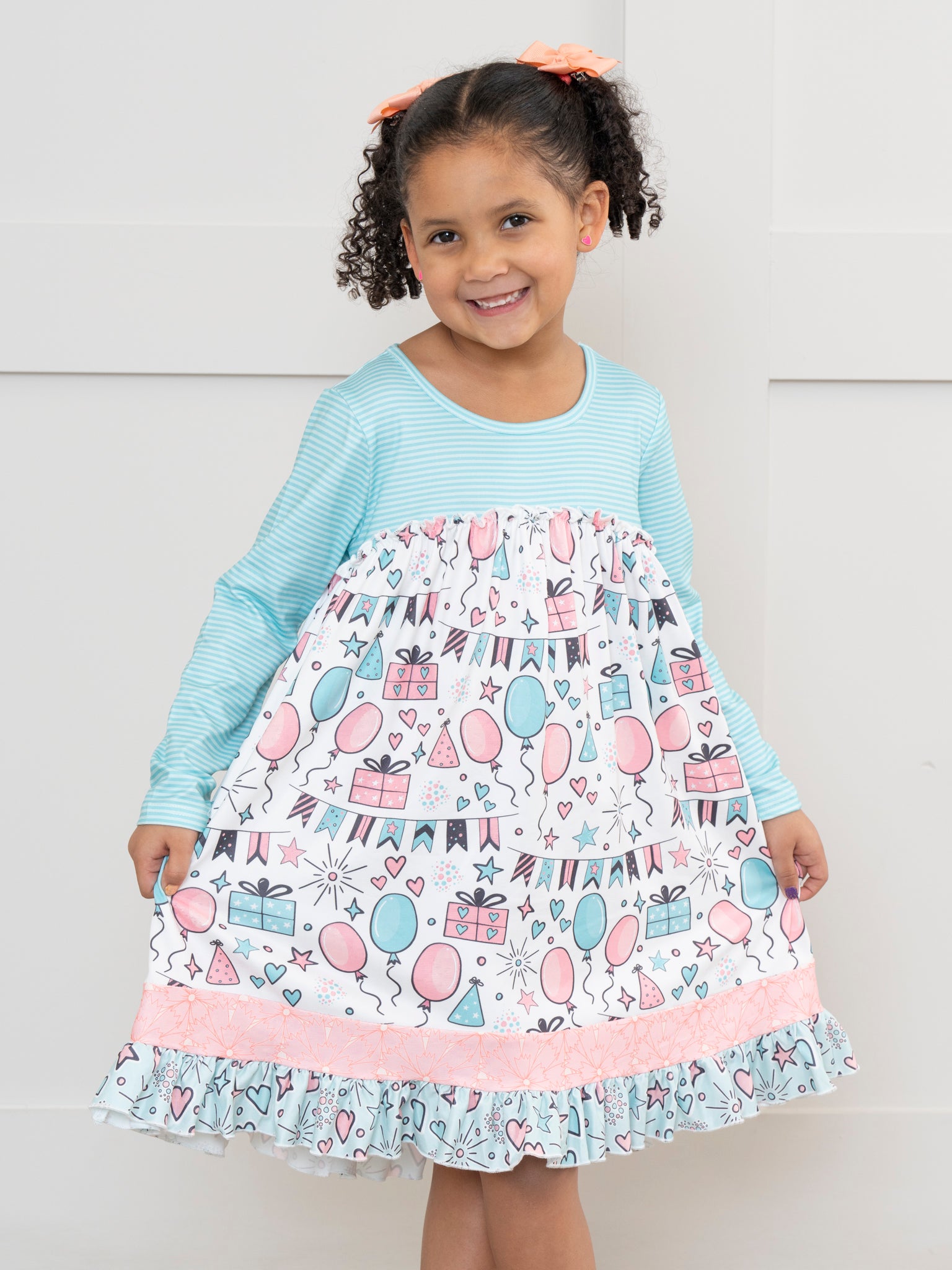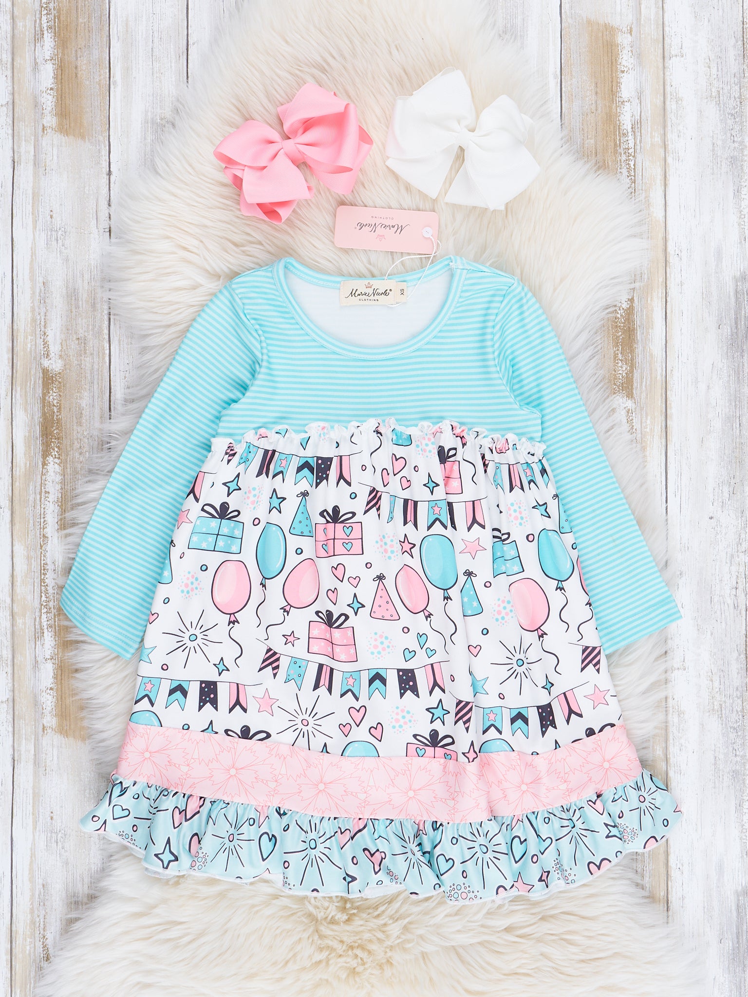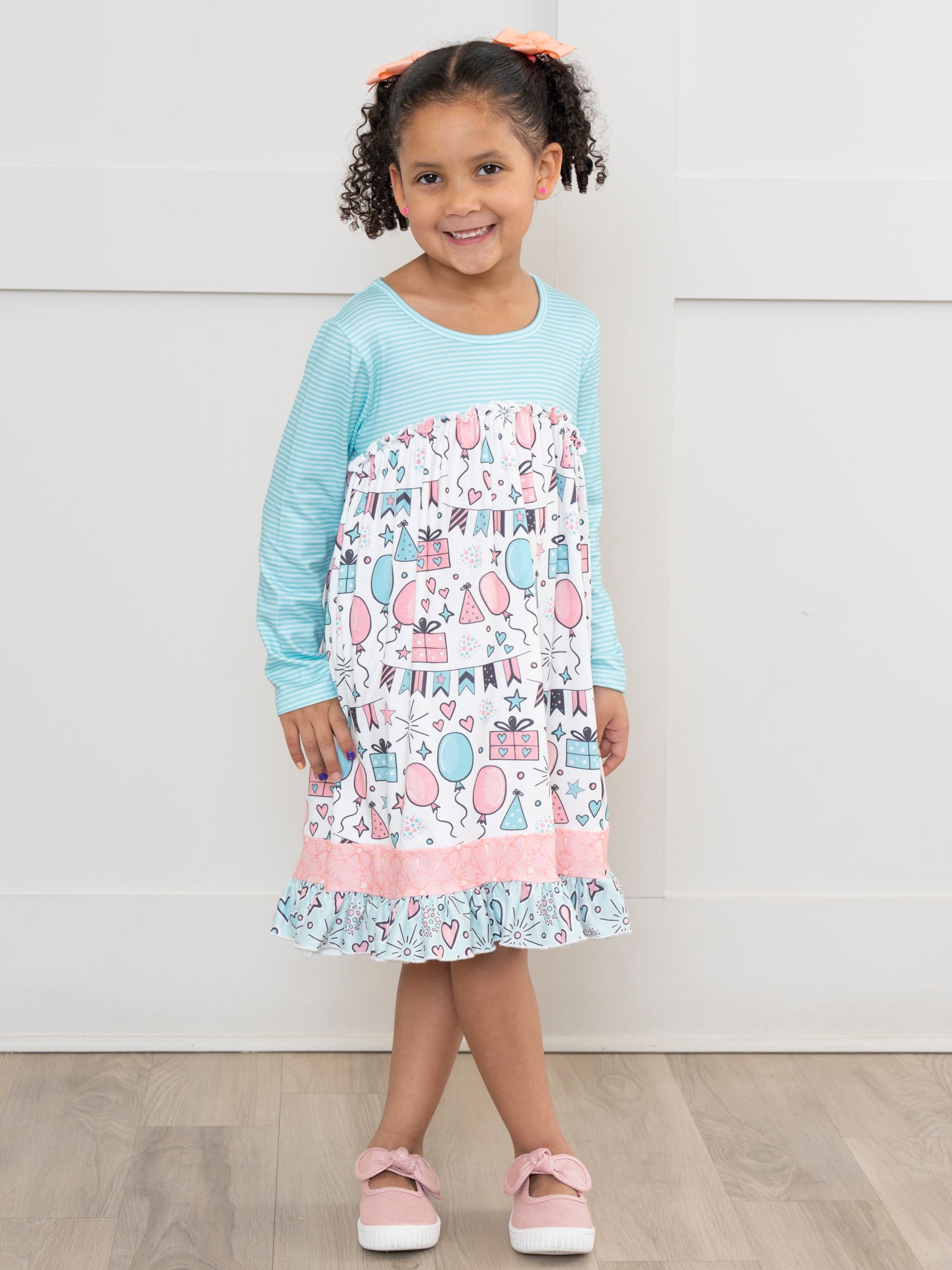 Get ready to party with the Birthday Party Stripes Ruffle Dress by Marie Nicole Clothing! This teal dress features stylish stripes and playful ruffles, making it perfect to celebrate any occasion. 🎉 Get ready to turn heads and dance the night away in this must-have party dress!