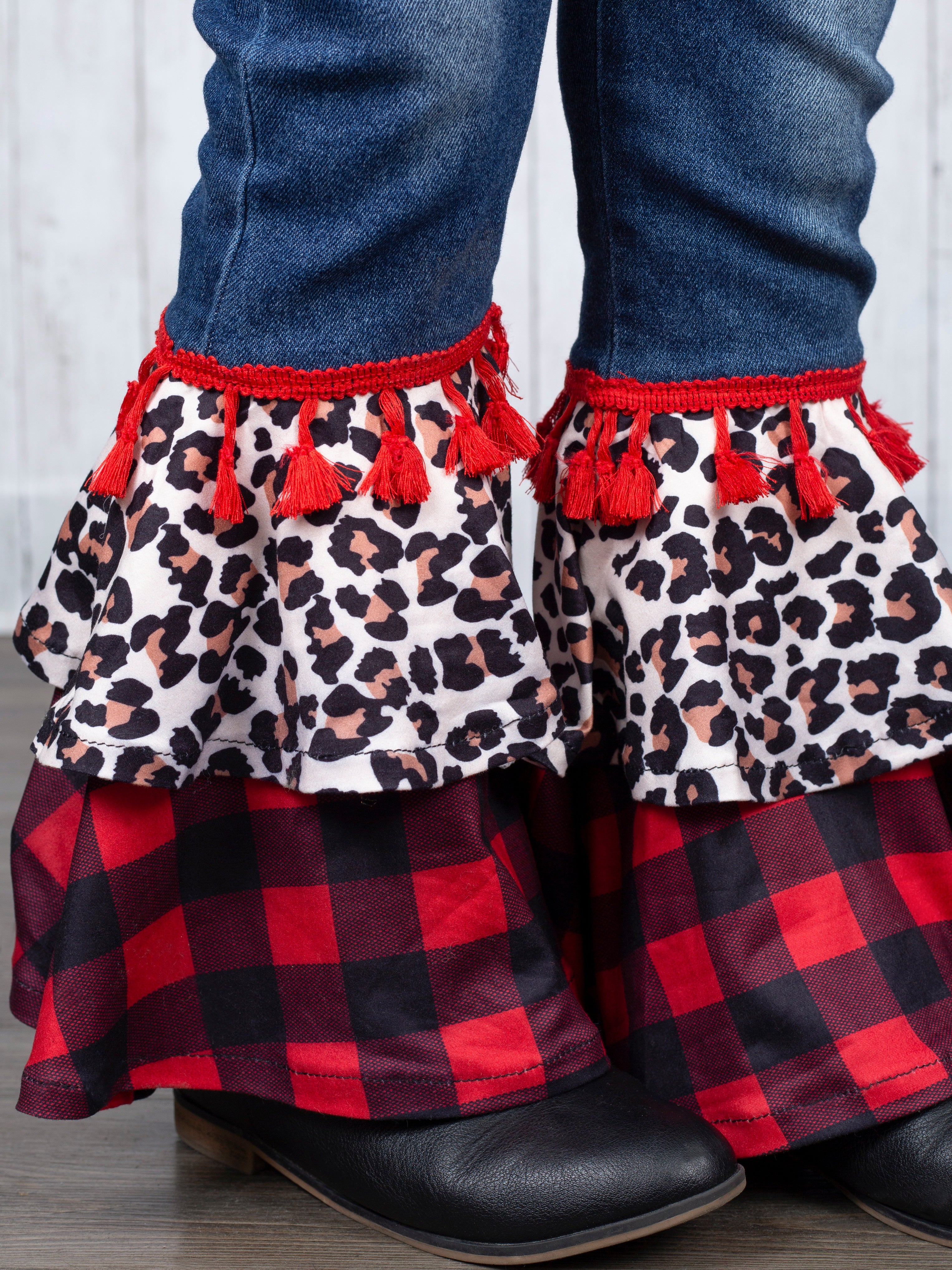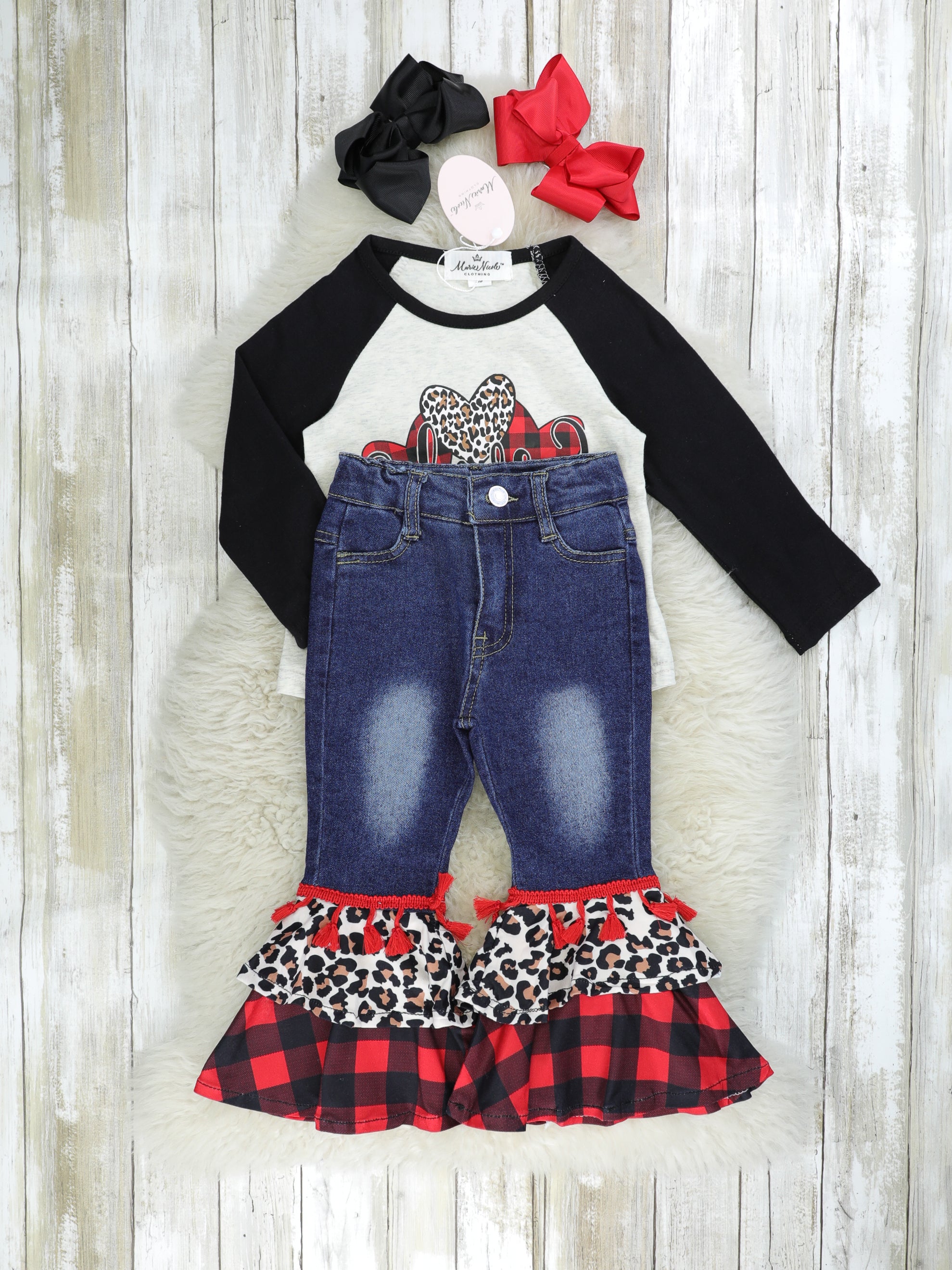 A bold outfit for your sweet girls! This outfit features a cream top with black raglan sleeves & an adorable "love" detail. The denim bell bottoms feature leopard print, buffalo plaid, & darling red tassel fringe.