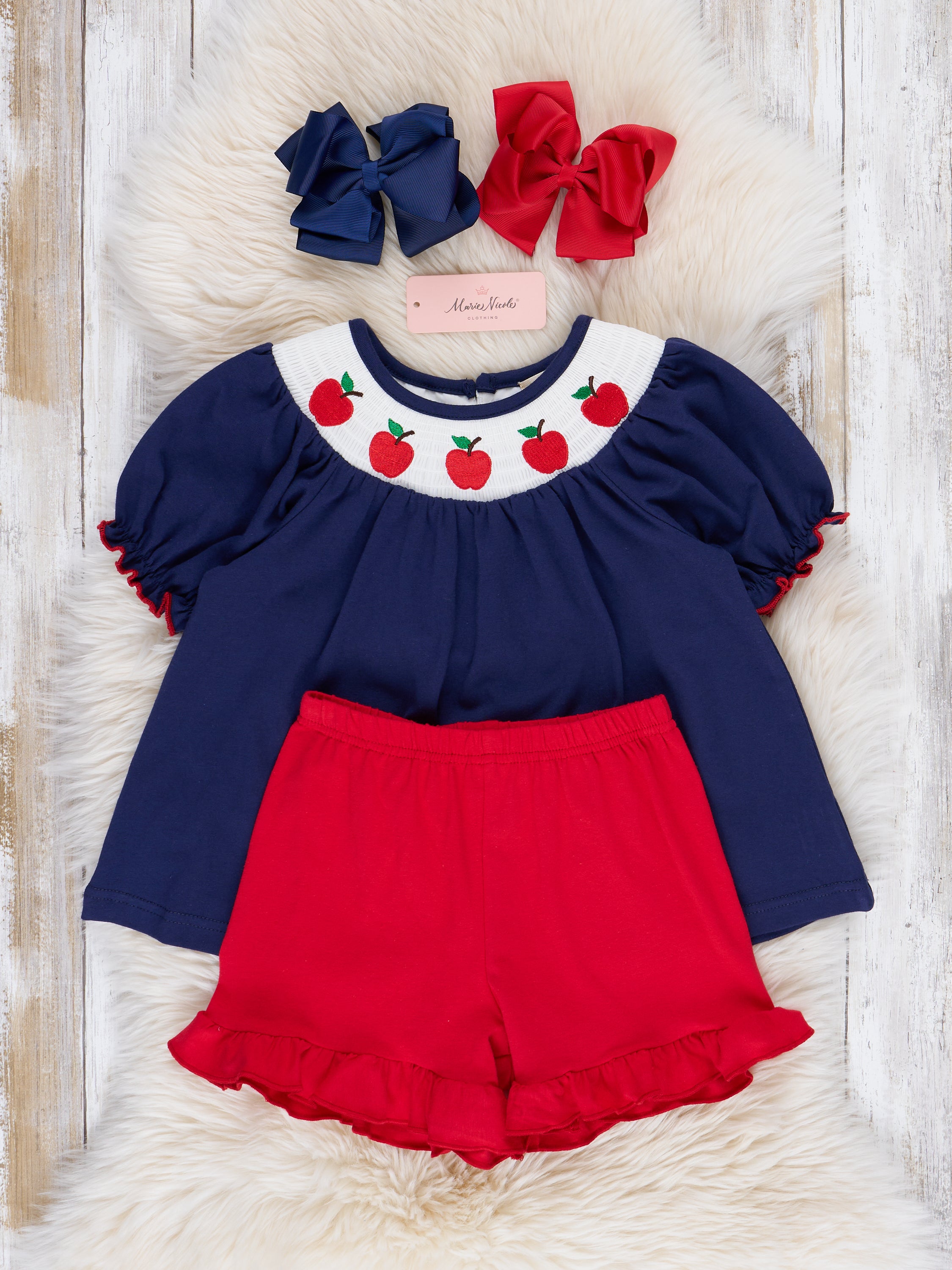 Get the apple of your eye ready for back to school with this playful Navy & Red Smocked Apples Outfit! The navy swing top features adorable embroidered apples over a smocked neck, while the apple red ruffle hem shorts add an extra touch of sweetness. Perfect for any little fashionista, this outfit is sure to make a statement.