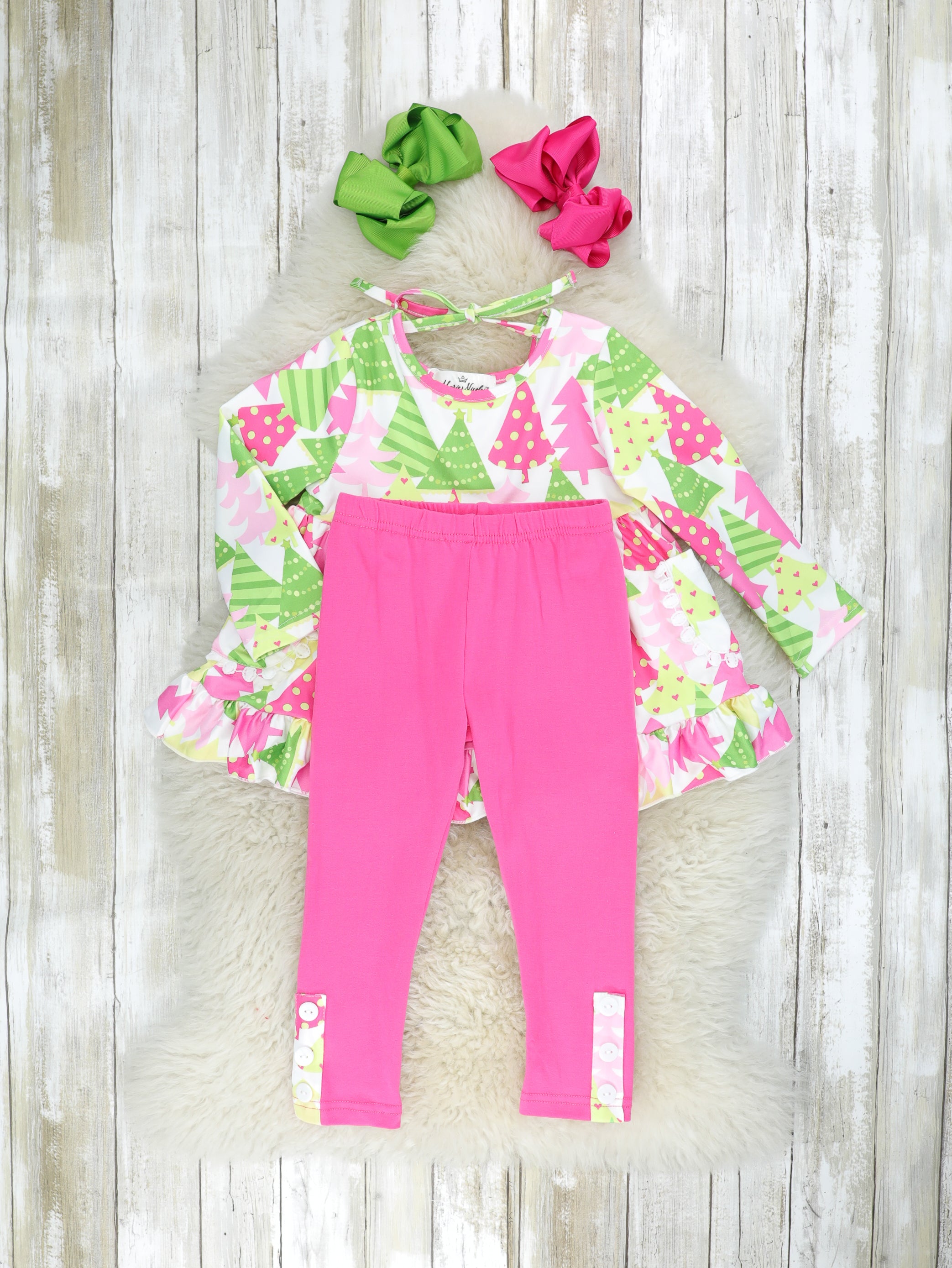 A bold outfit for your Christmas girls! This outfit features a peplum top with vivid Christmas tree details, ruffle trim, a tie at the nape of the neck, & hot pink leggings with an elastic waistband.