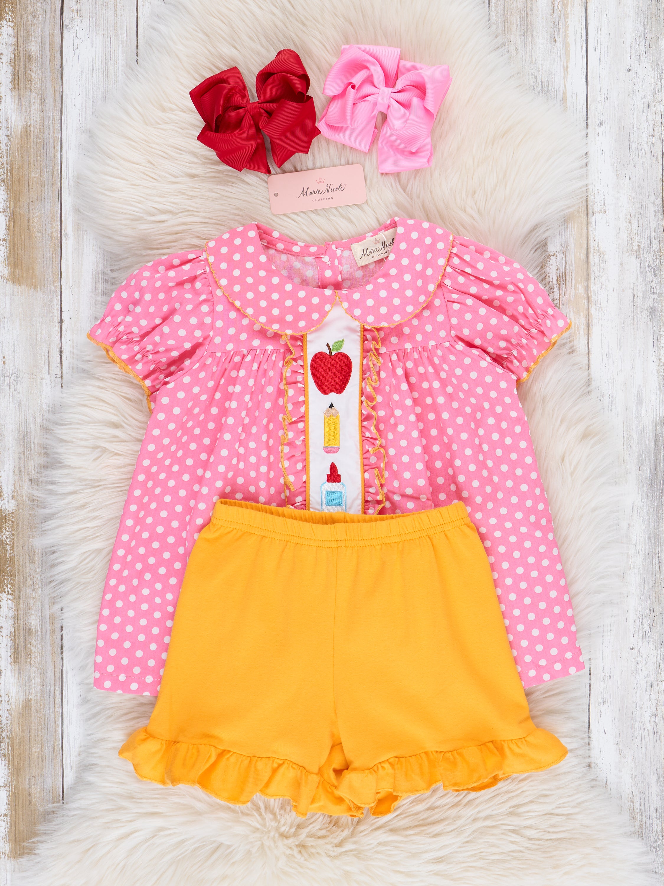 Get your girl ready for school with this playful Pink Dots outfit! The polka dot top is adorned with a fun embroidered design of school supplies, while the orange ruffle hem shorts add a pop of color. Perfect for the first day back!