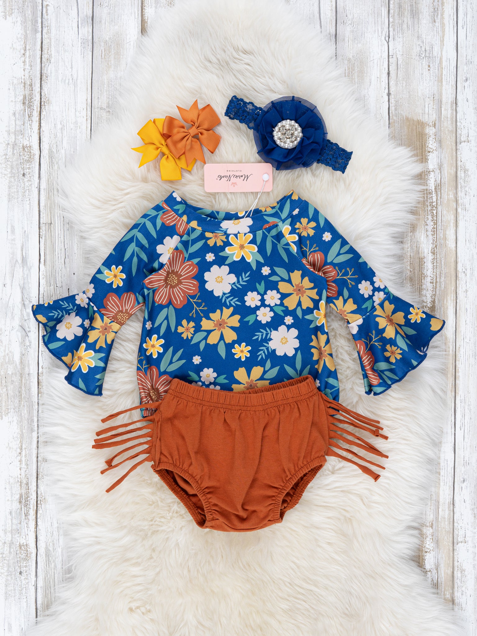 Your little sunshine will look downright delightful in this ultra-stylish combo – a bell sleeve top with a fall floral print paired with fringe suede bloomers. Perfect for days at the park or afternoons spent swinging on the swingset!