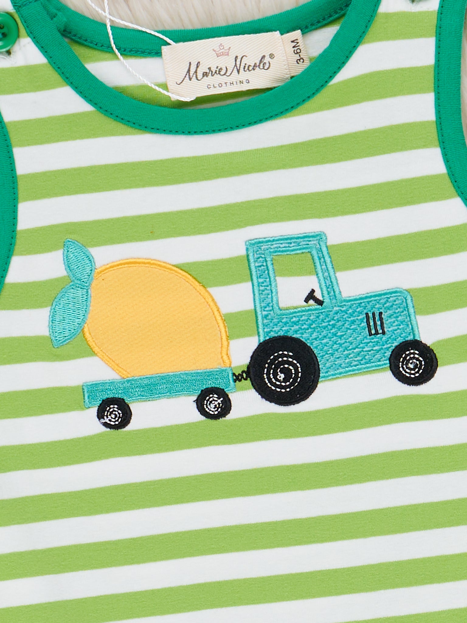 Get ready for summer with this playful Striped Lemon Truck Shirt for boys! Featuring green stripes and an embroidered lemon truck, this shirt is perfect for siblings to match in a fun brother set. From Marie Nicole Clothing.
