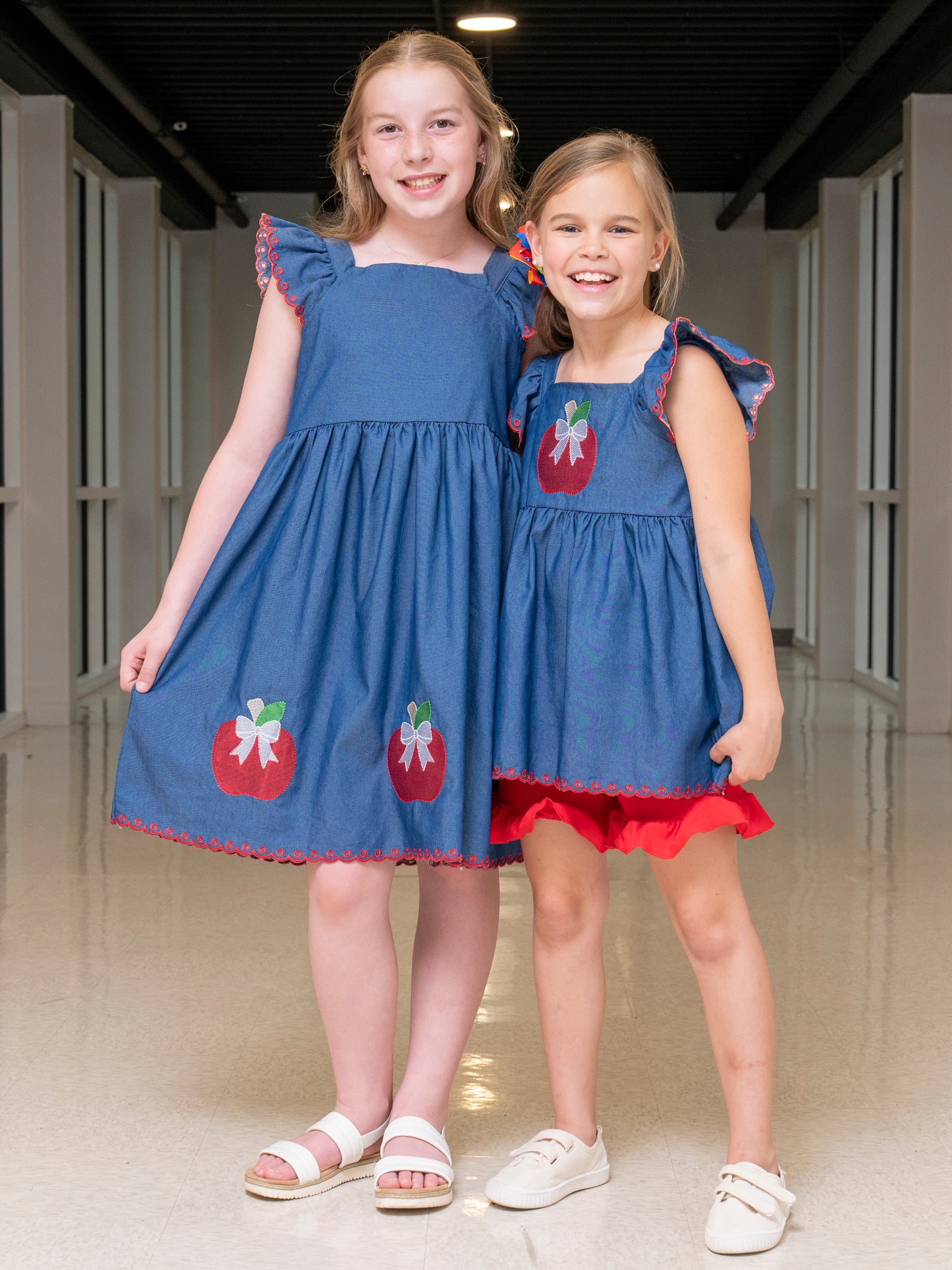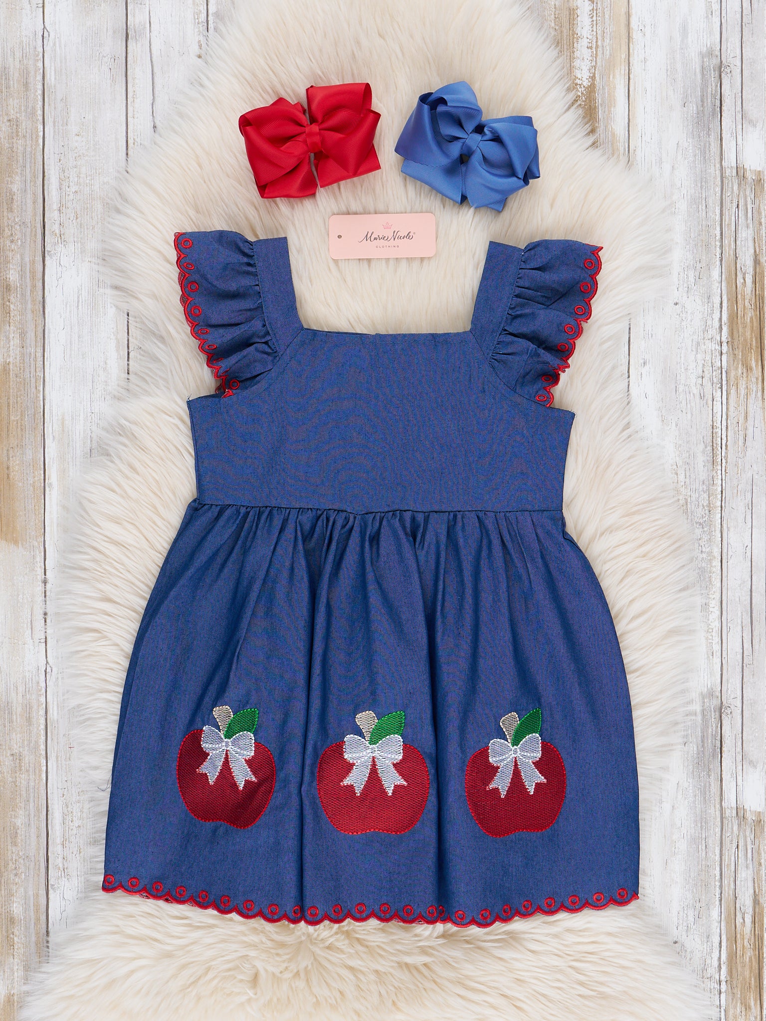 The Sweet Apple Chambray Ruffle Dress is a charming and timeless choice perfect for back-to-school days and casual outings. Featuring a soft chambray fabric adorned with delicate apple embroidery and finished with gentle ruffle details, this dress from Marie Nicole Clothing blends classic style with everyday comfort. Lightweight and breathable, it’s ideal for playdates, family gatherings, or any day she wants to look effortlessly sweet.