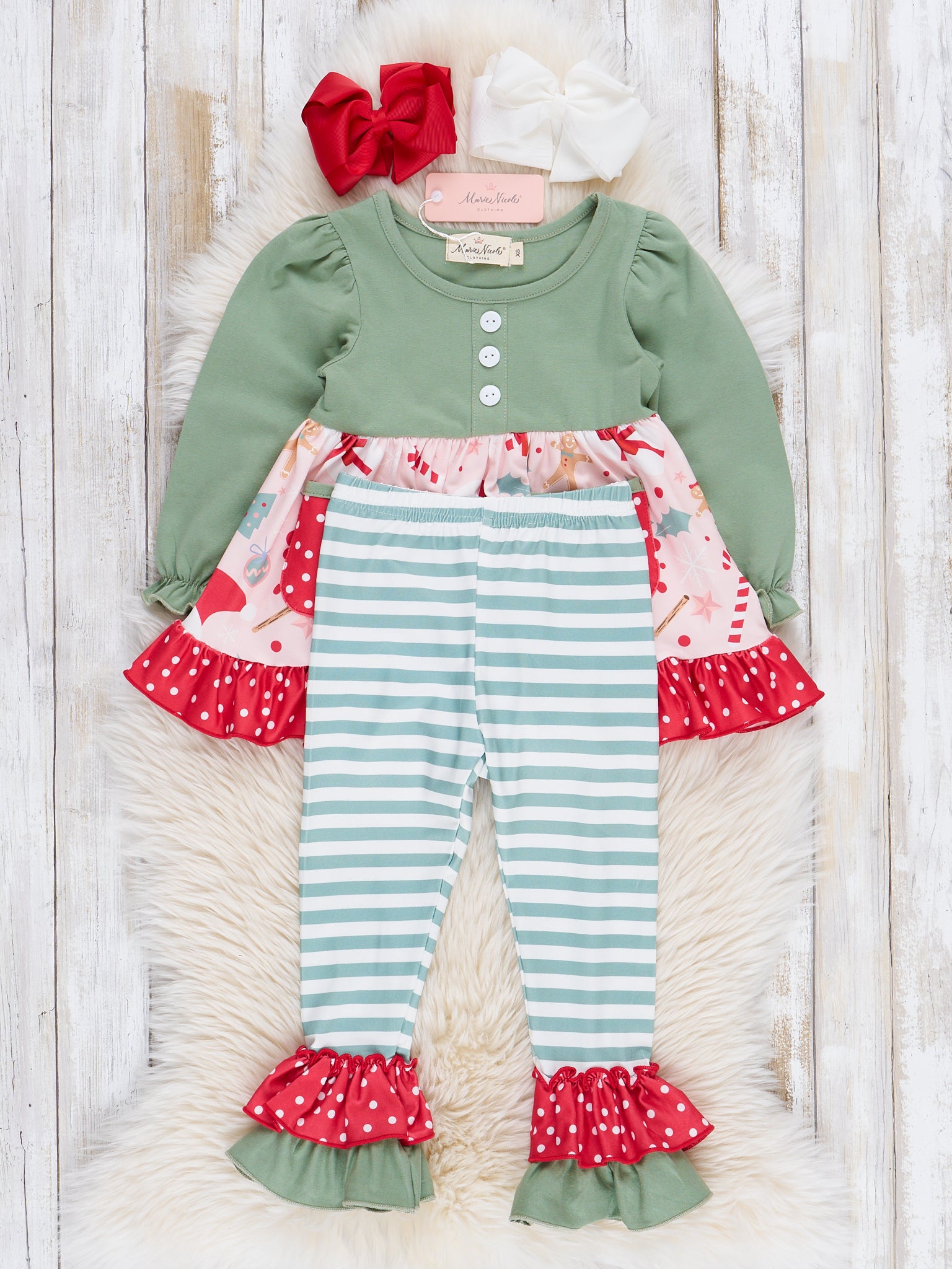 Get jolly with this playful Olive Jolly Time Ruffle Pocket Outfit Featuring a top with charming green bodice & fun and festive jolly holiday print bottom, paired with striped ruffle bell leggings. Perfect for sisters looking to match in style and Christmas cheer!