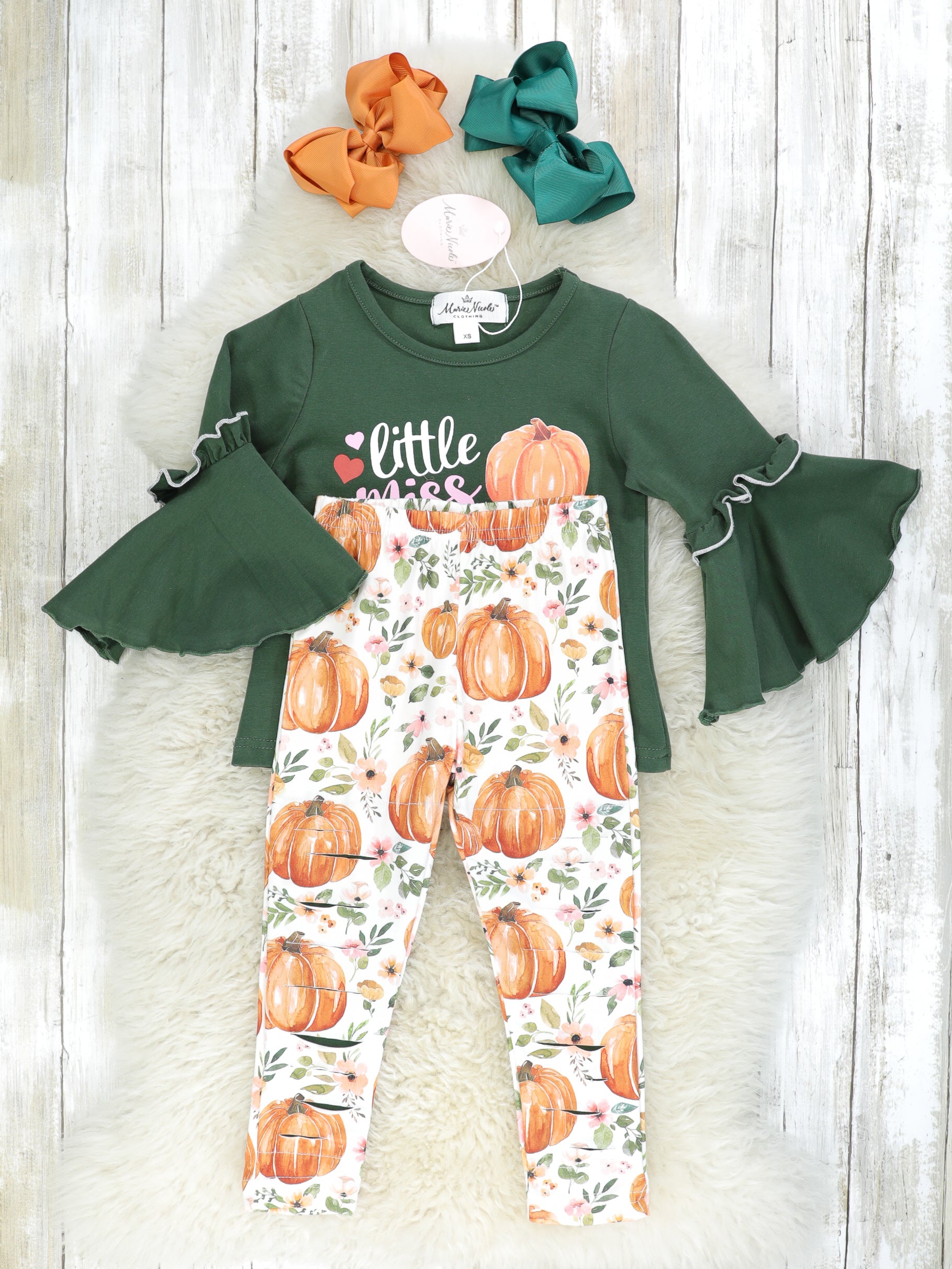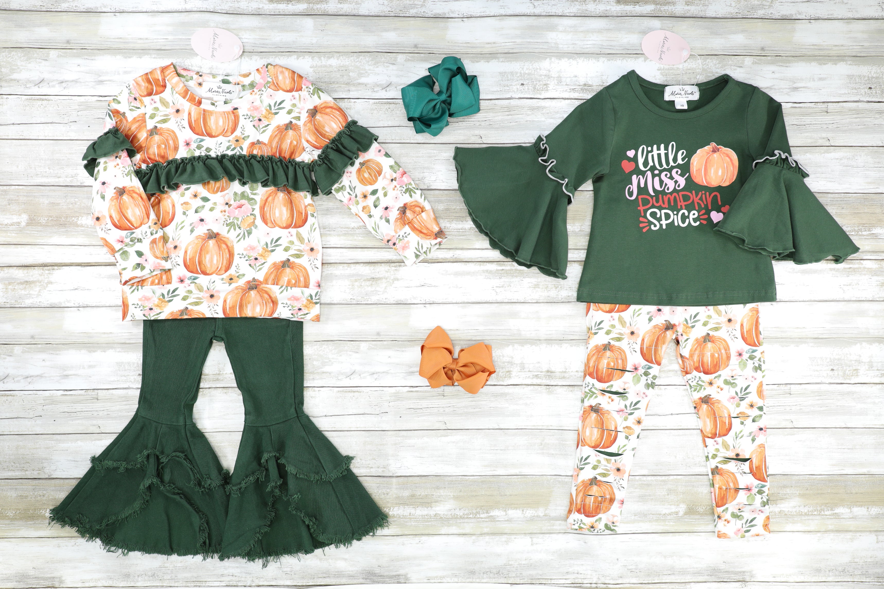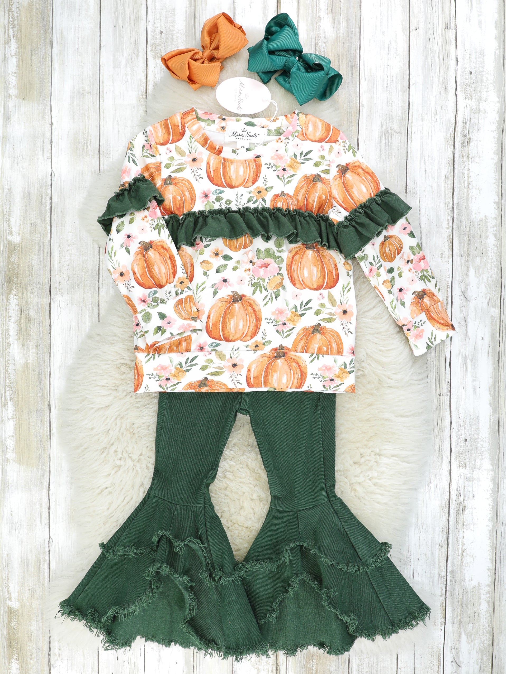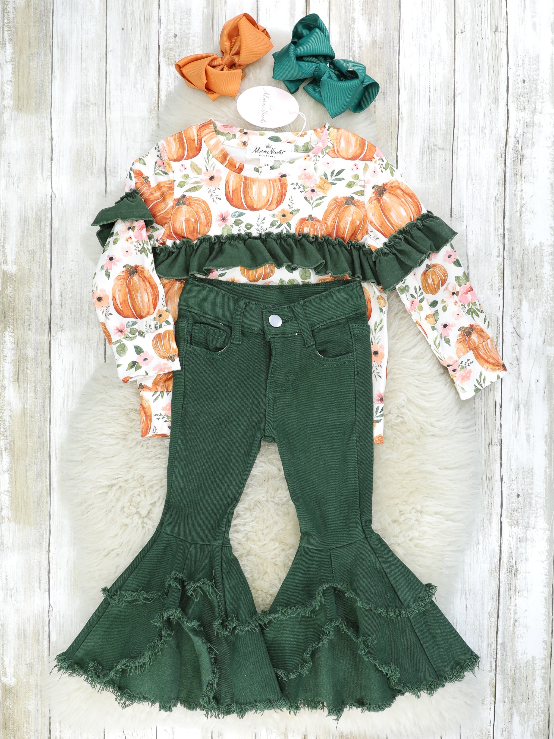Pumpkin Top & Olive Distressed Denim Bell Bottoms