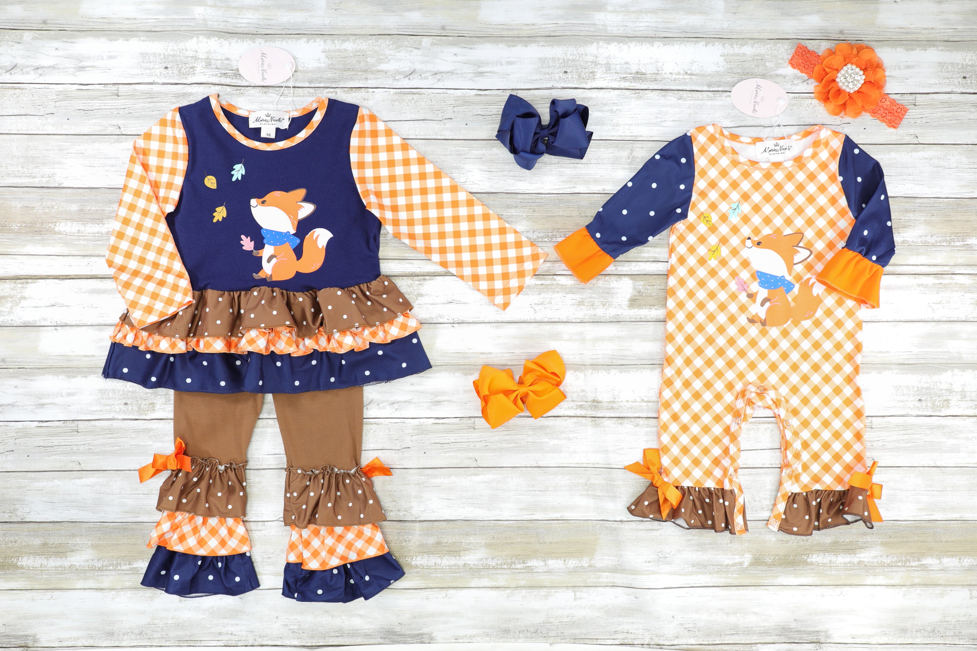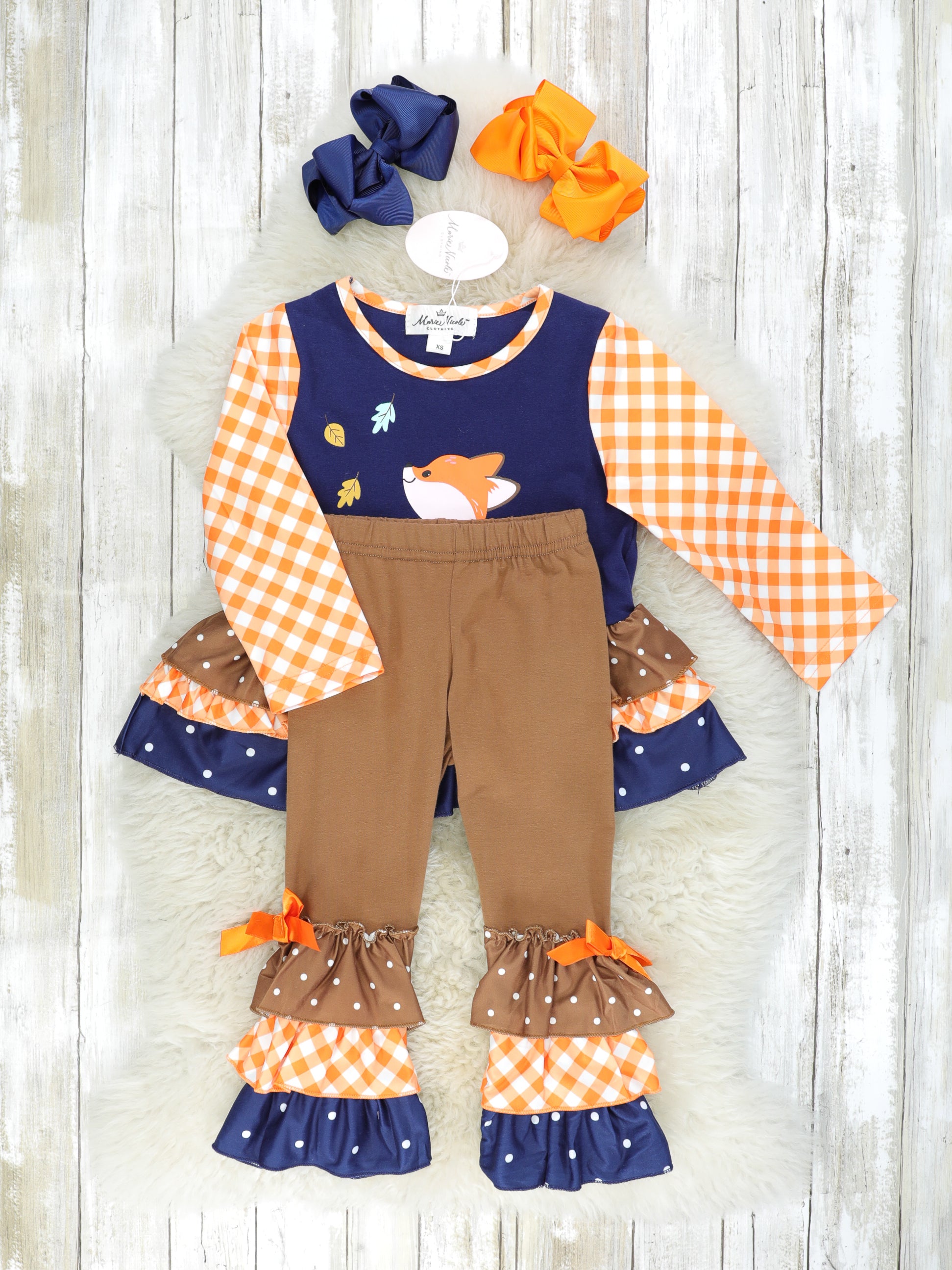 Orange Gingham & Navy Fox Ruffle Top & Brown Ruffle Bottoms Outfit
