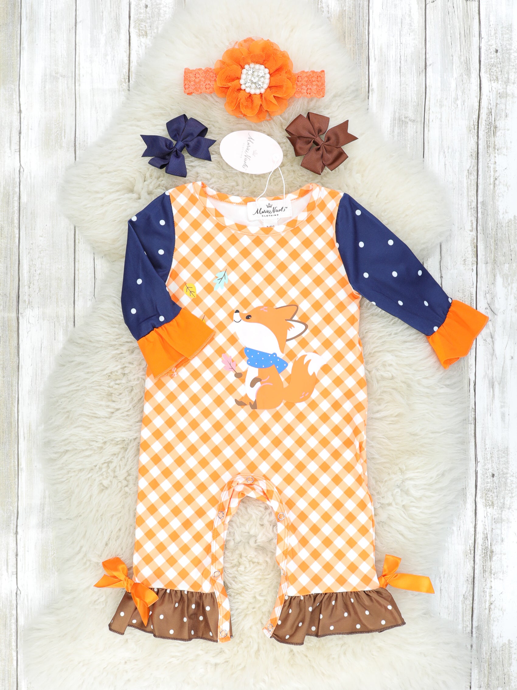 This fall fox set has something for all the kiddos! This orange gingham romper features an adorable fox with leaves appliqué, polka dots, ruffle details, & bow details at the ankles.