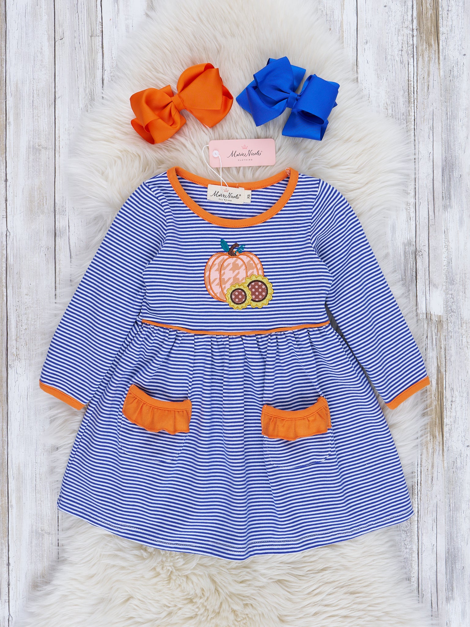 Orange & Navy Stripes Embroidered Pumpkin Dress