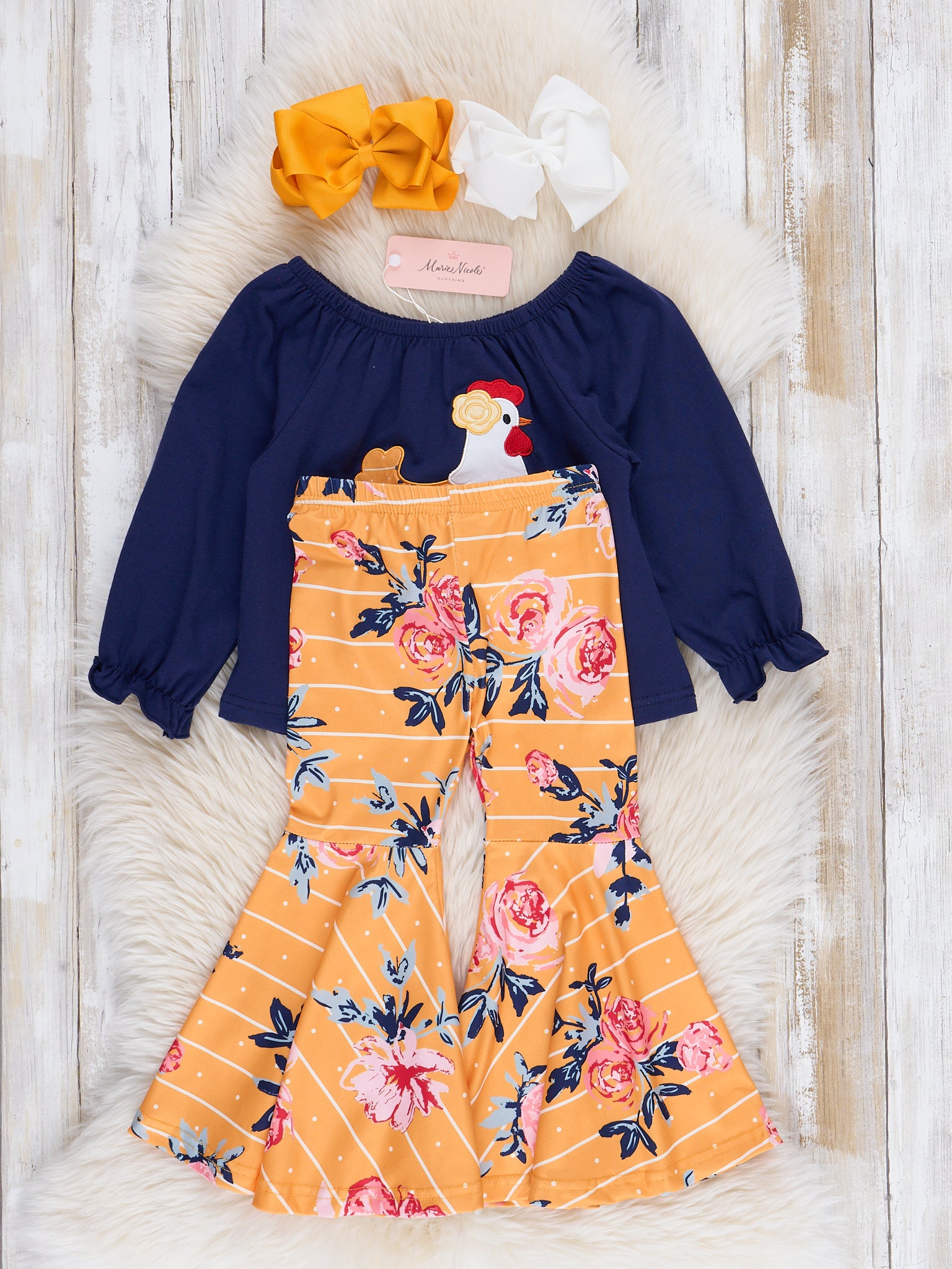 Navy & Orange Floral Chicken Bell Bottoms Outfit