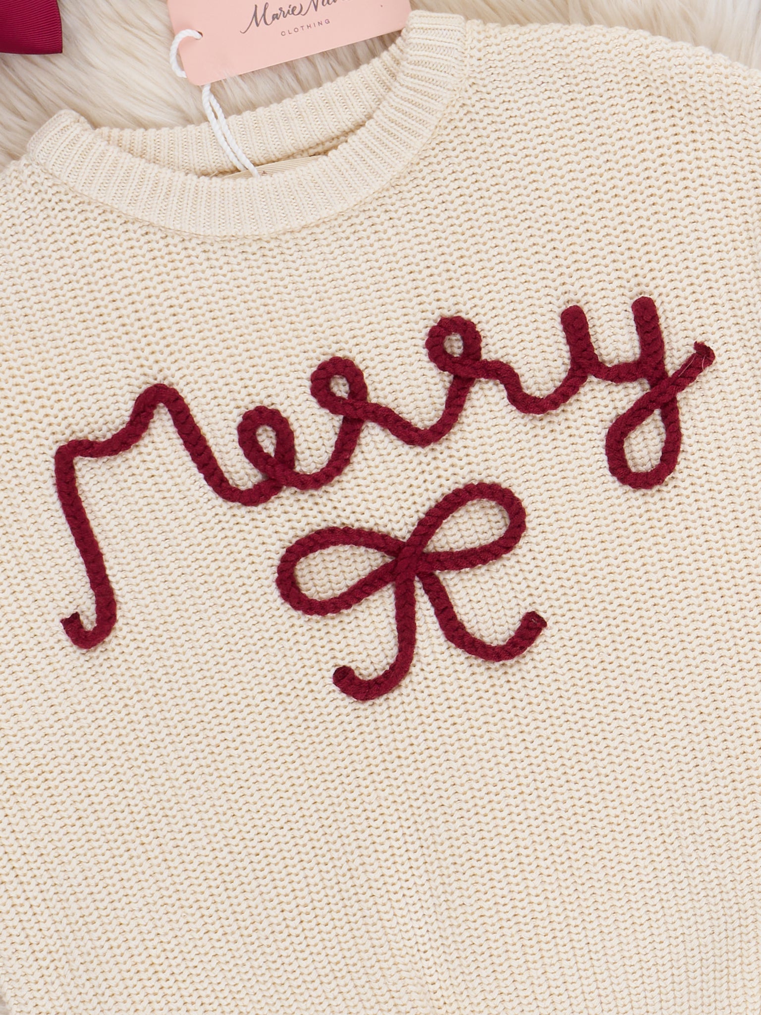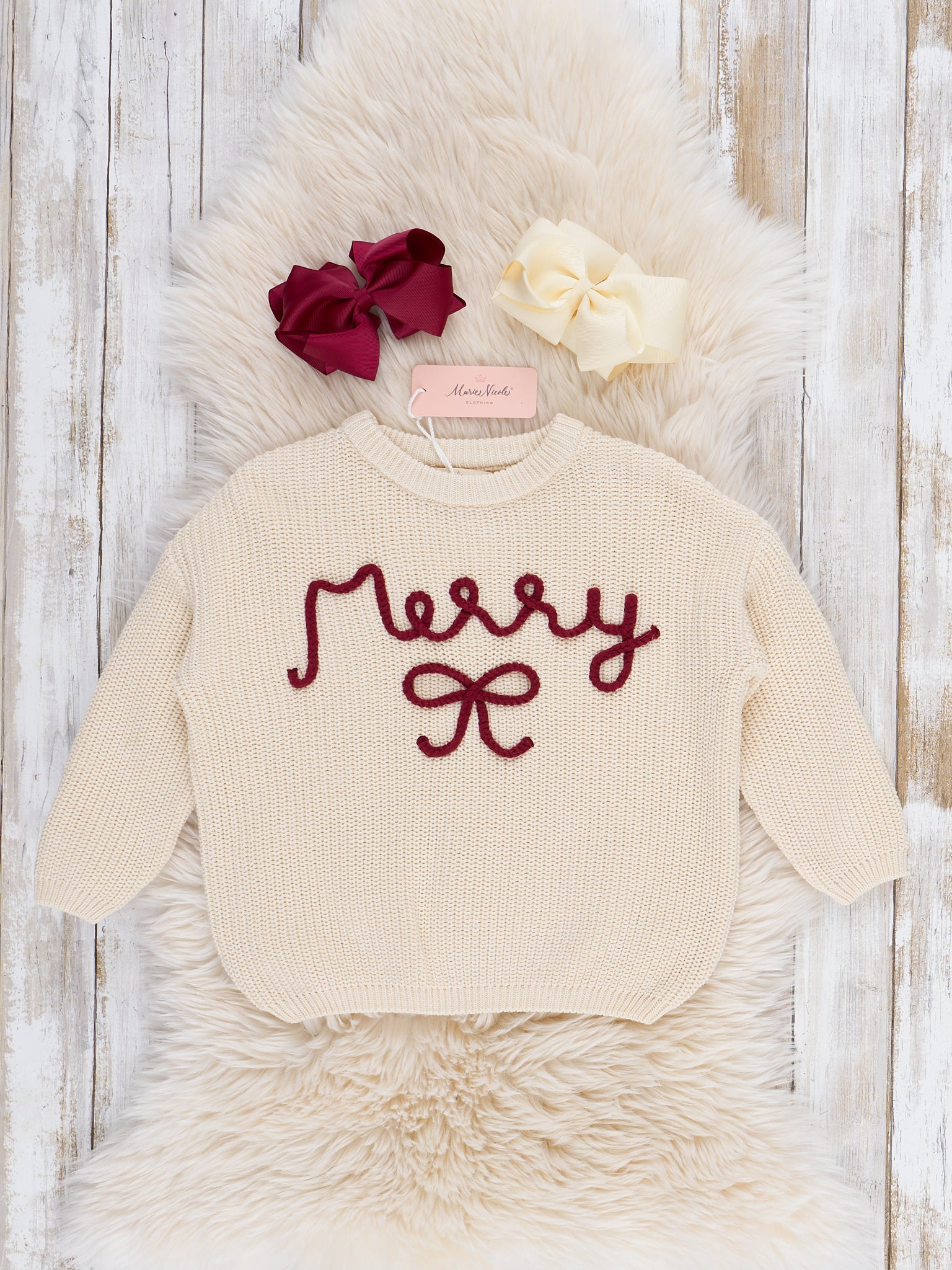 The Merry Bow Oversized Sweater by Marie Nicole Clothing features a cheerful "Merry" text design and a bow detail crafted in raised knit on the front. This cozy sweater is ideal for holiday celebrations and everyday festive wear, offering a playful touch to seasonal outfits.