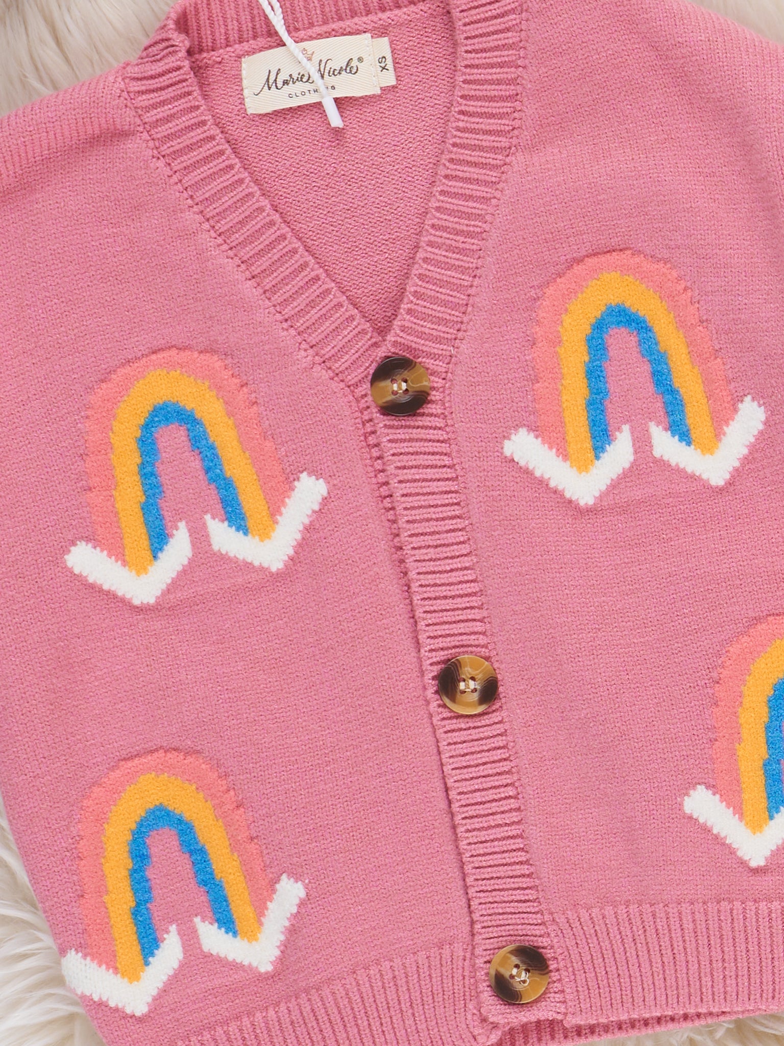 The Rainbow Clouds Cardigan by Marie Nicole is a playful knit cardigan featuring whimsical rainbow designs across the front and sleeves. With a button-up front and soft, comfortable fit, this sweater brings a cheerful and imaginative touch to everyday outfits.