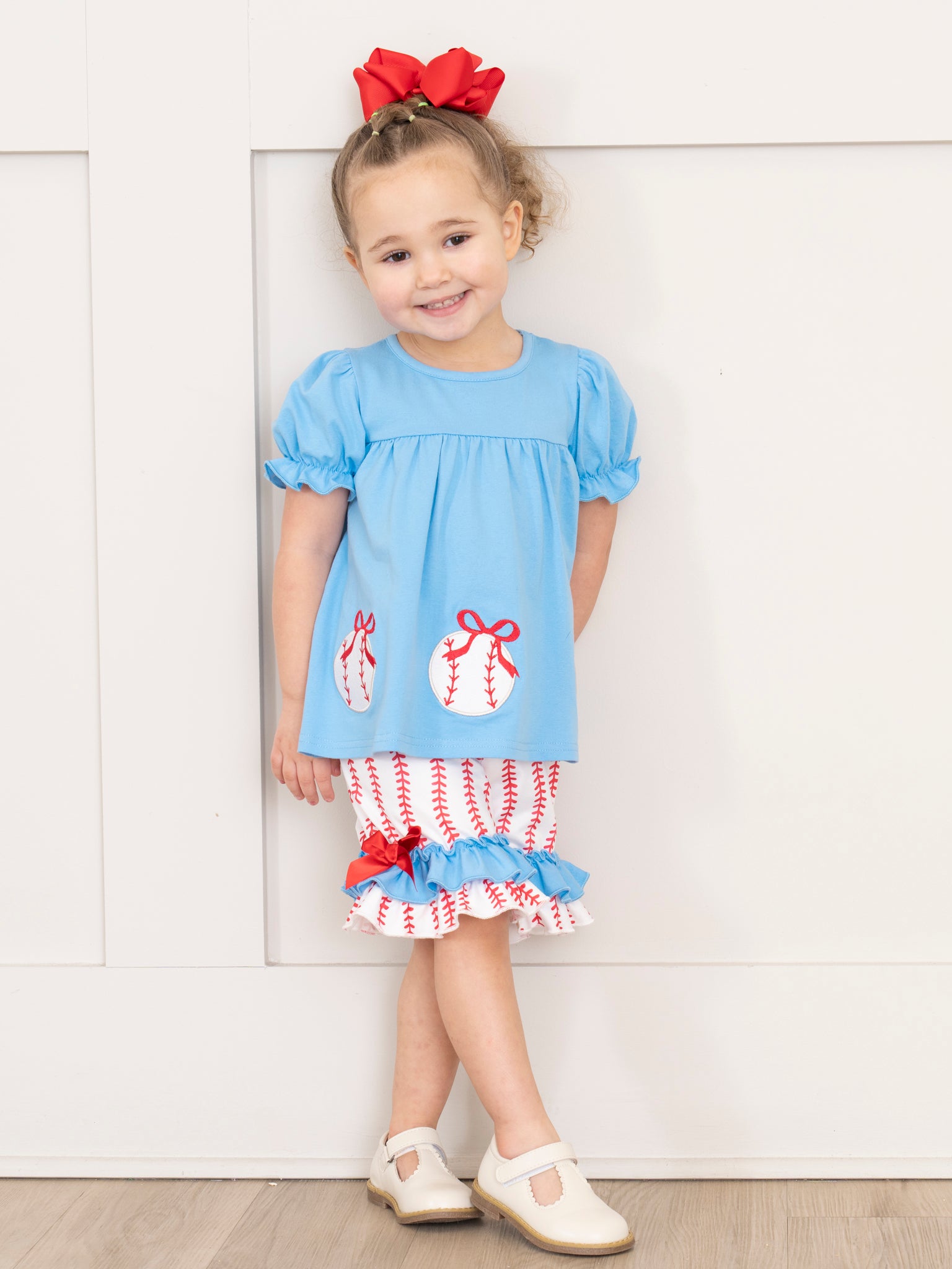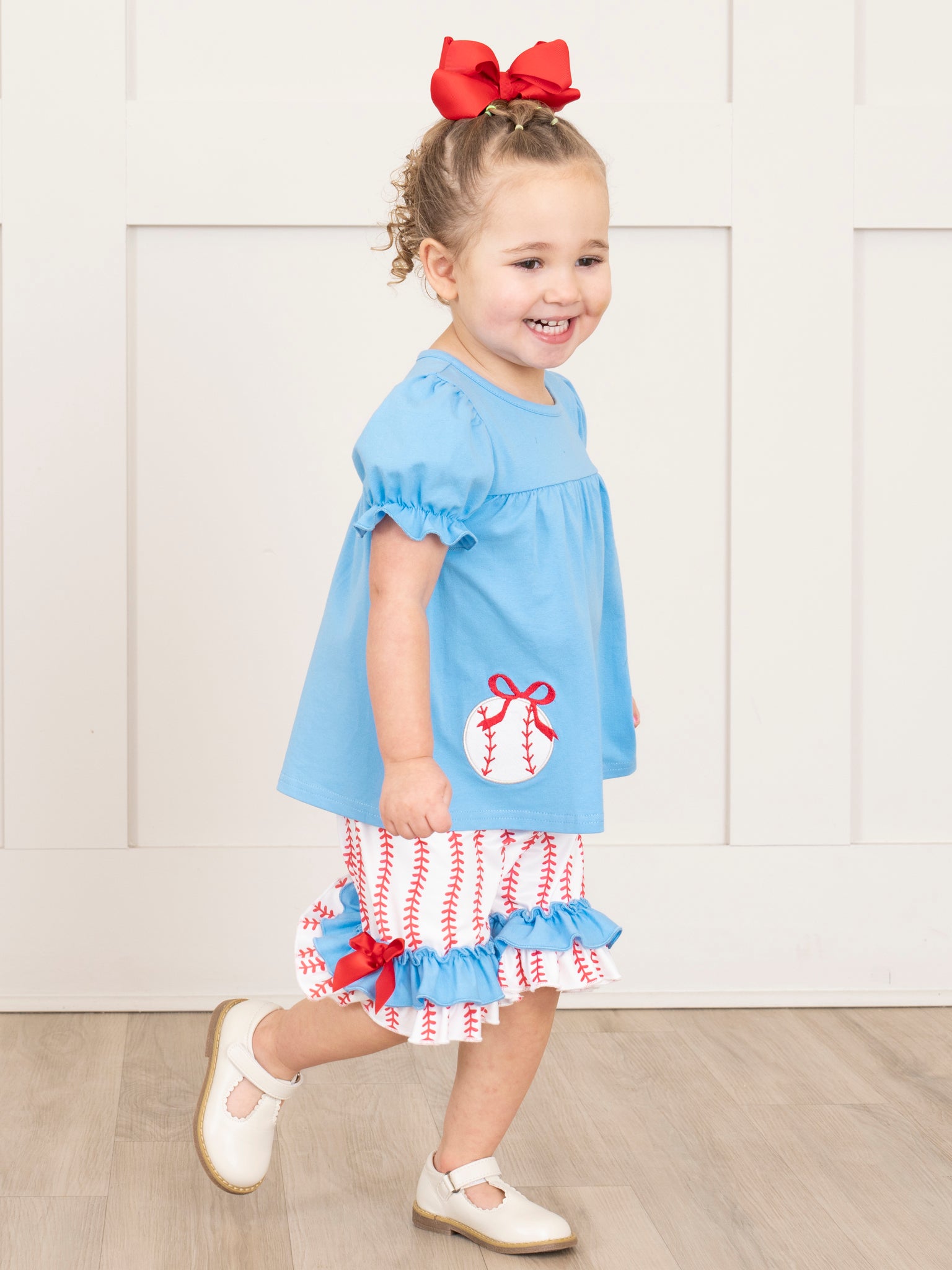 Get ready to hit a home run with this adorable Baseball Stripes Embroidered Ruffle Outfit by Marie Nicole Clothing! Made with soft cotton, the puff sleeve top features embroidered baseballs at the hem, while the baseball striped ruffle hem shorts complete the outfit. A playful and stylish choice for any siblings.