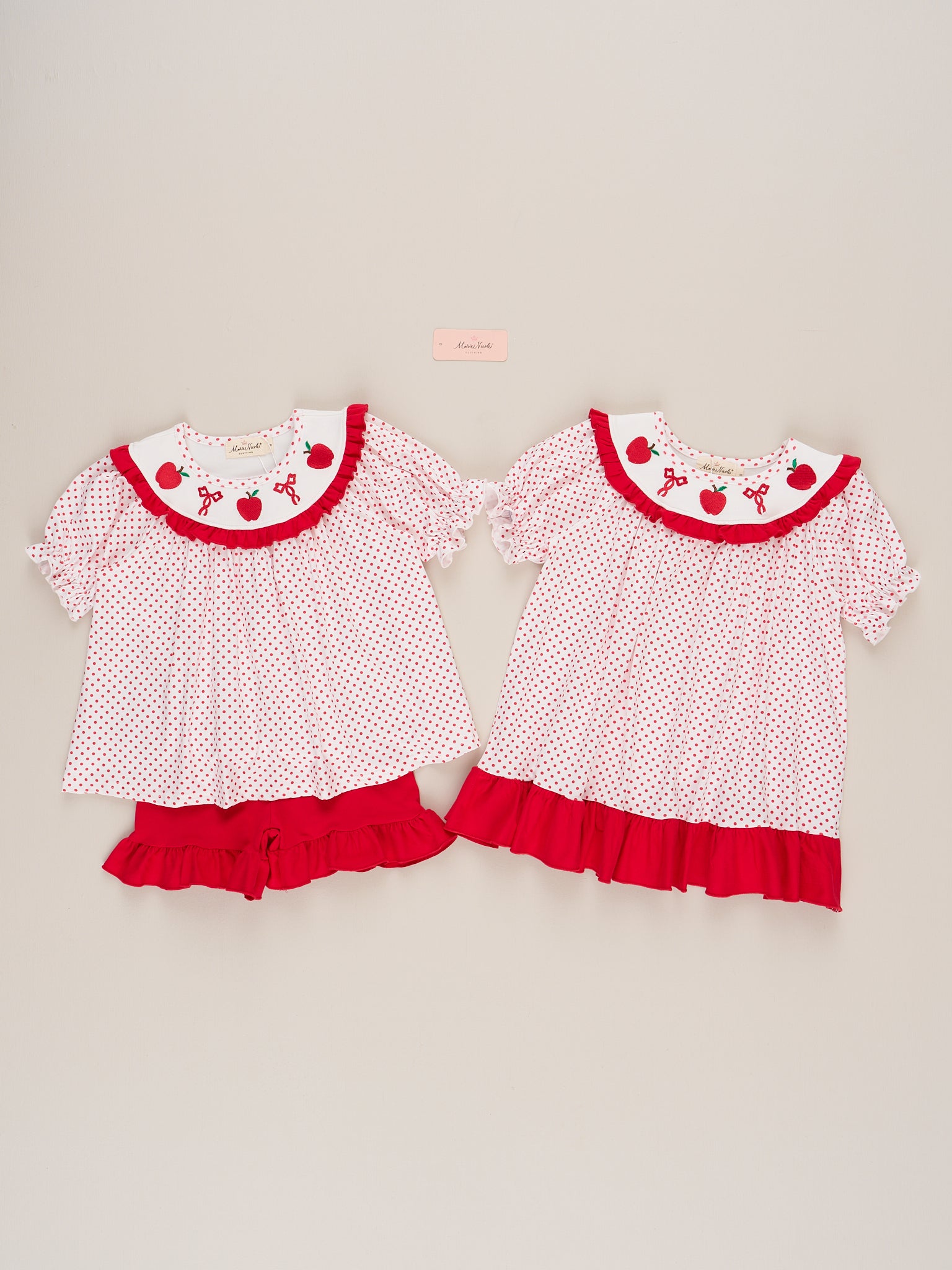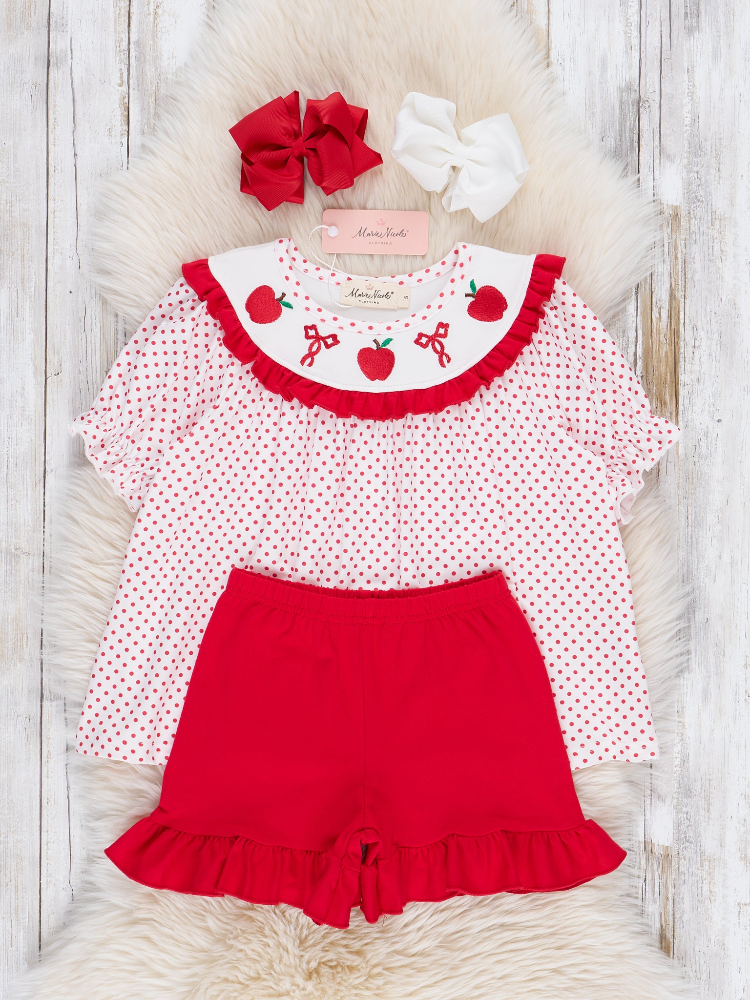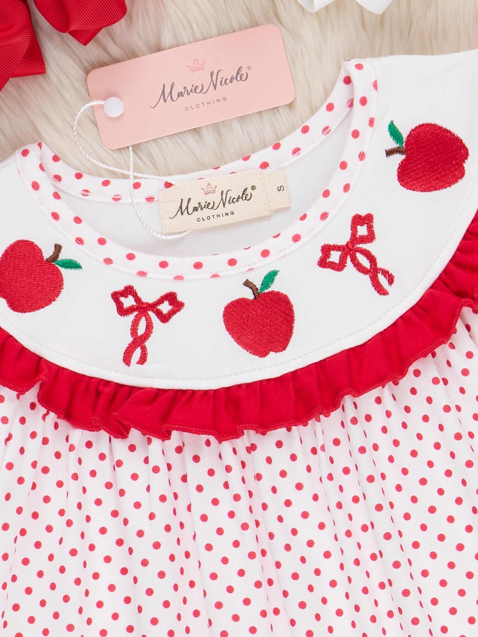 The Dots Smocked Apples Bows Ruffle Outfit is a delightful and charming outfit that blends classic patterns with playful details. Featuring a sweet combination of polka dots, apples, and bows, this outfit from Marie Nicole Clothing is finished with delicate smocking and soft ruffle accents for extra sweetness. Made from breathable fabric, it’s perfect for playdates, family outings, or any day she wants to shine with timeless style.