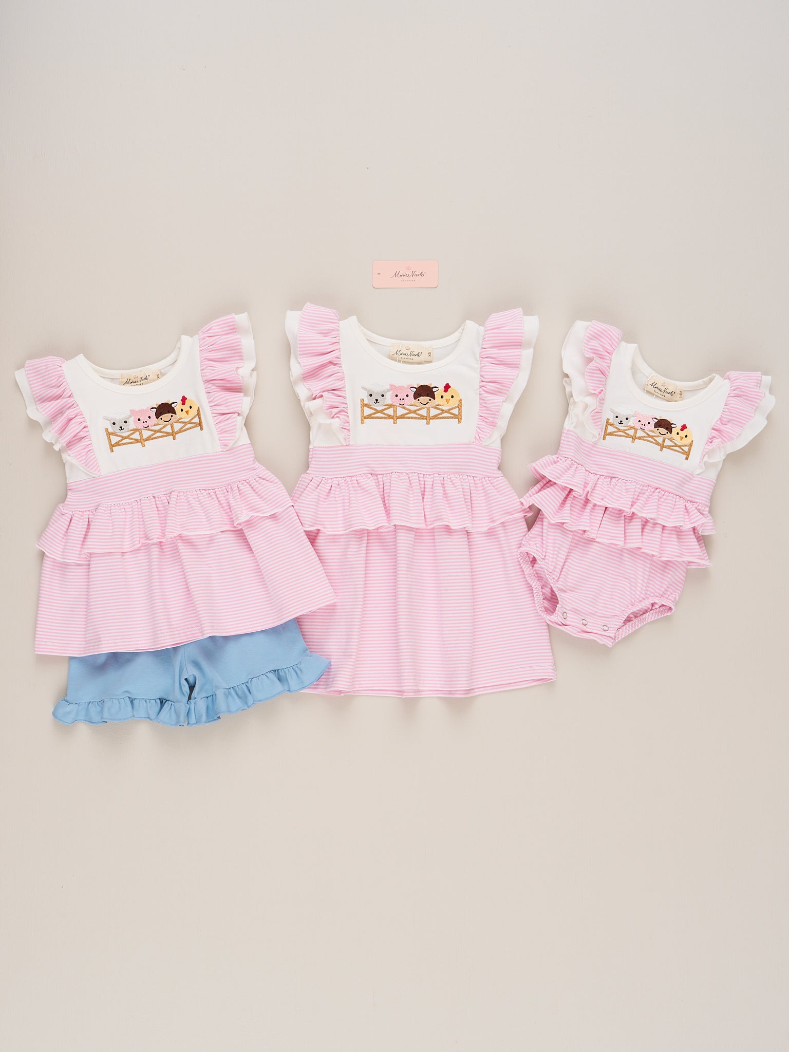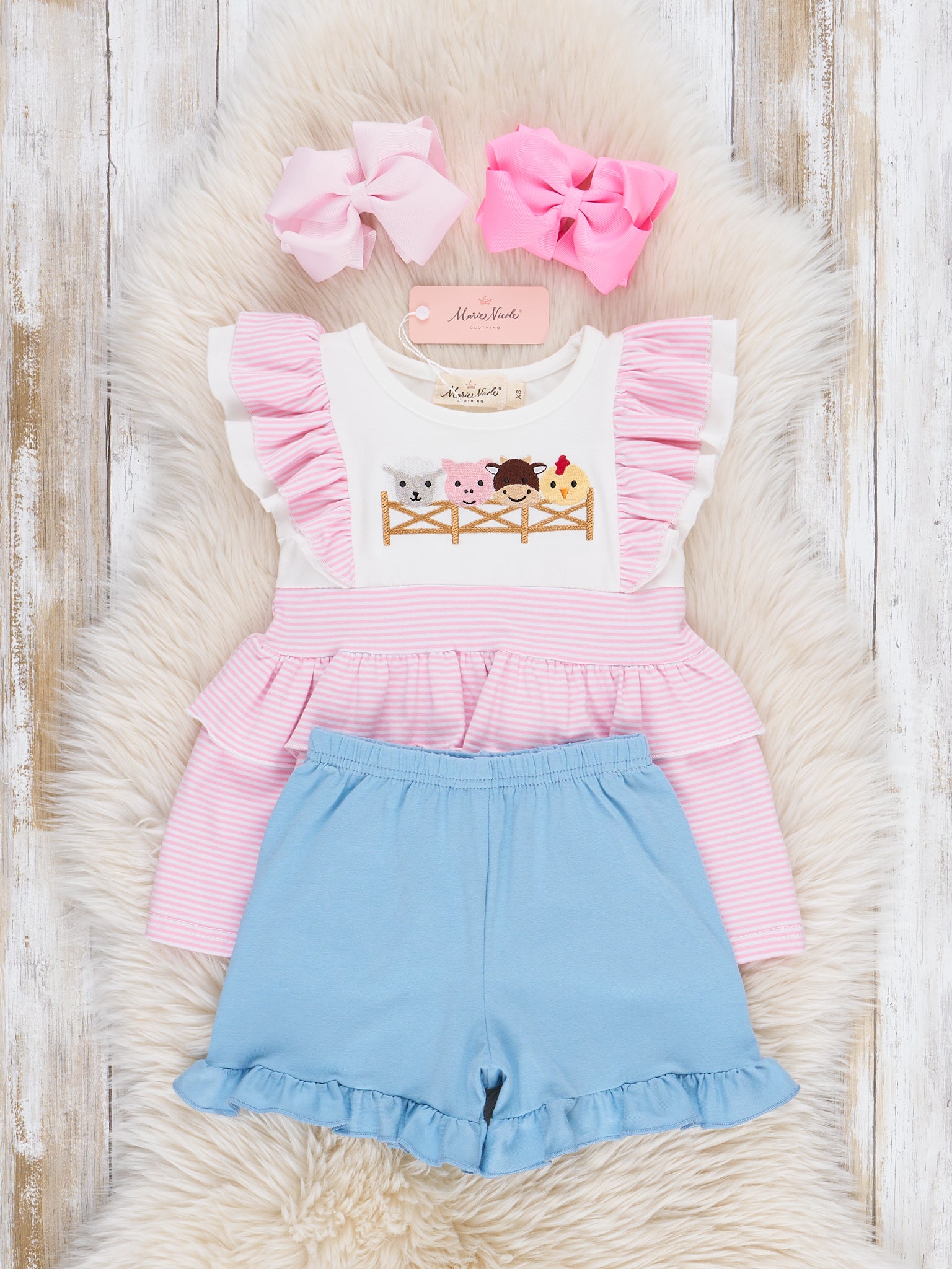 Your little one will be the cutest on the farm in the Embroidered Baby Farm Friends Outfit! This adorable outfit from Marie Nicole Clothing features beautifully embroidered barnyard buddies—sheep, cow, pig, and chick—across the chest. Soft ruffle accents on the sleeves, legs, and waist add an extra dose of charm.