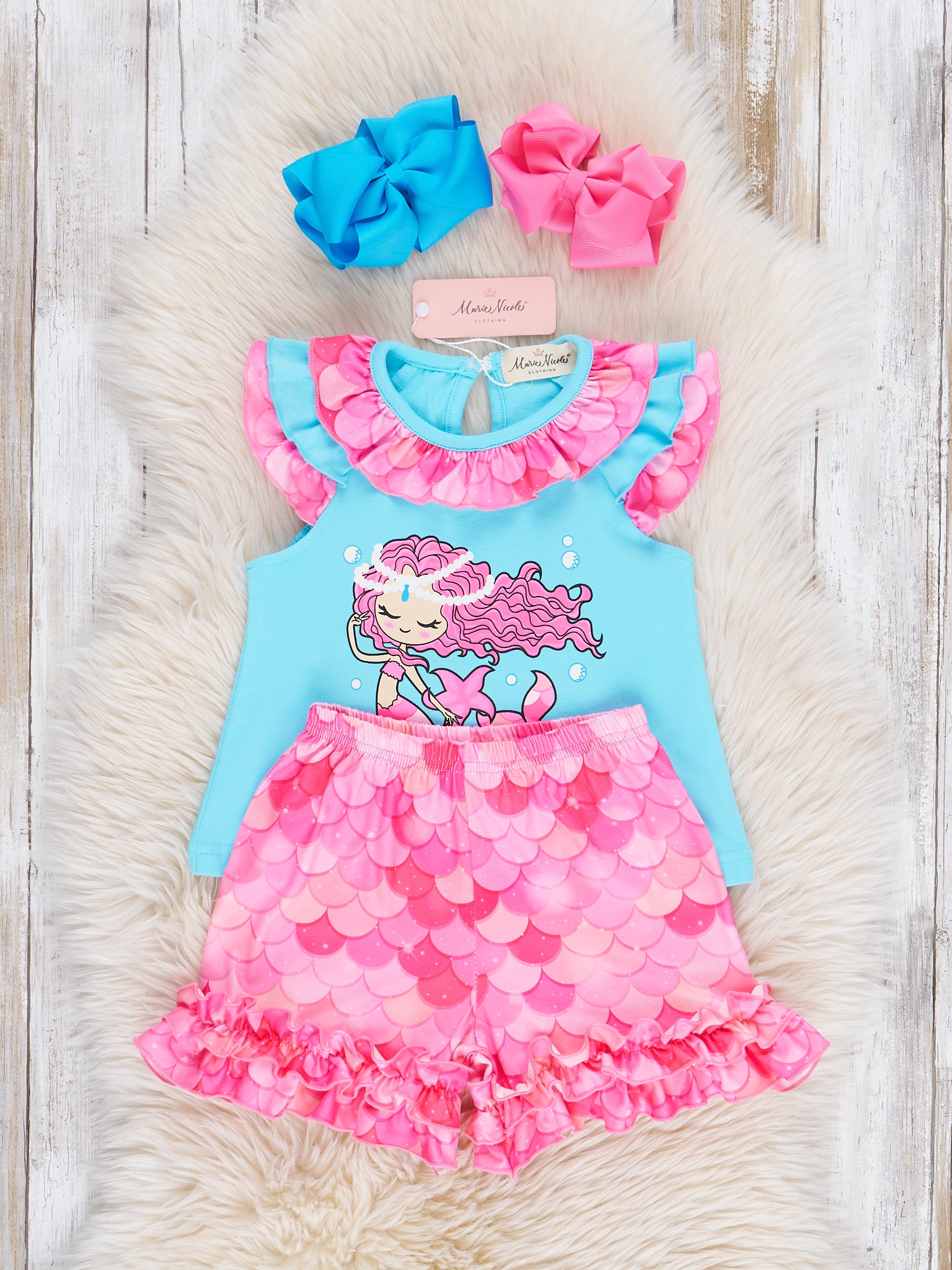 Make a splash with the Mermaid Life Embroidered Ruffle Outfit! Perfect for summer and beach days, this girls' outfit features a playful teal top with a pink ruffle detail and a mermaid design. The pink mermaid scales printed shorts with a ruffle hem add a fun touch. Let your little one embrace her inner mermaid!