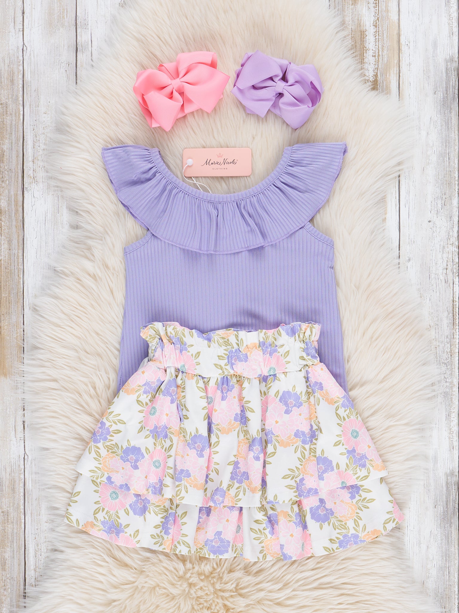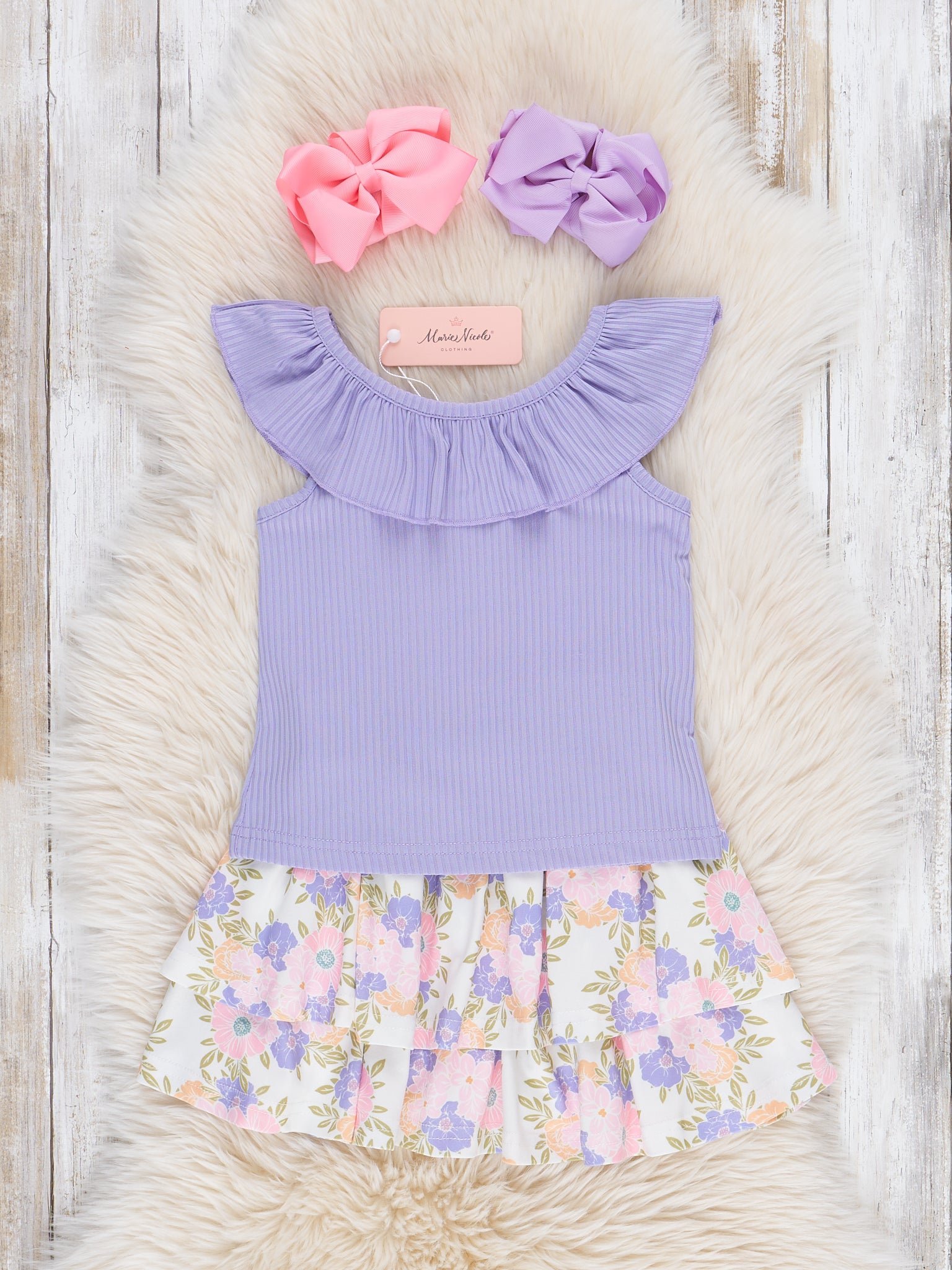 Get your little one ready to bloom with this adorable girls outfit from Marie Nicole Clothing! The periwinkle ribbed top features a cute ruffle collar, while the tiered ruffle skirt adds a playful touch with a floral print. Perfect for matching with a sister set! Sweet siblings sold separately.