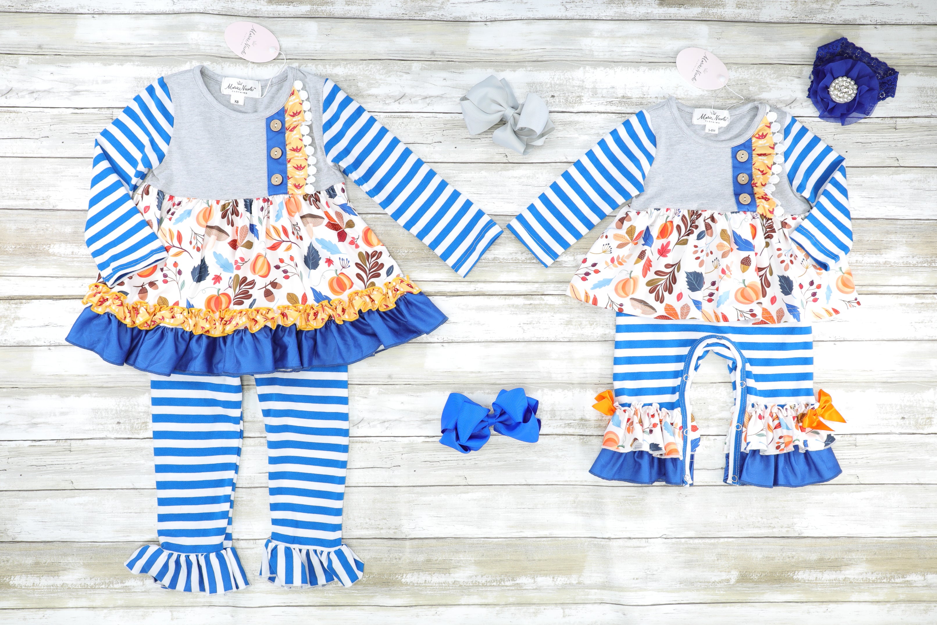 bold sister set for your fall gals! This romper features ruffles, decorative buttons, striped raglan sleeves, a stunning fall foliage skirt, & bow details at the ankles.