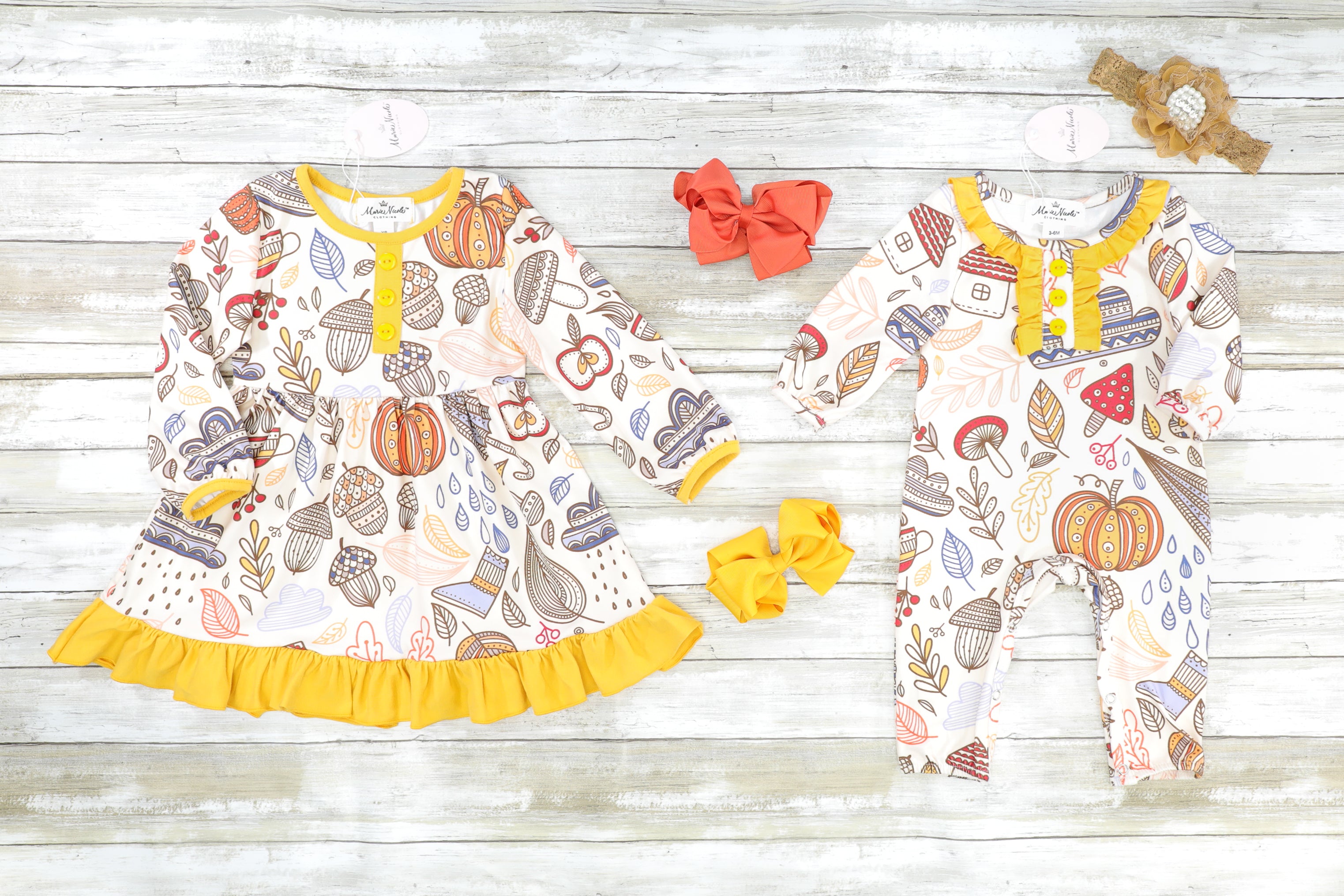 This lovely sister set is perfect for your creative girls! This dress features stunning fall foliage, decorative buttons, & ruffle trim.