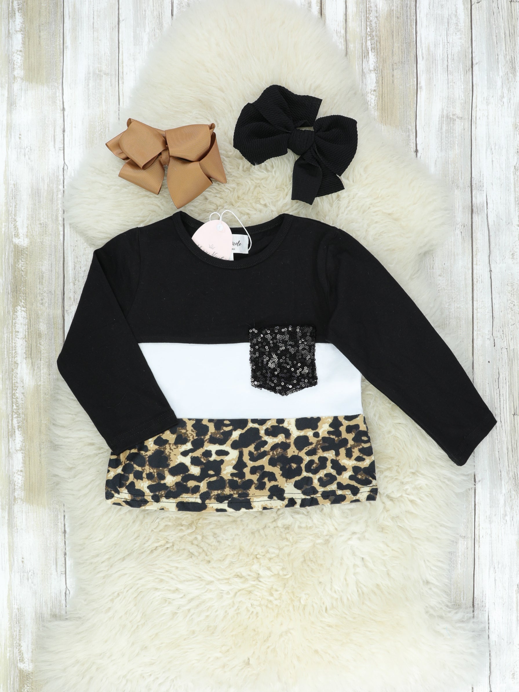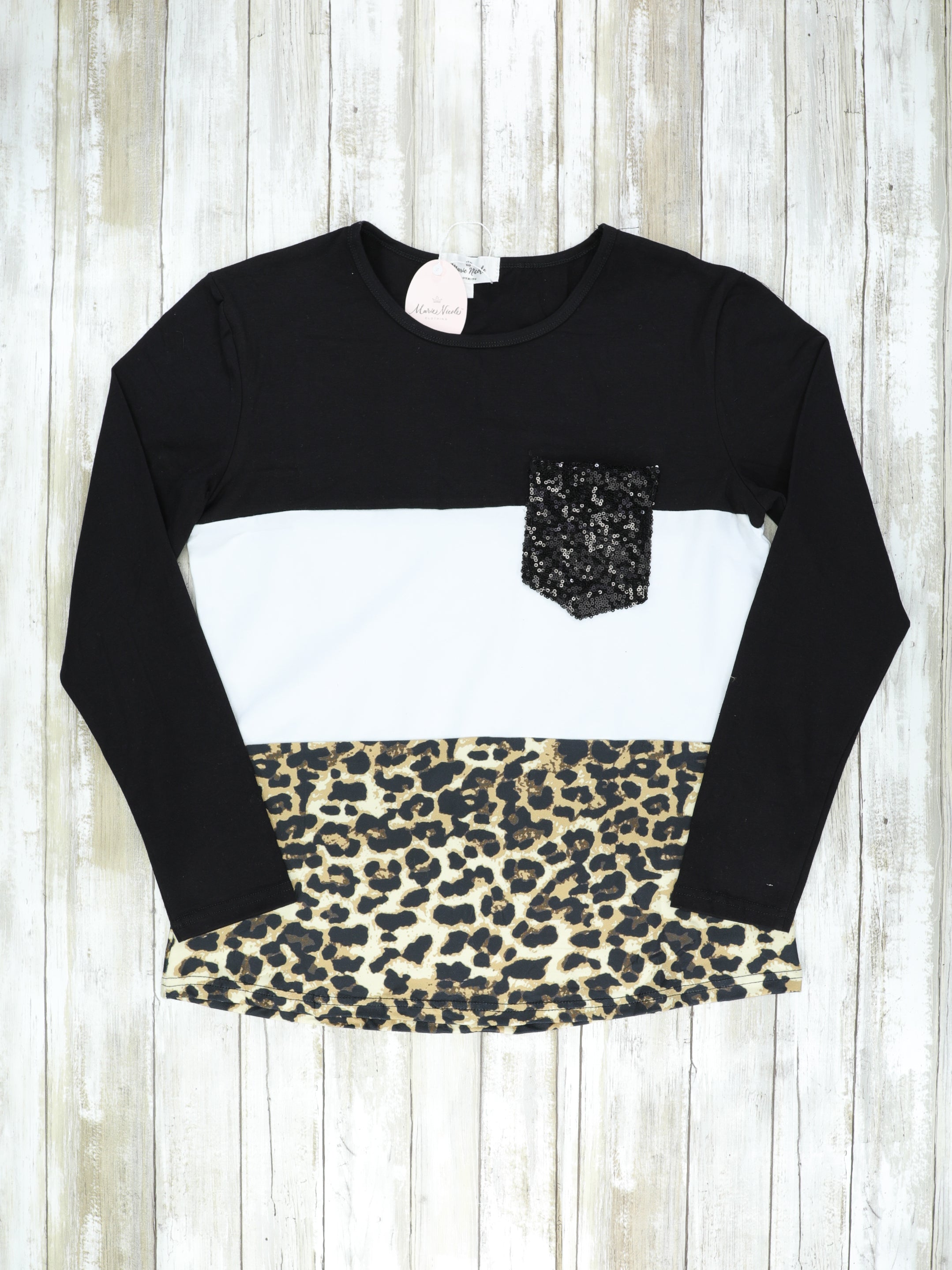 Mom & Me Black White Leopard Colorblock Sequin Pocket Shirt