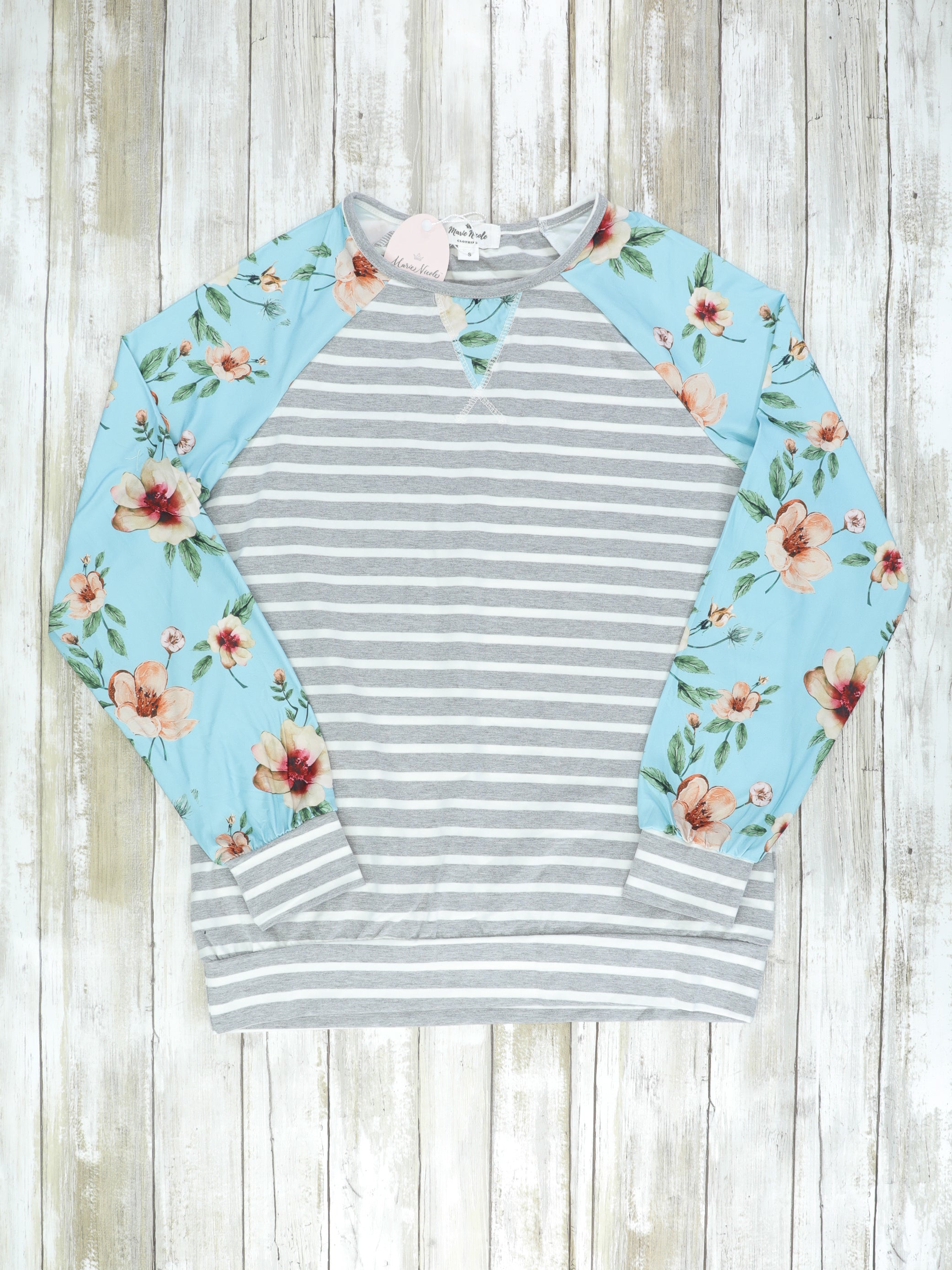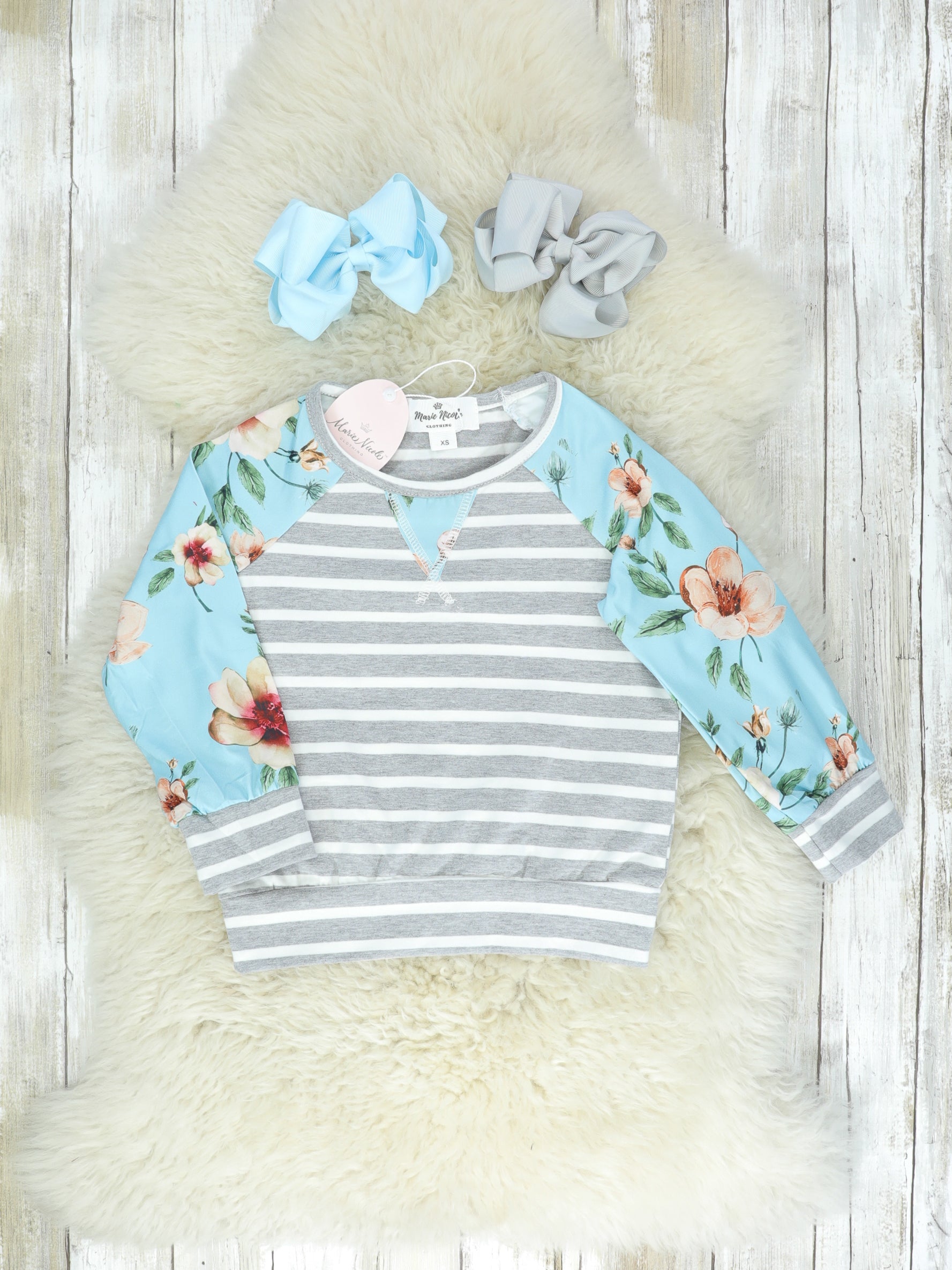 Match your mini in this sweet t-shirt! These grey striped shirts feature floral raglan sleeves.