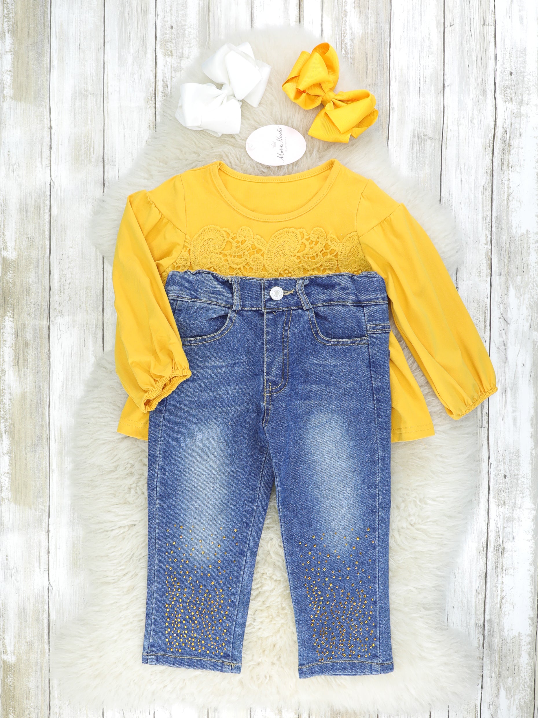 This mustard outfit is a must have on our list! This outfit features a mustard peplum top with lace details & denim pants with rhinestone details.