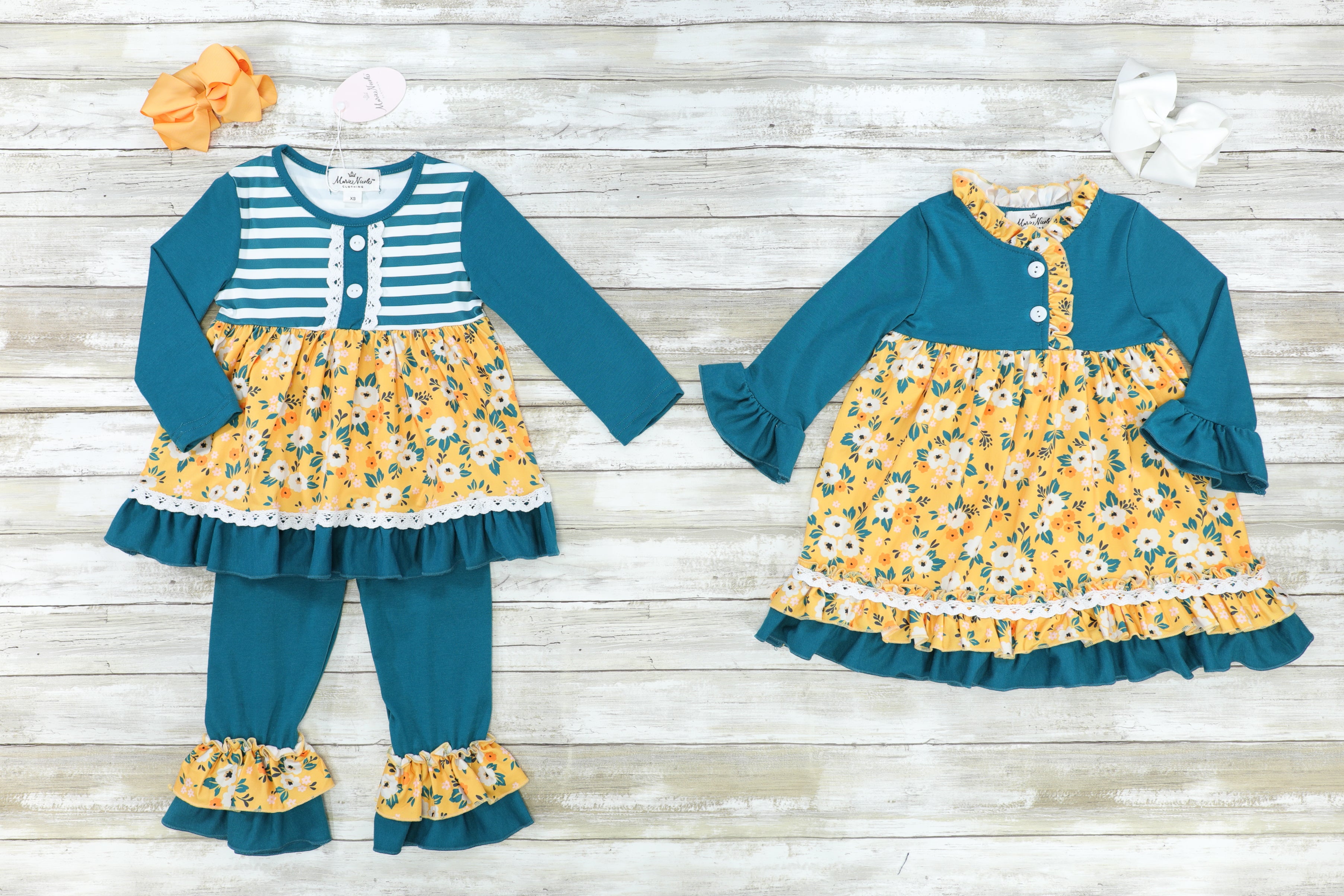 The cutest sibling set for all the kiddos! This floral dress features functional buttons & sweet layered ruffles.