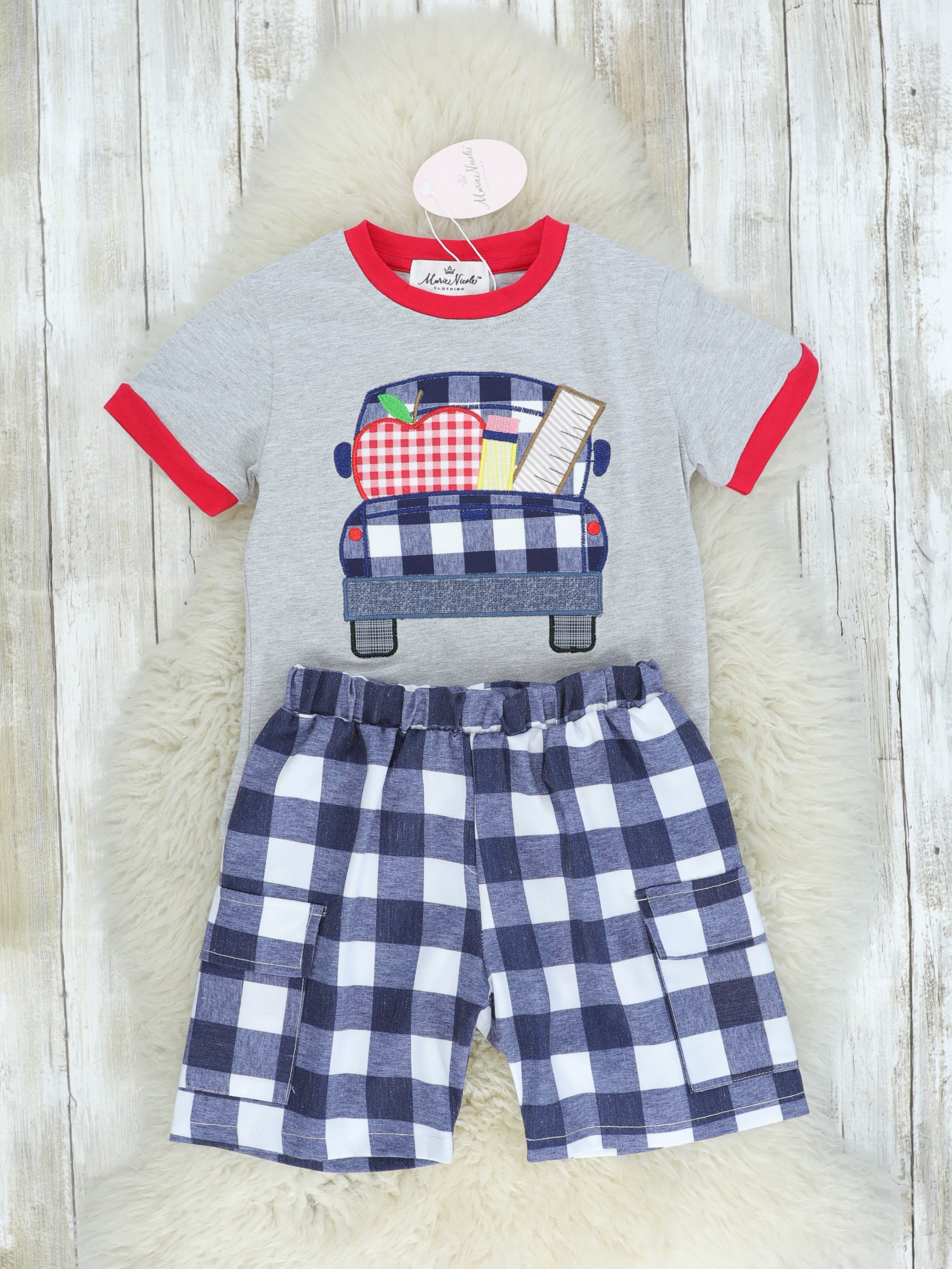 School supplies ☑️, cute outfit ☑️ This outfit features a white and navy check bus with school supplies appliqué, red trim on the neckline and sleeves and matching white and navy cargo pocket shorts.