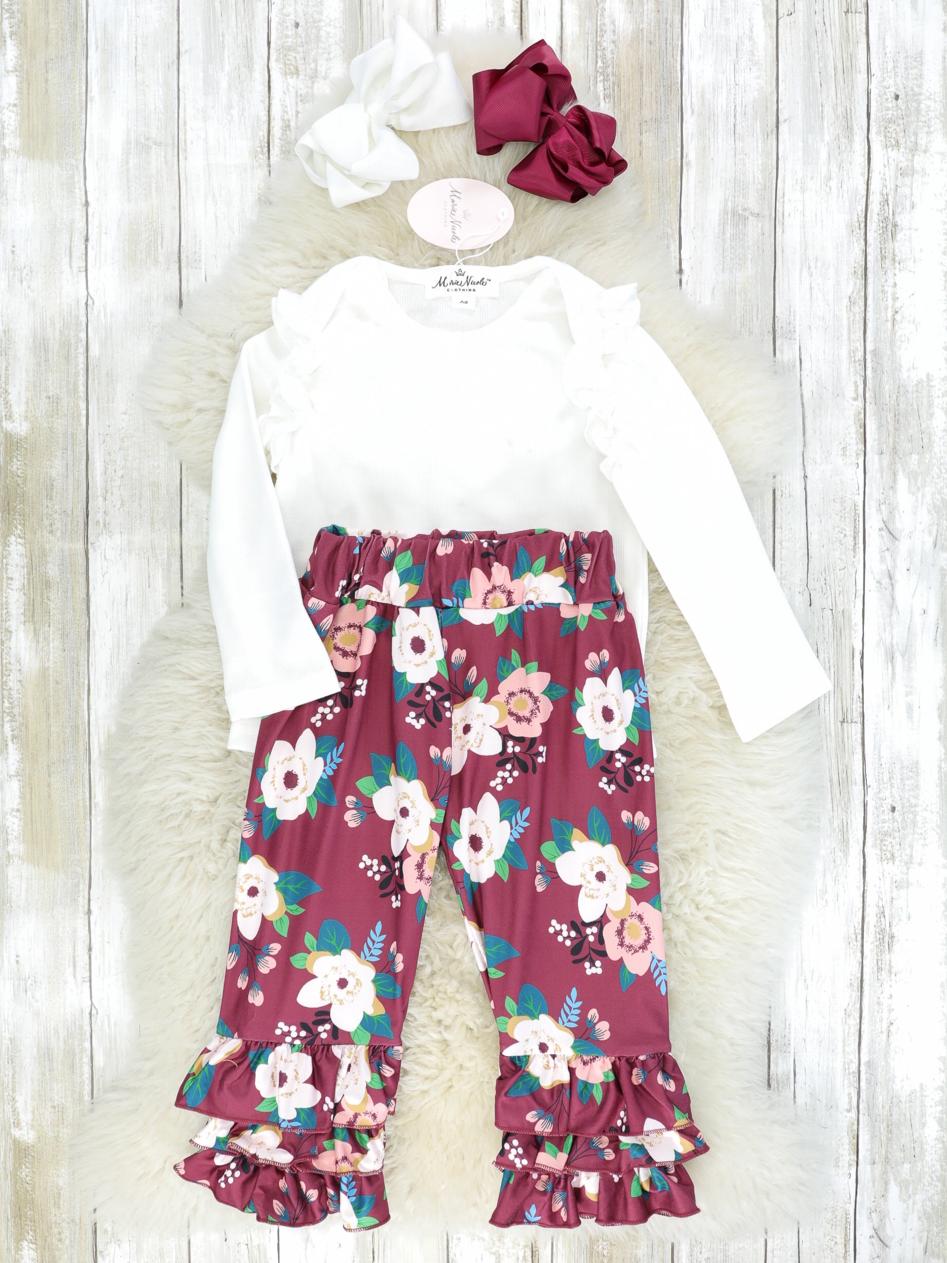 A darling outfit for your dainty girls! This outfit features a white ruffle top & burgundy floral bottoms with ruffles at the ankles. The perfect outfit for comfortable, everyday wear!