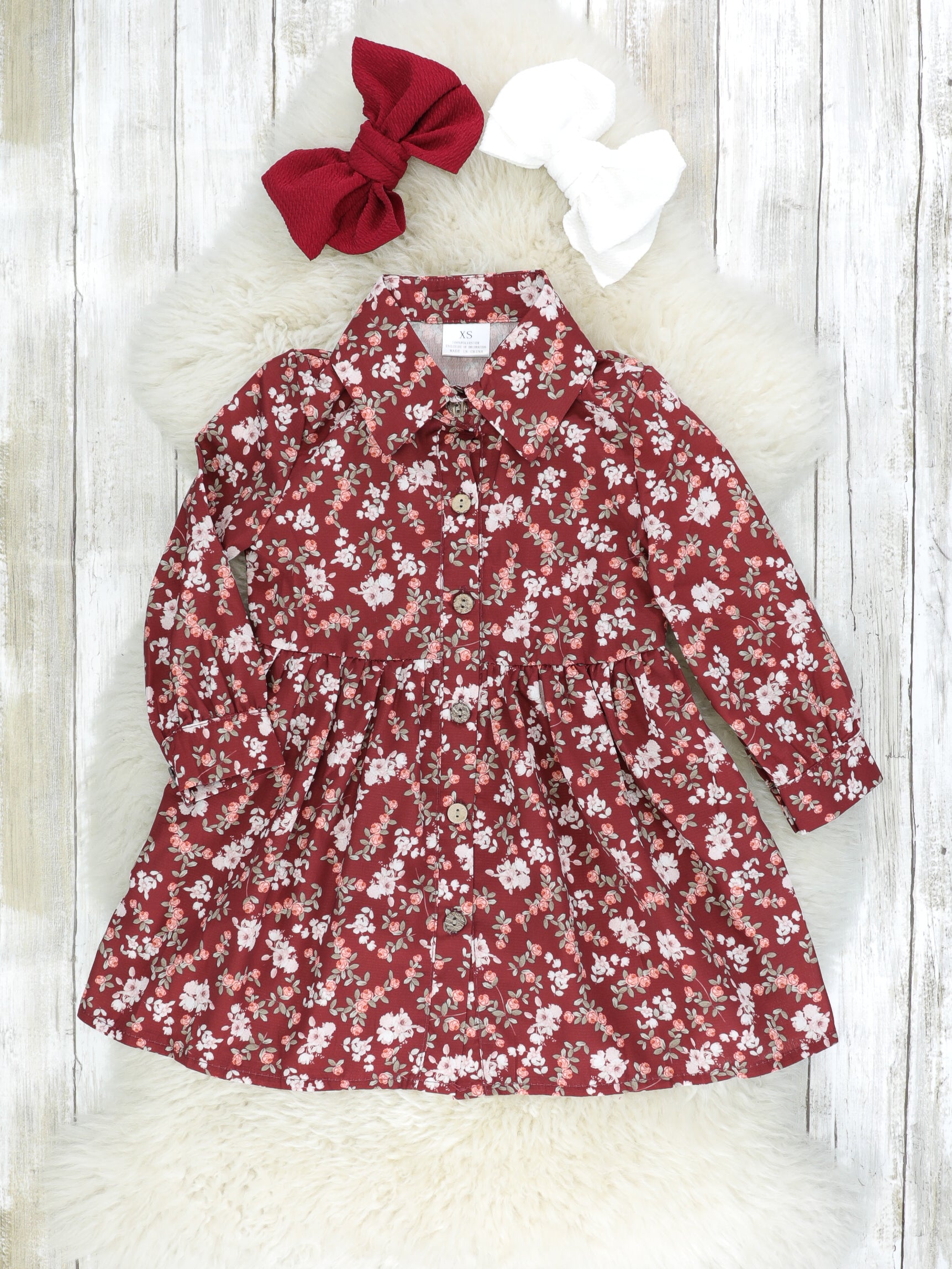 Maroon Floral Button-Up Dress - Pre-Teen & Littler Girl