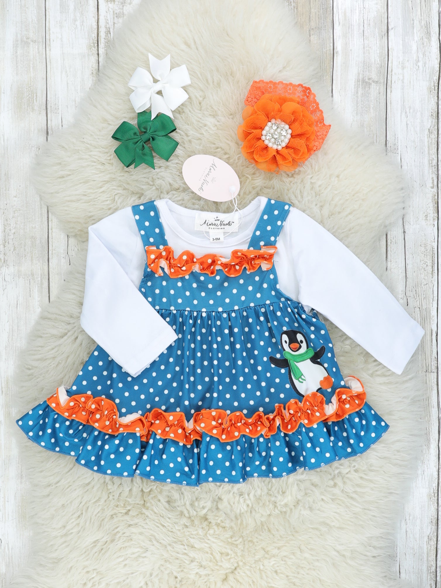 Blue Polka Dot Penguin Dress W/ White Shirt