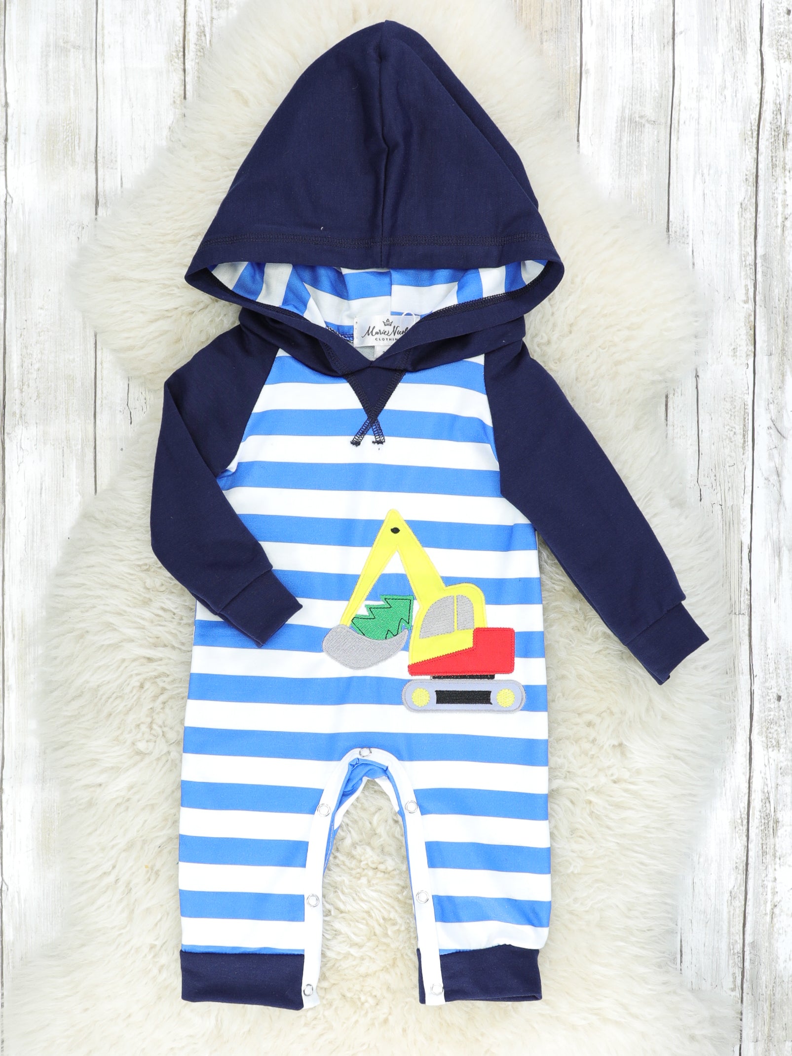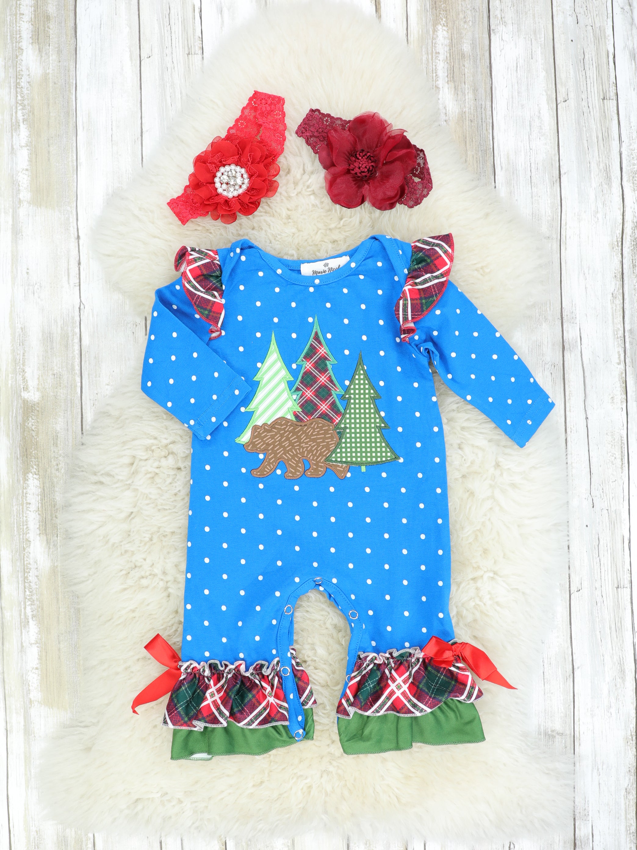 Blue Gingham Christmas Tree Truck Raglan Romper