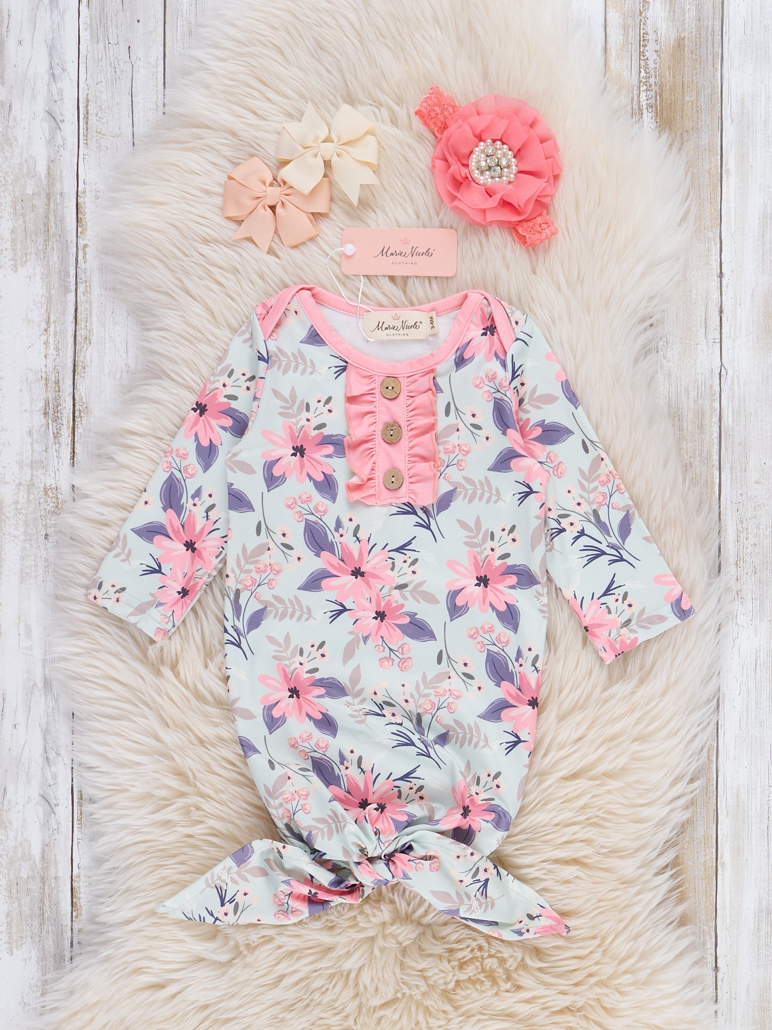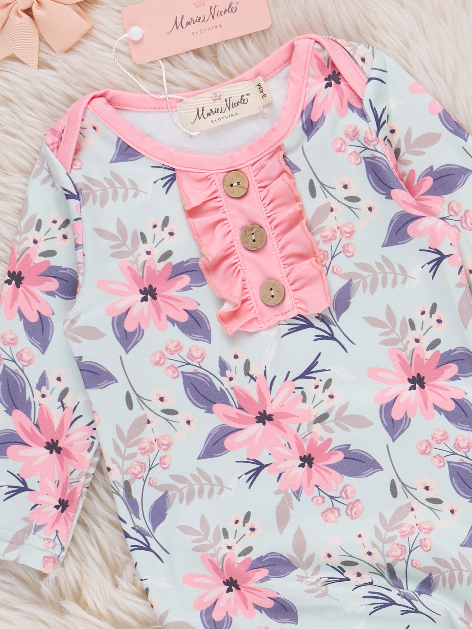 The Pinky Blooms Knot Gown by Marie Nicole features a sweet floral print on a long-sleeve gown silhouette with a knotted bottom for easy diaper changes and cozy comfort. It includes a decorative button placket and contrasting trim details, blending charm and practicality perfectly for nighttime wear.