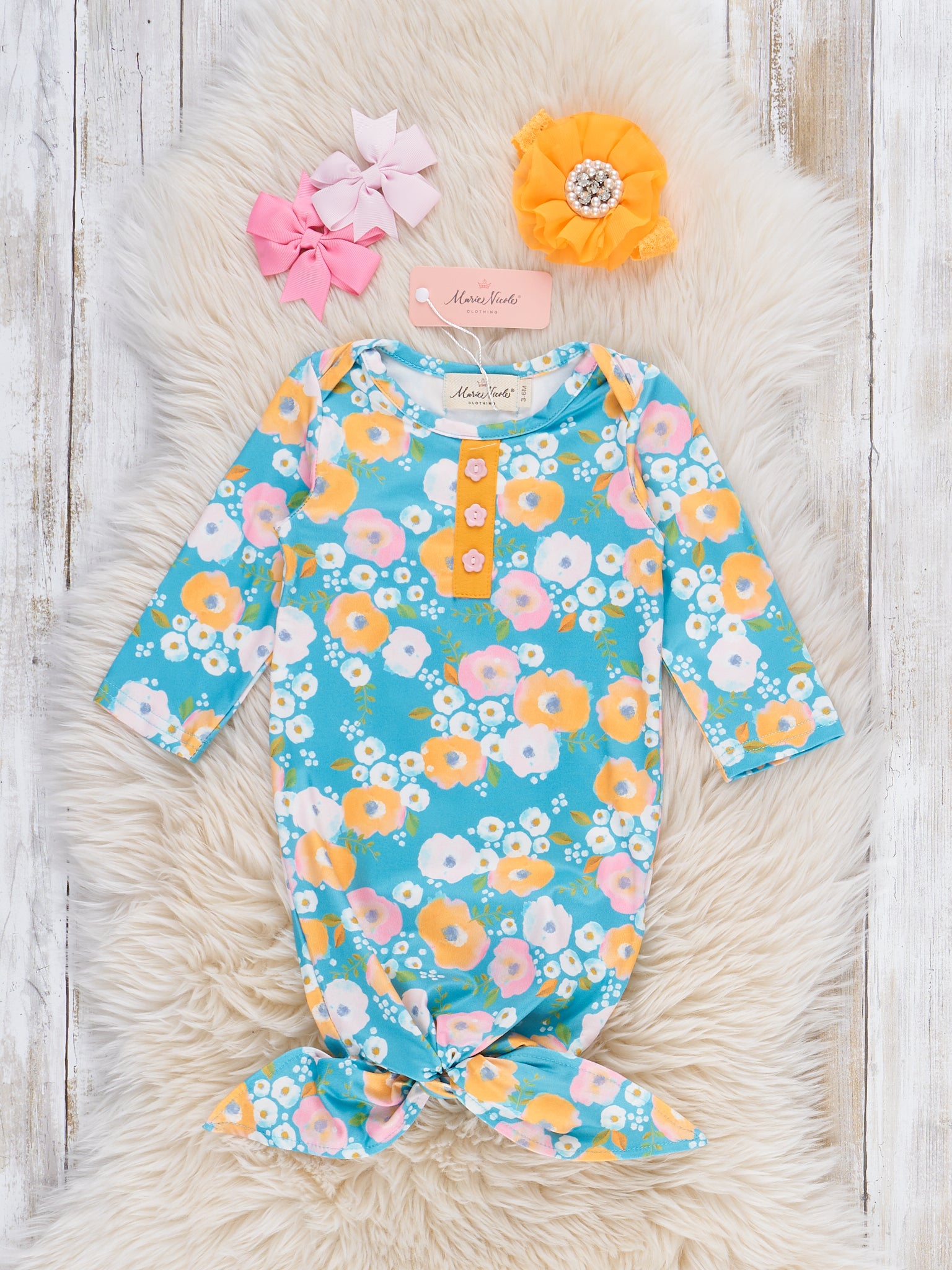 The Sunshine & Daisies Knot Gown by Marie Nicole features a charming floral pattern with a long, knotted bottom for easy overnight changes. With long sleeves and decorative button details, this gown offers a cozy and comfortable fit.