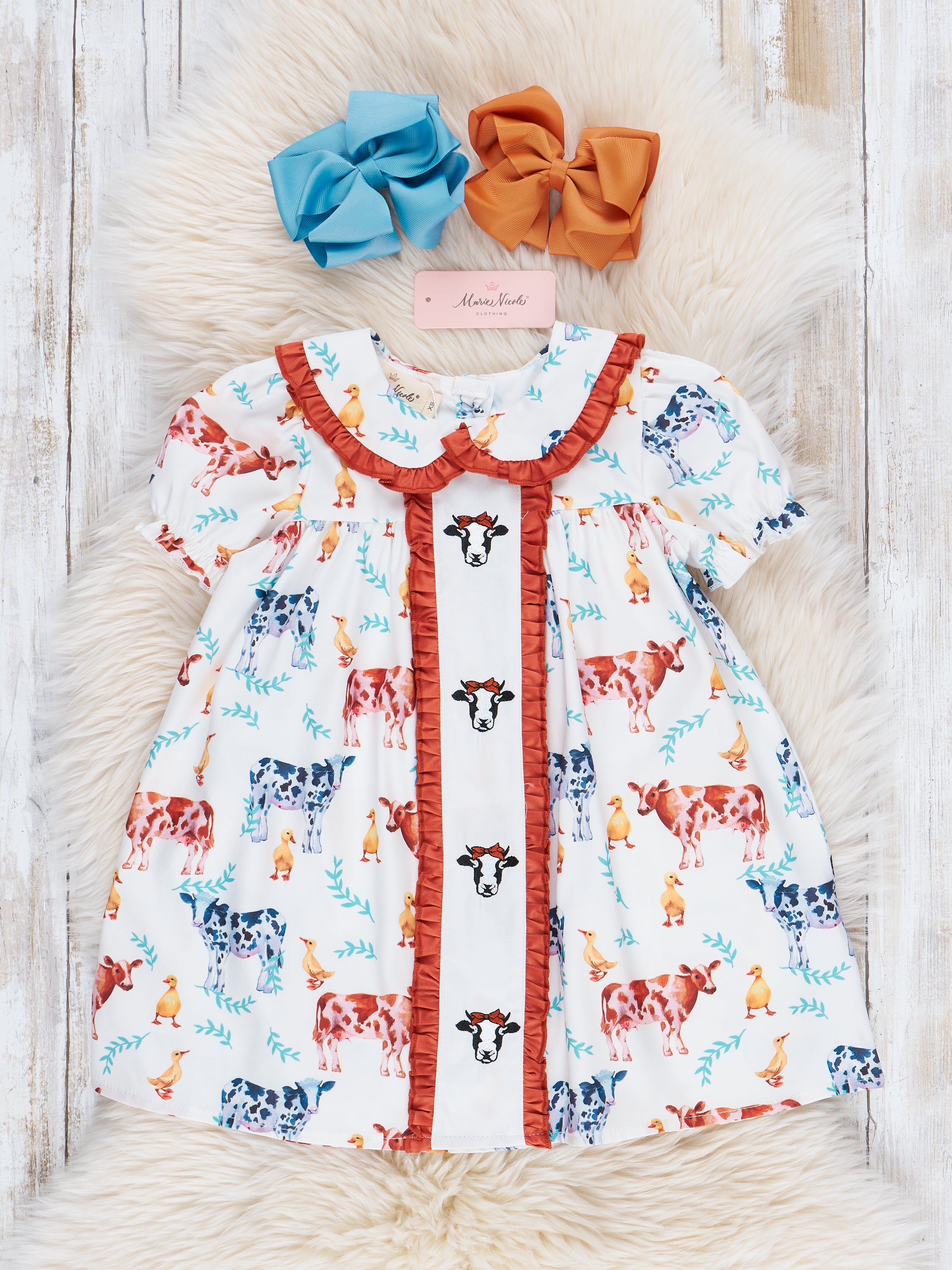 Cream & Bronze Embroidered Cow Ruffle Dress