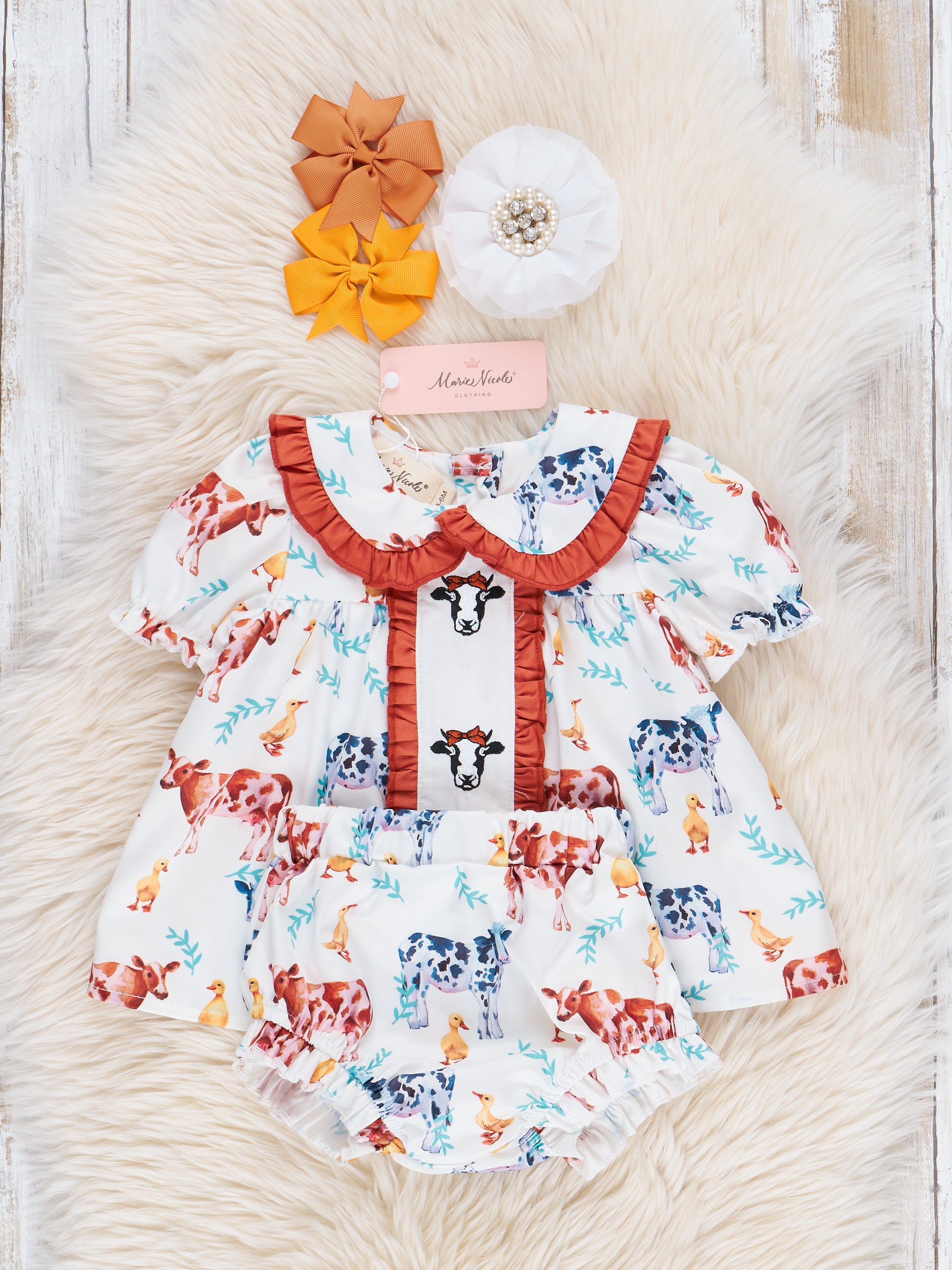 Cream & Bronze Embroidered Cow Ruffle Bloomer Outfit
