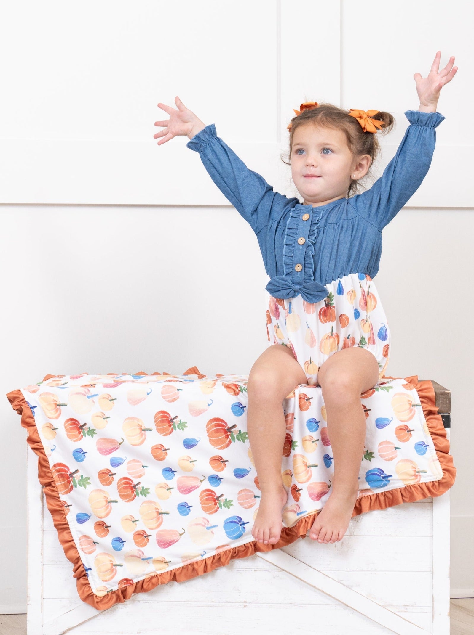 Introducing MNC x LOVE's fall collection: Party Pumpkins! This collection is inspired by the breathtaking hues of autumn. Embrace the charming pumpkin details in shades of vibrant orange, golden yellow, and serene blue. This Party Pumpkins Chambray Bubble Romper is the perfect outfit for any fall occasion. It has cute wooden buttons, cinched sleeves, a cozy chambray top, and a non-functioning but adorable bow detail - all topped off with some party pumpkins details!