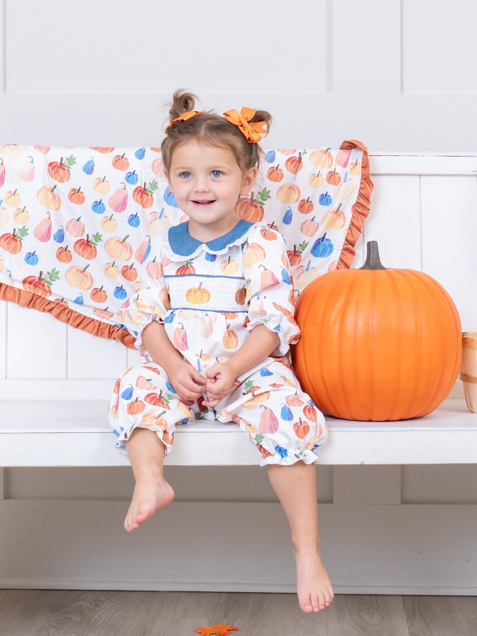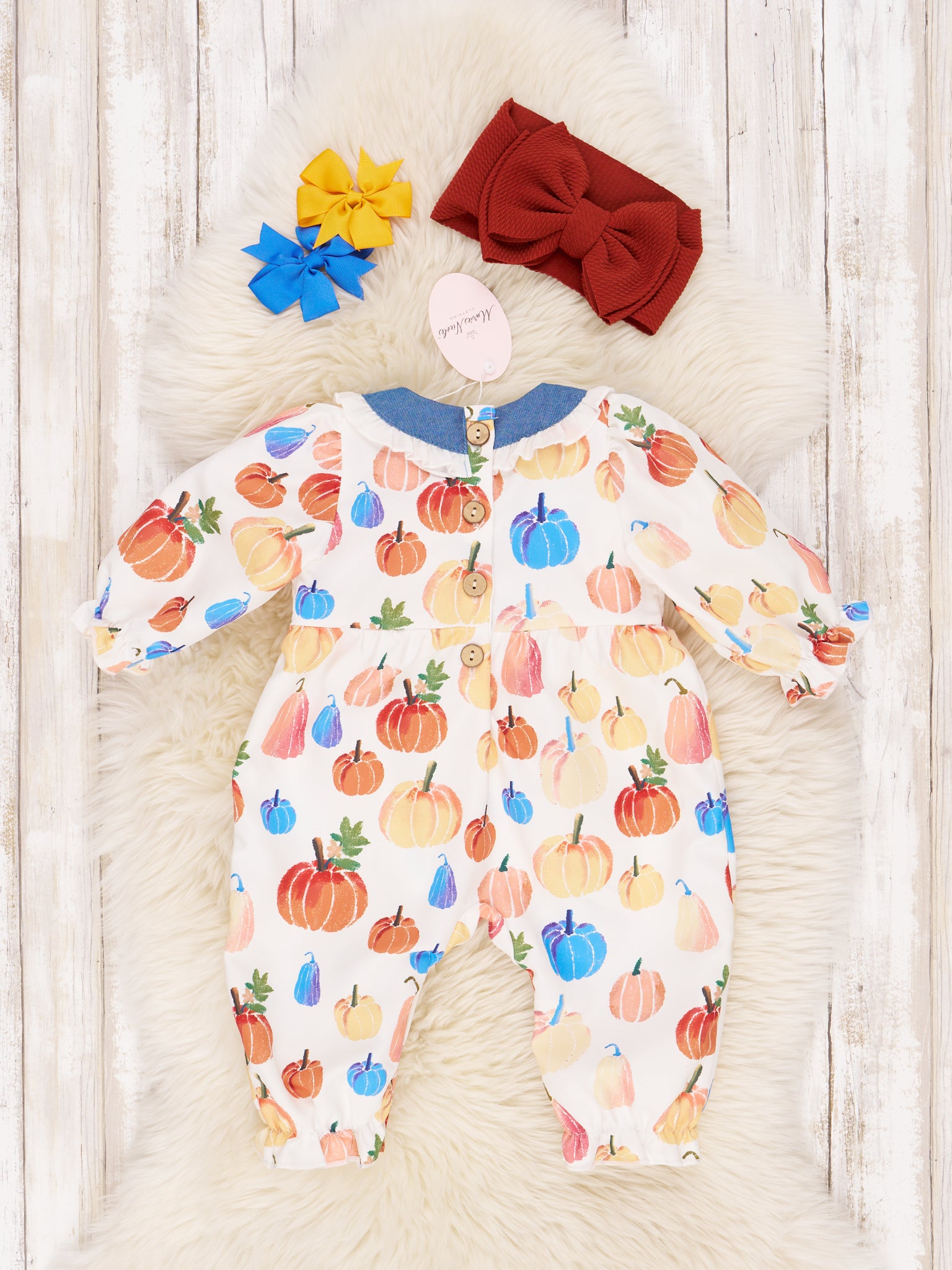 Introducing MNC x LOVE's fall collection: Party Pumpkins! This collection is inspired by the breathtaking hues of autumn. Embrace the charming pumpkin details in shades of vibrant orange, golden yellow, and serene blue. This Party Pumpkins Chambray Ruffle Romper has all the style your little one needs - complete with a Peter pan collar, smocking with embroidered pumpkin details, and functioning wooden buttons down the back. It's long-sleeved and cinched at the sleeves and ankles for a cozy fall look that'll keep your little one festival-ready!