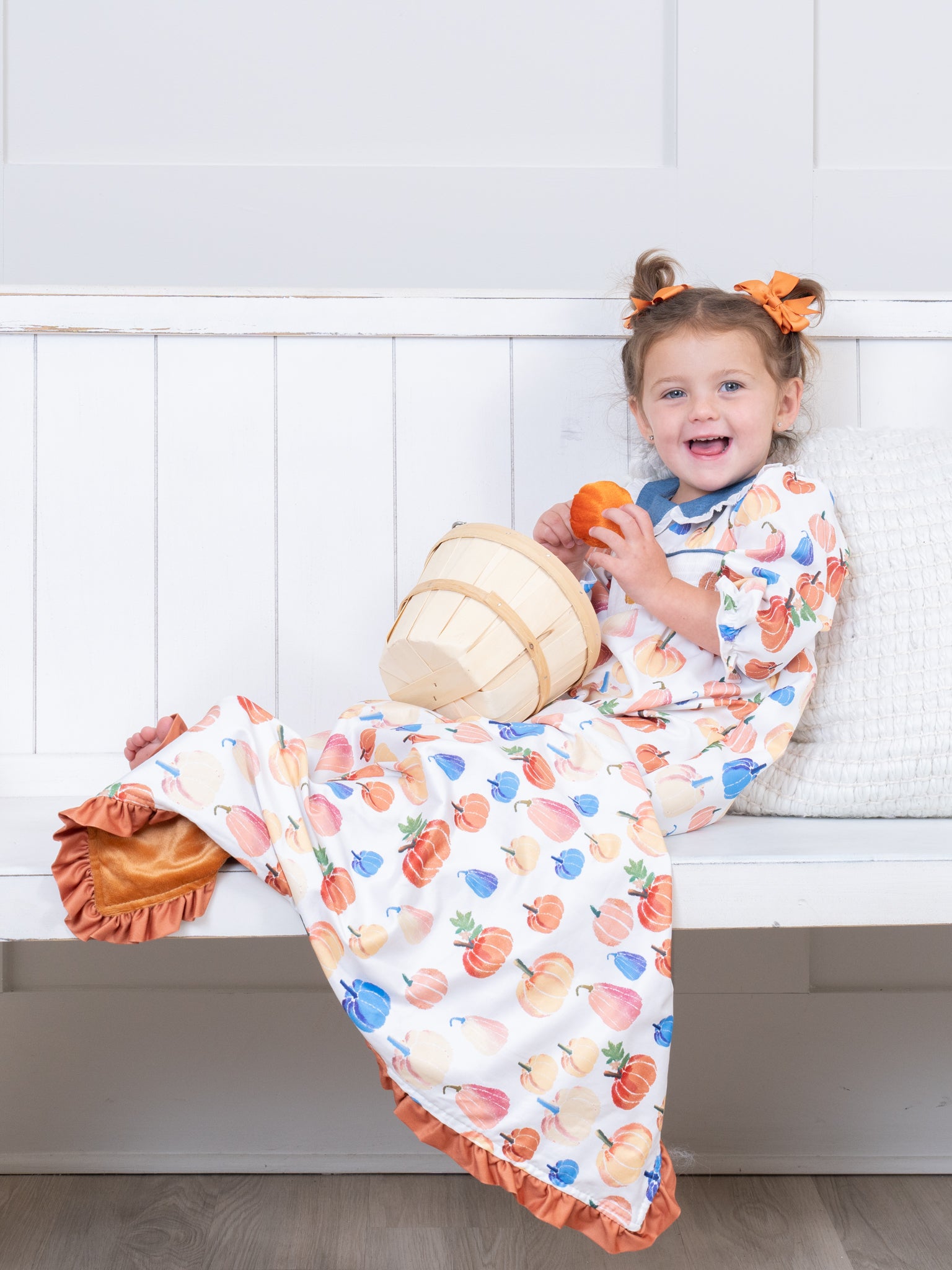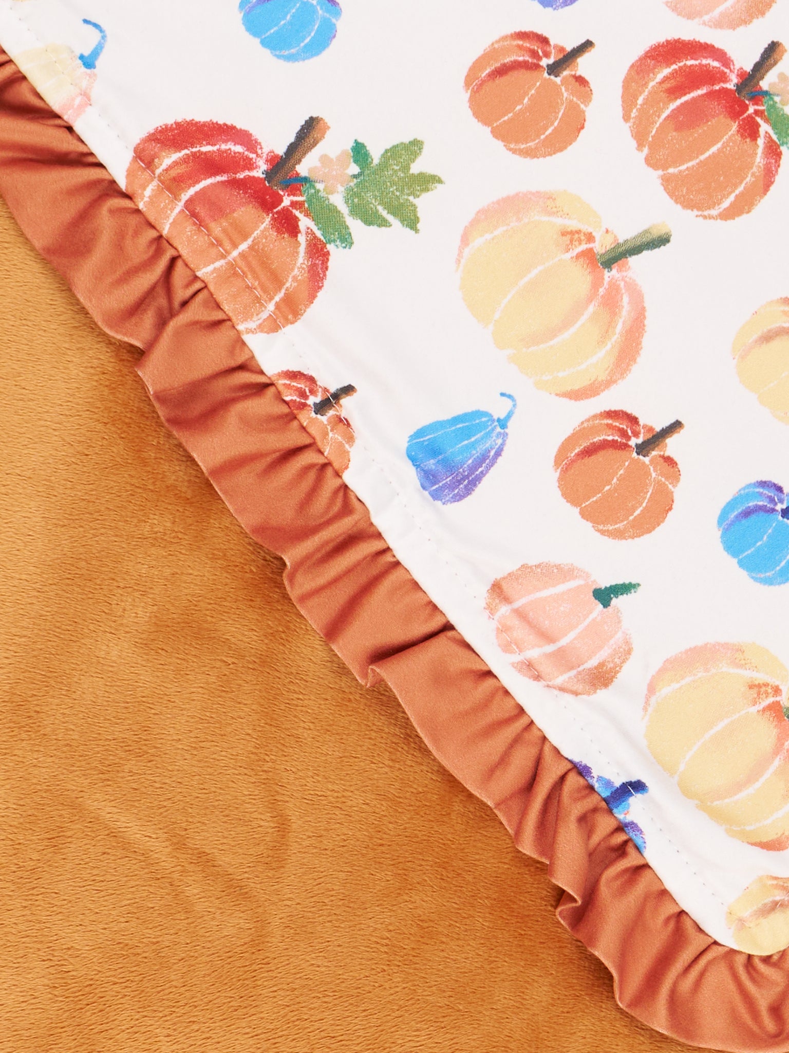 Introducing MNC x LOVE's fall collection: Party Pumpkins! This collection is inspired by the breathtaking hues of autumn. Embrace the charming pumpkin details in shades of vibrant orange, golden yellow, and serene blue. This snuggly minky blanket is designed with our festive party pumpkins pattern and a stylish ruffle hem for extra coziness. Get your hands on this blanket and make every night-in a bit more magical!