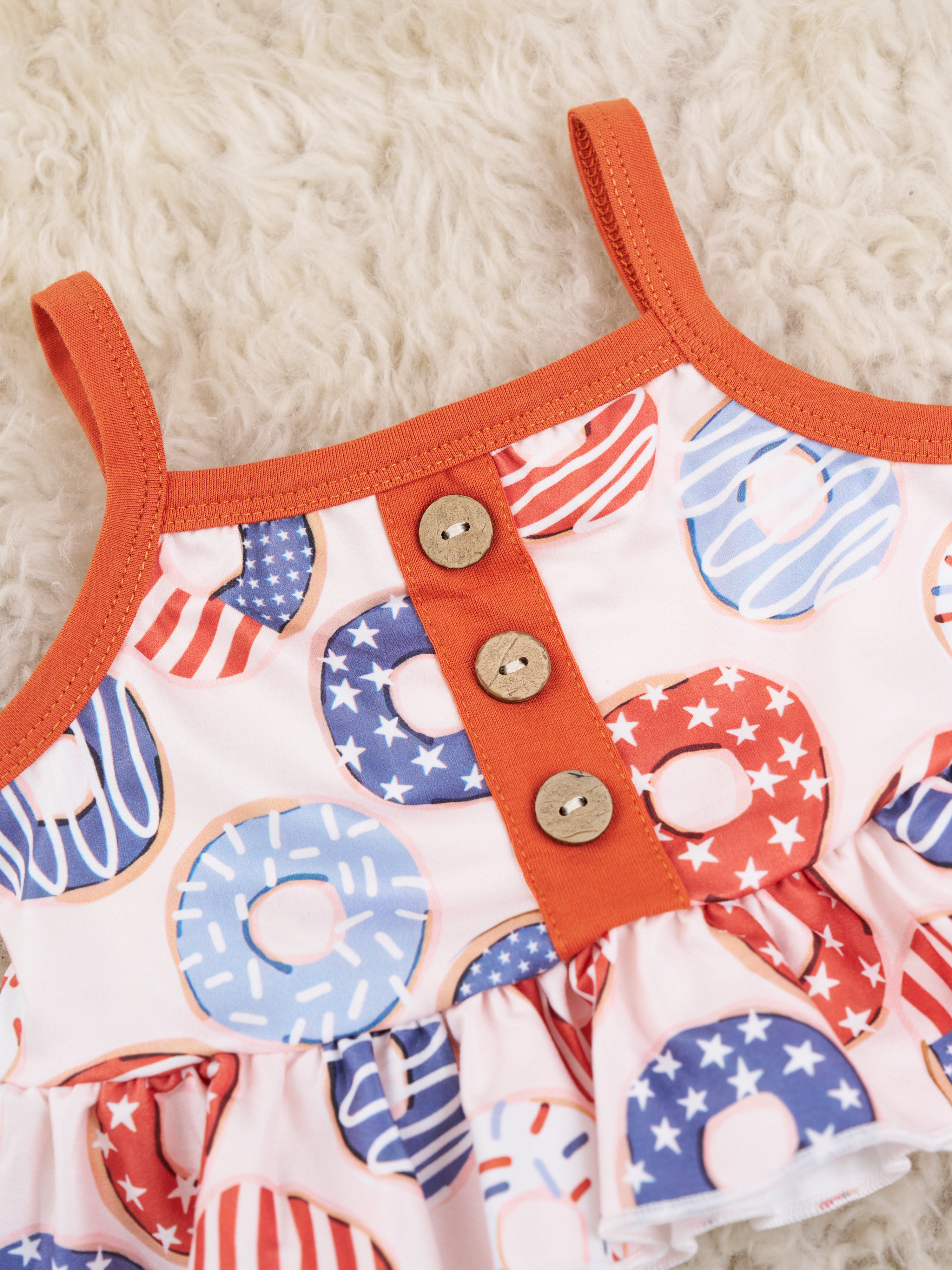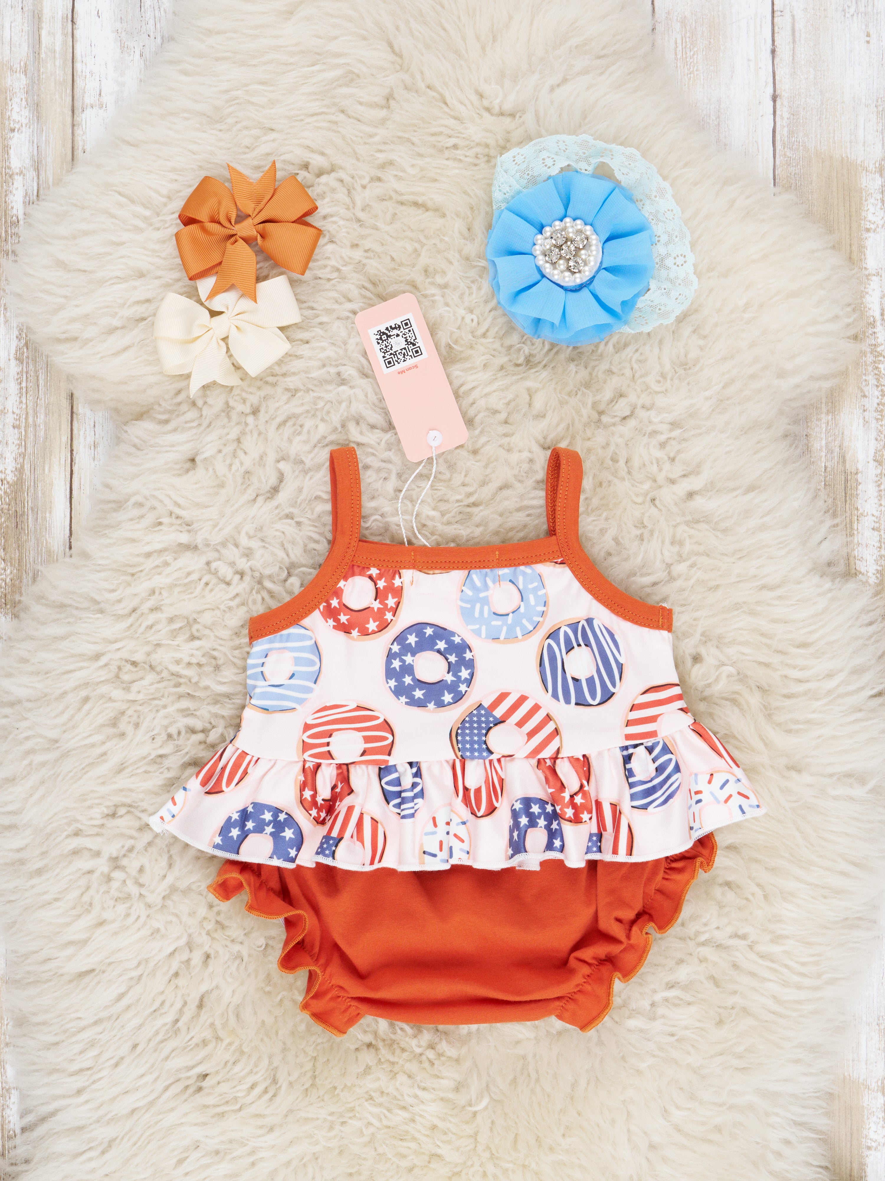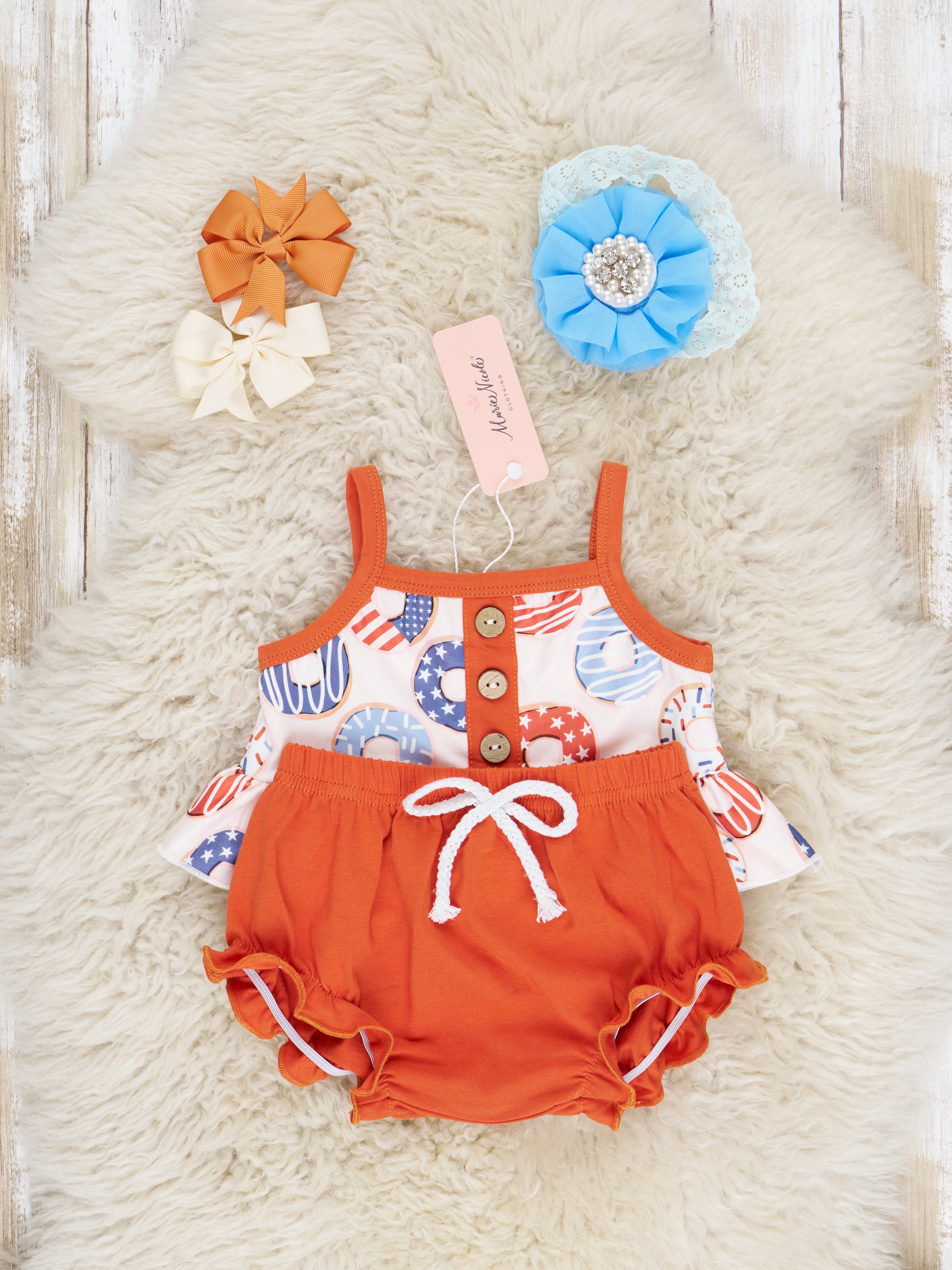 Our Patriotic Donut Ruffle Bloomers Outfit is perfect for showing your stars and stripes! Whether you're a patriot at heart or a true blue donut enthusiast, your kiddos will be star-spangled fabulous. This sibling set is ideal for family photos, fireworks shows, or just a fun day out with the stars of your life!