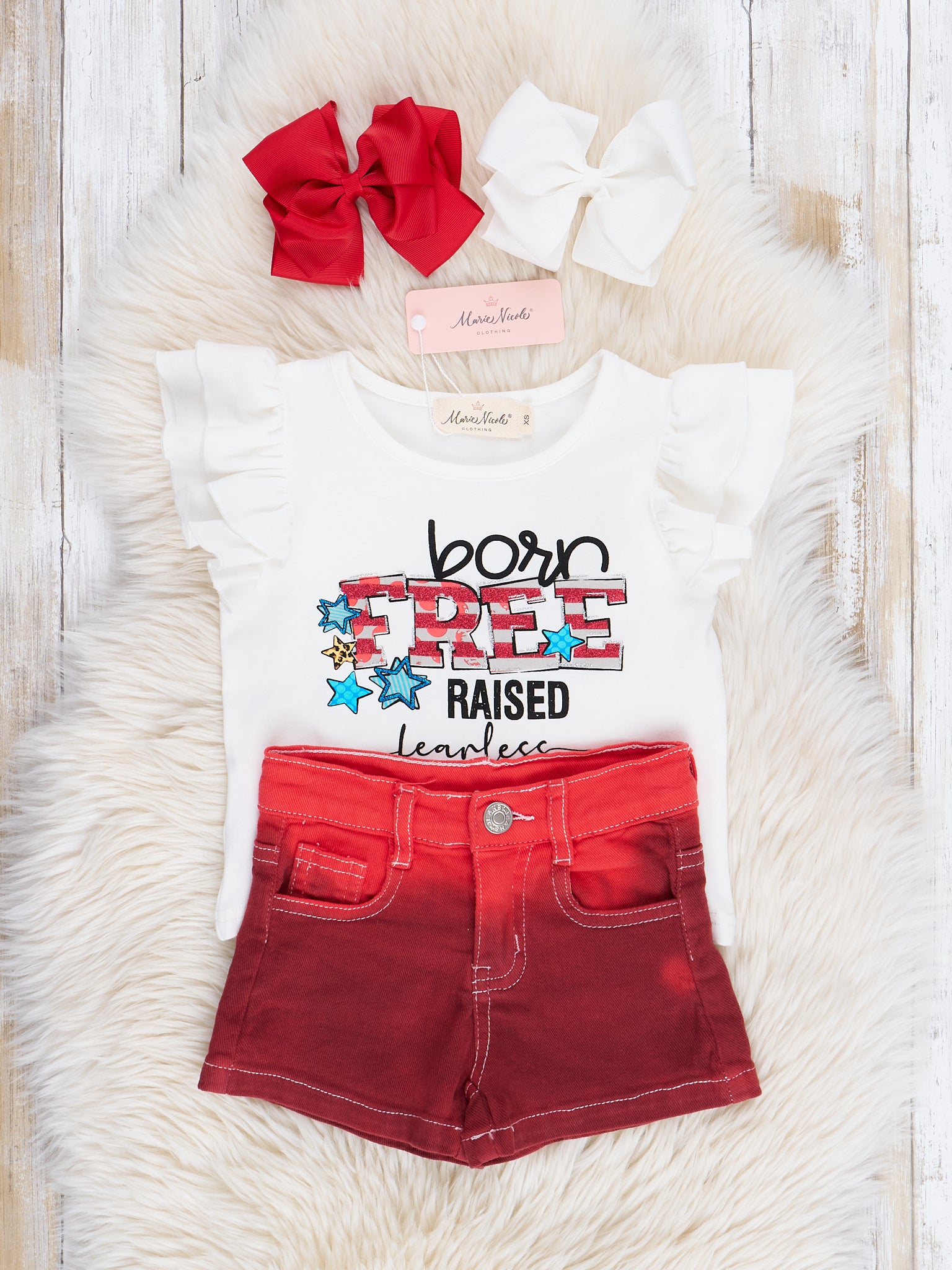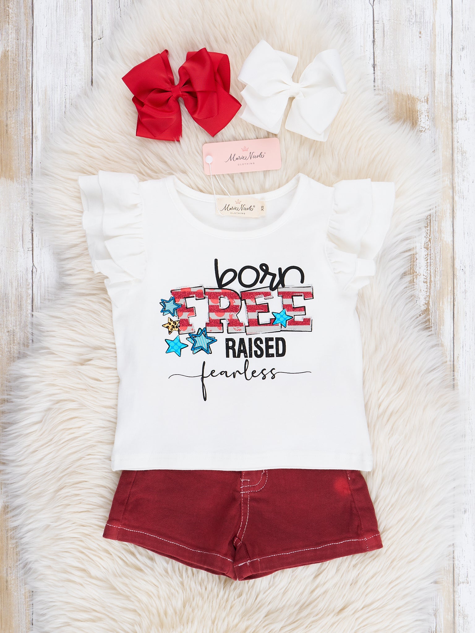 Let your little one express their patriotic spirit with our "Born Free" outfit! Vibrant red and white colors make a bold fashion statement while the phrase "born free, raised fearless" adds a touch of playfulness. Perfect for any occasion, this girls' outfit is as spirited as it is stylish.