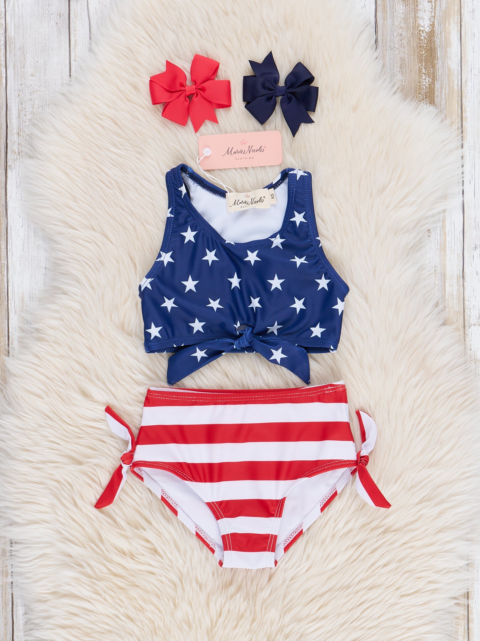 Make a splash this summer with the Mom Me Stars Stripes Tie Swimsuit from Marie Nicole Clothing. This adorable Mom & Me set features a blue stars tie tank-style top and patriotic stripes high waist bottom with a sweet bow detail. Perfect for soaking up the sun at the pool or beach.